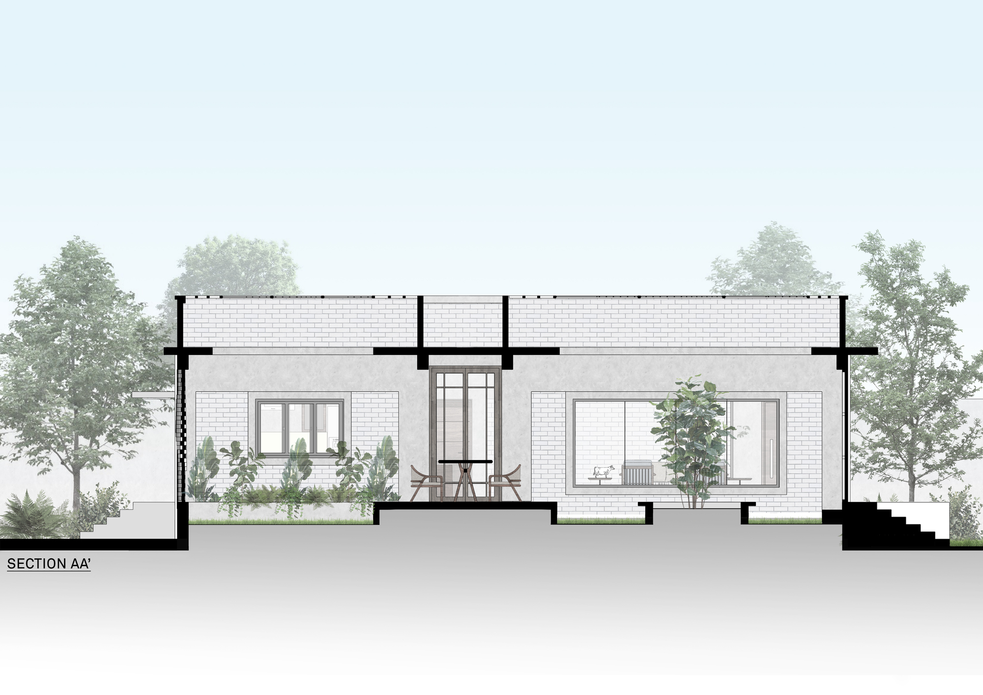 집 가운데를 동서 방향으로 가로지르는 중정 중심 구조로 평면이 계획되었다. 그 한쪽에 거실과 주방이 자리하고, 다른 한쪽에 두 개의 침실을 배치하여 프라이버시를 확보했다. 거실은 중정을 바라다보도록 계획되었다.