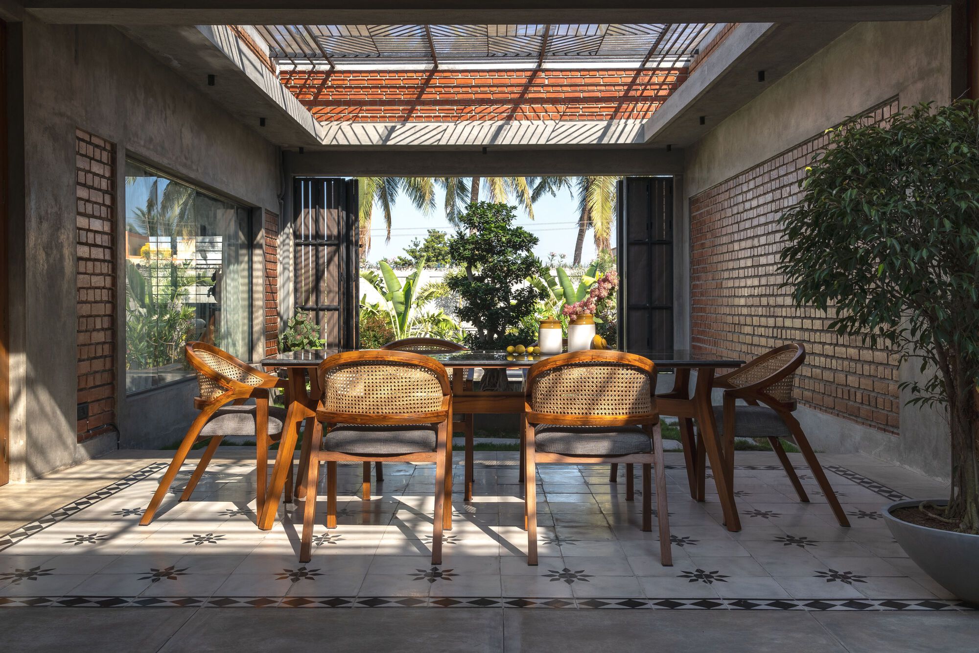 We enter the dining room through a 9 feet wooden and glass door. The use of Athangudi tiles from Karaikudi adds a subtle traditional essence to the space. The courtyard on the west side has an intricate brick parametric wall flanked with tall plants on either side which balances the texture of the exposed brick, concrete, and lush green plants. The positioning of this wall blocks the harsh light from the west. The projection and recession of the bricks create a wave-like pattern with varying light and shadow play throughout the day. The courtyard on the east has a Chinese Ficus tree as the central focus which gives a break from the brutalist brick and concrete aesthetic. The folding gate opens to reveal the lush green lawn and the landscape on site providing endless views from the dining and courtyards. The courtyards create a passive cooling effect throughout the entire house.