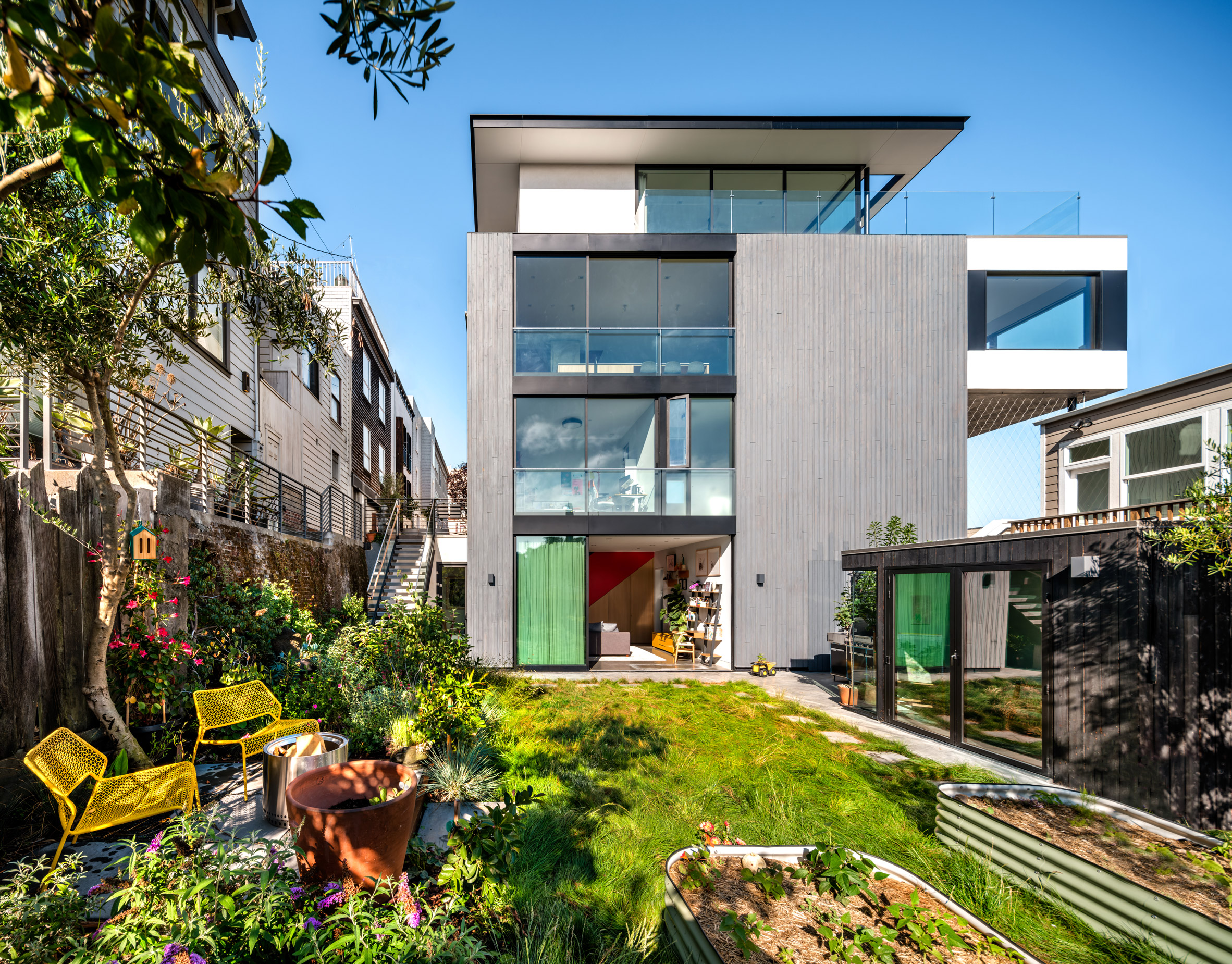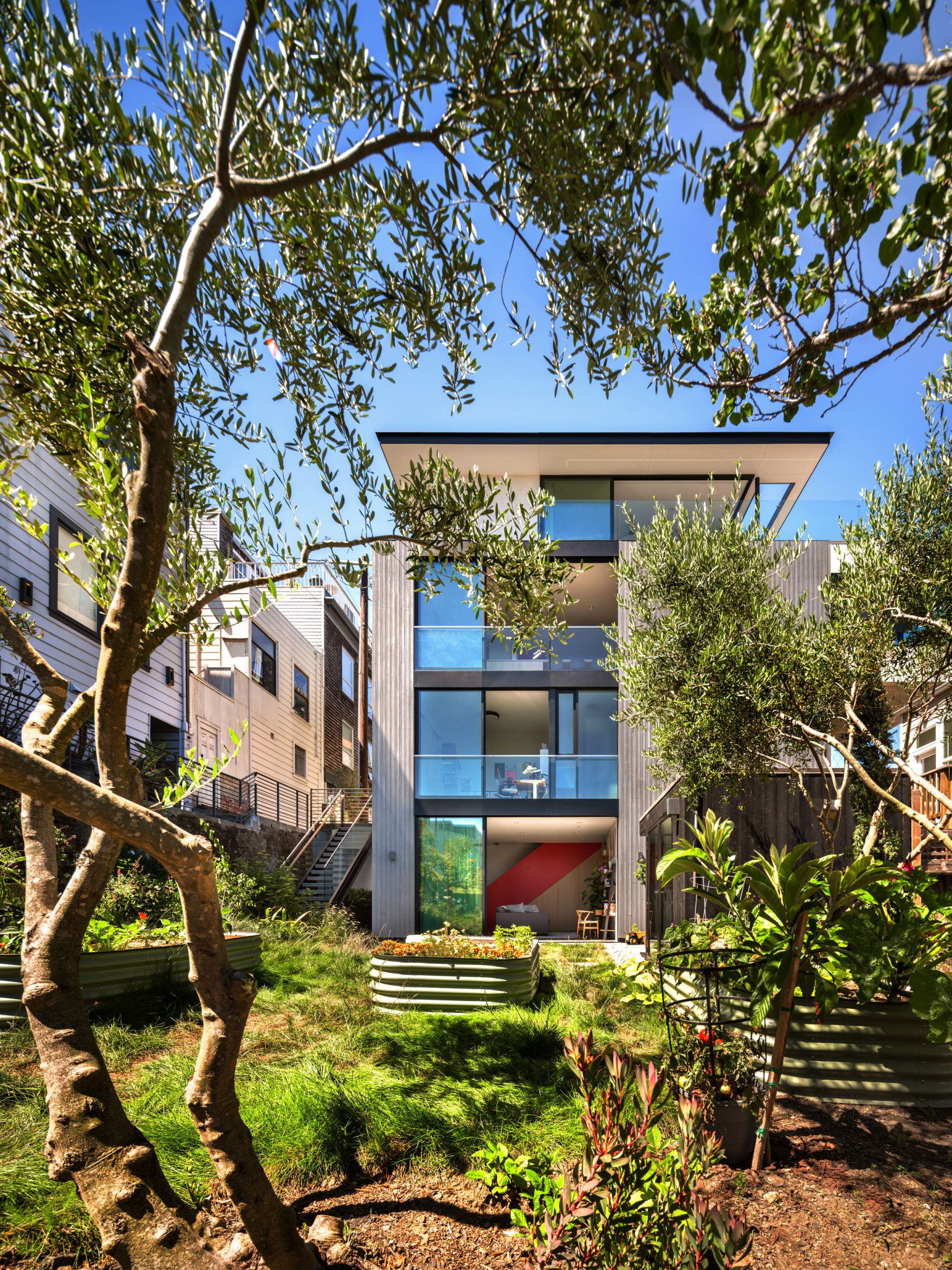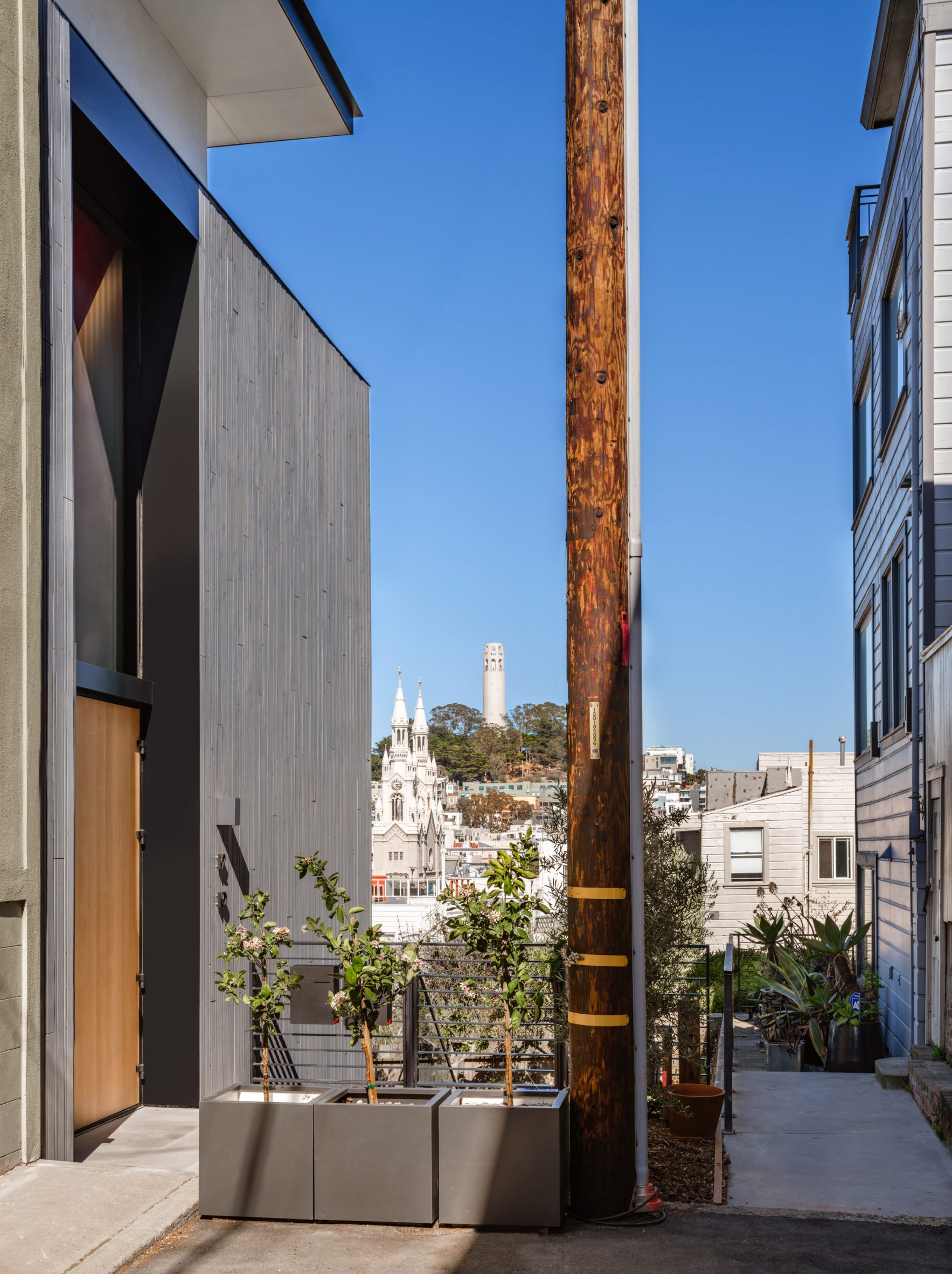 샌프란시스코의 러시안 힐Russian Hill, 그중에서도 자동차 진입이 안 되는 밀집 지역의 골목 끝에 위치한 1900년대 초의 기존 두 가구 주택을, 4층, 3,300제곱피트(약 93평) 규모로 개조한 듀플렉스 하우스이다.