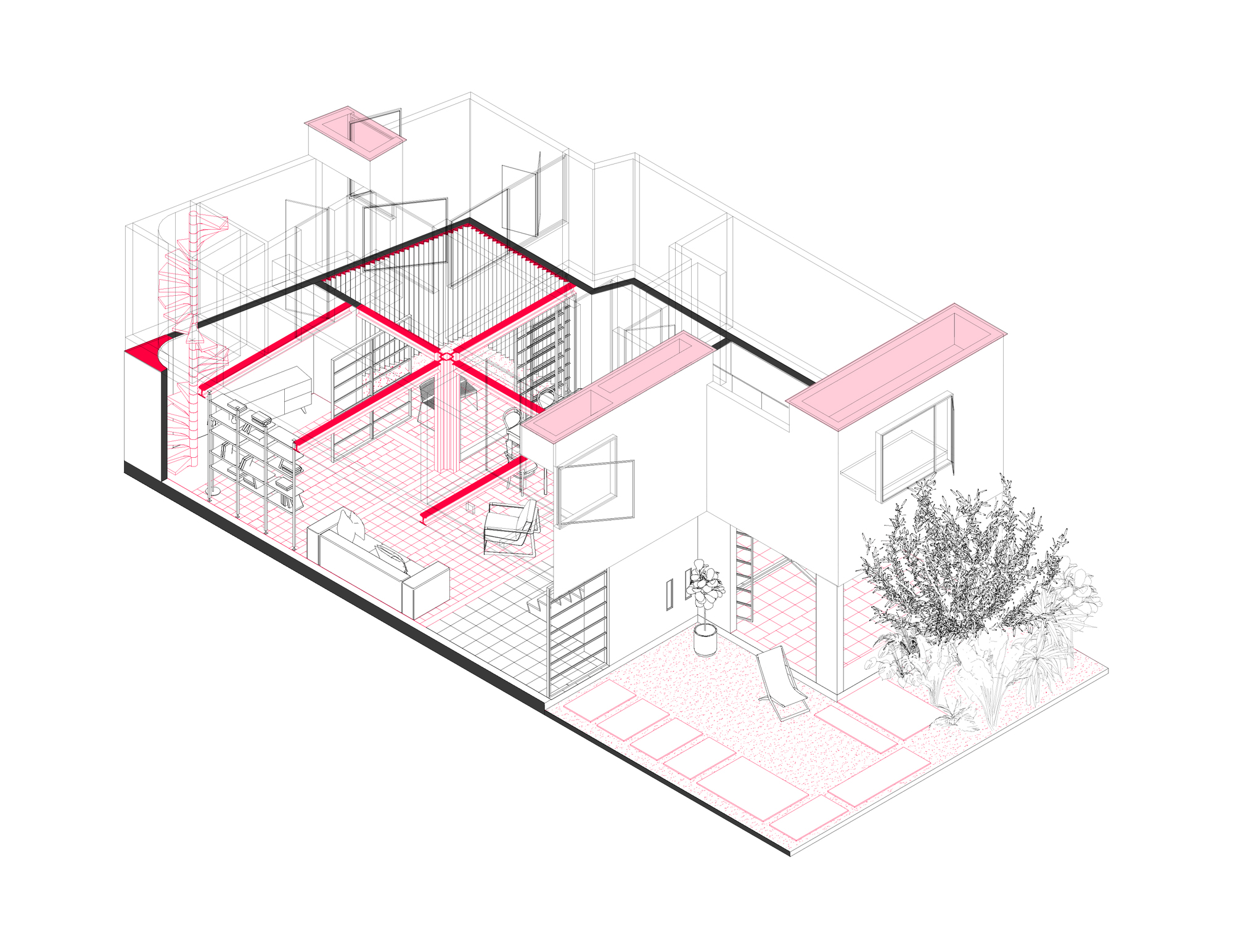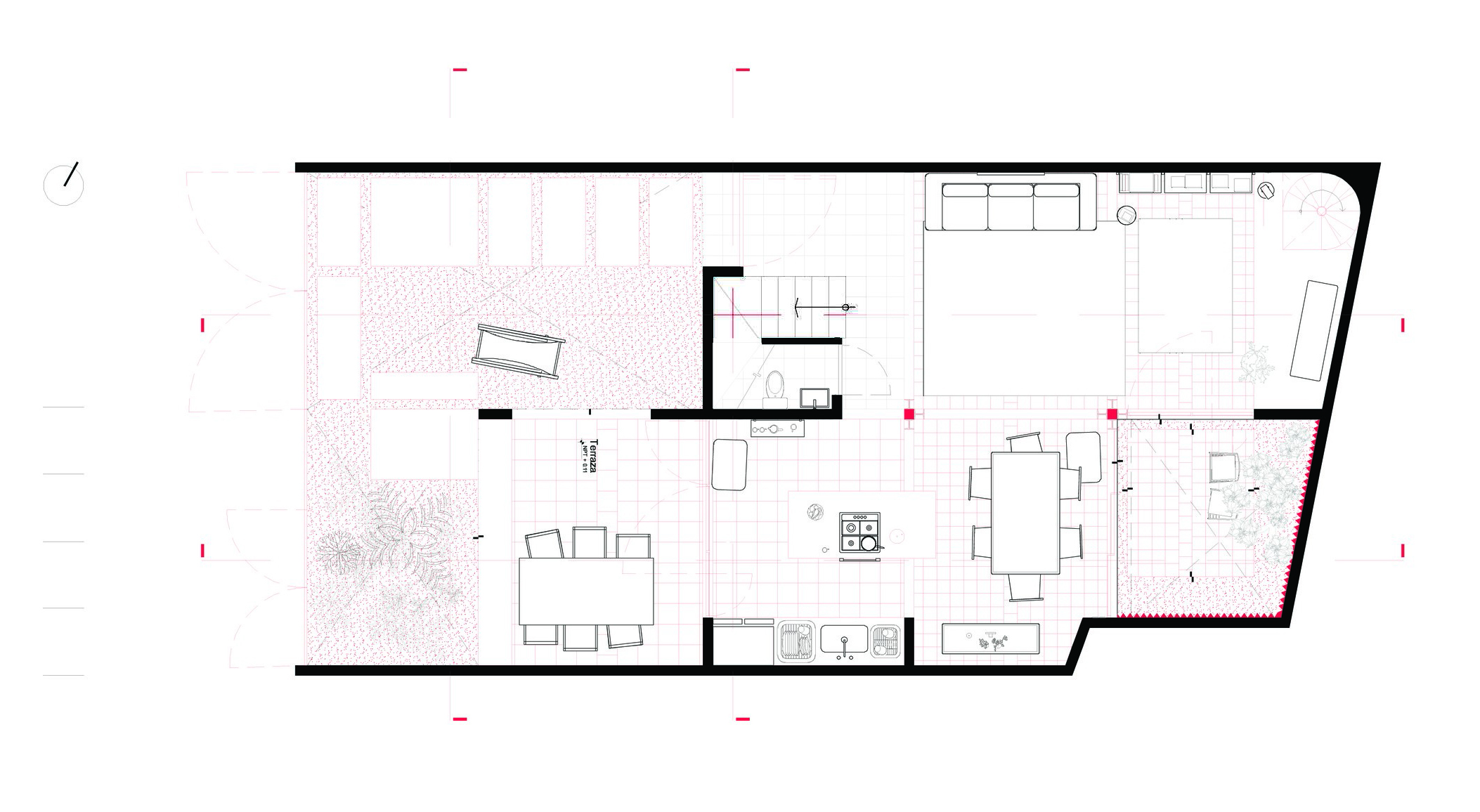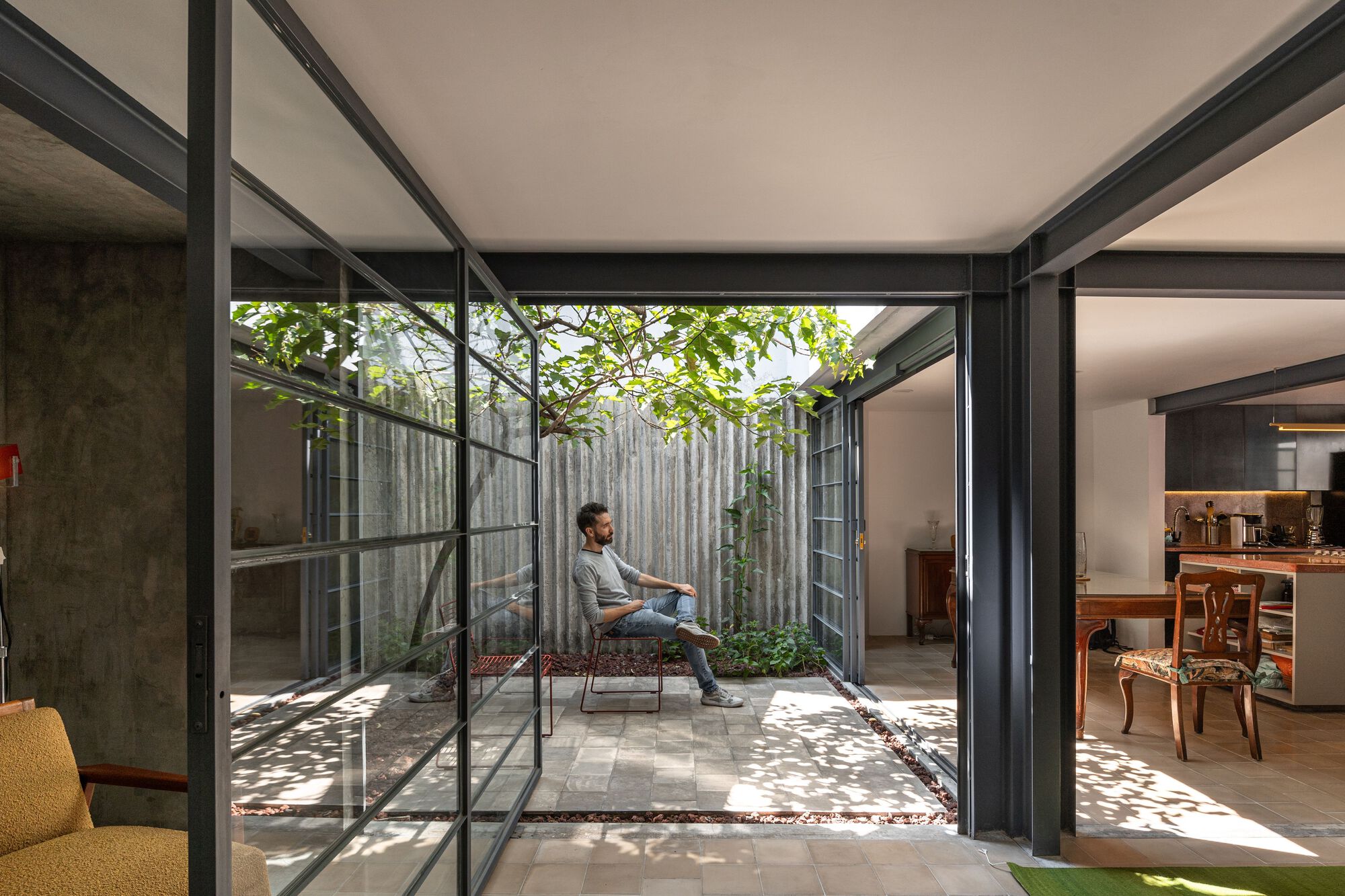 The project arose from the possibility of restructuring the entire ground floor, surgically demolishing three load-bearing walls, and replacing them with cross-shaped steel columns and lintels. These elements gave the rules for the new pasta and terrace floor sections. At the same time, we made very flexible gates in their opening, and transformed the garage and back patio into small natural oases, connecting the ground floor and thus changing its rules of inhabiting.