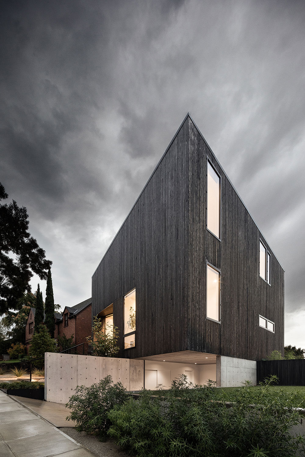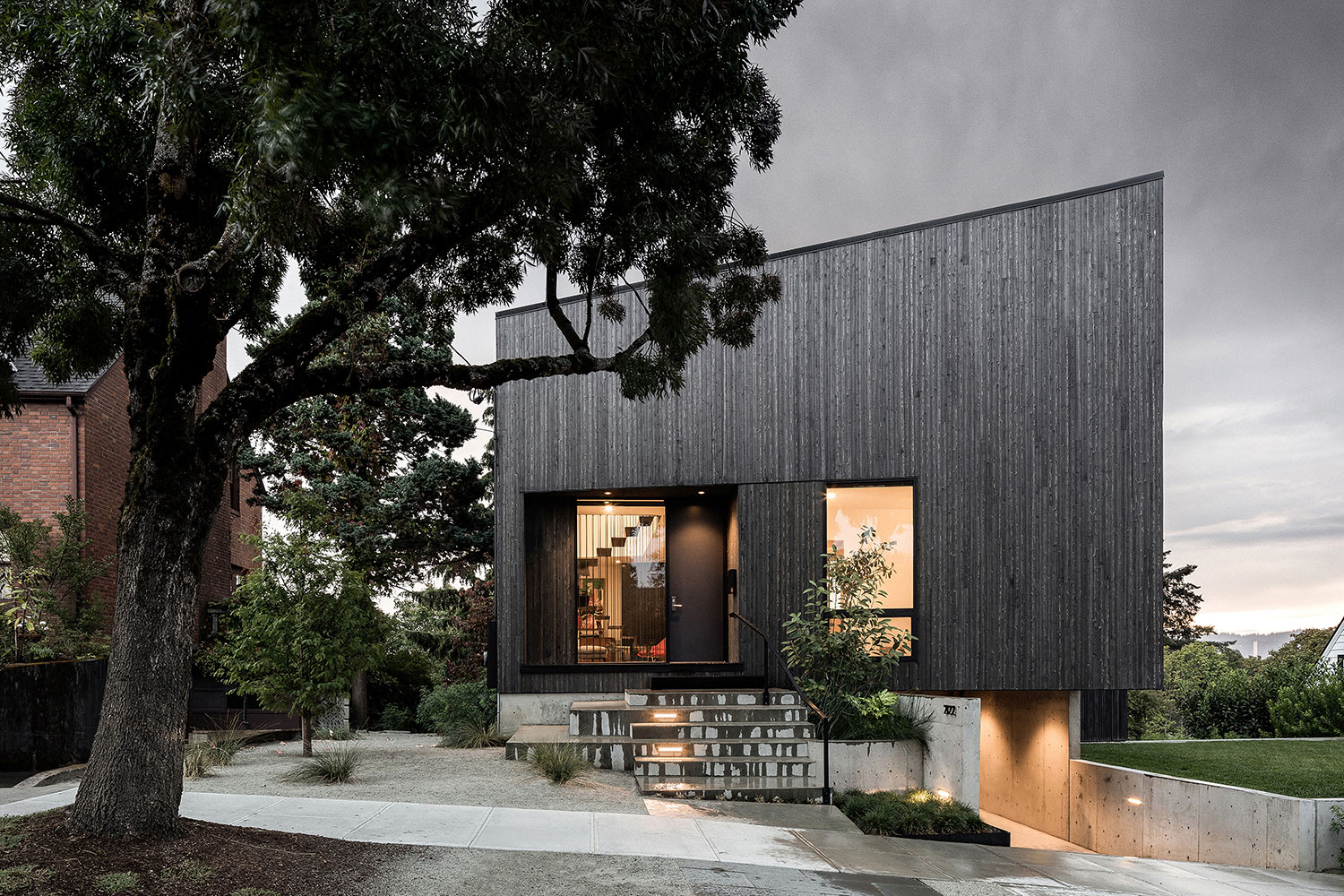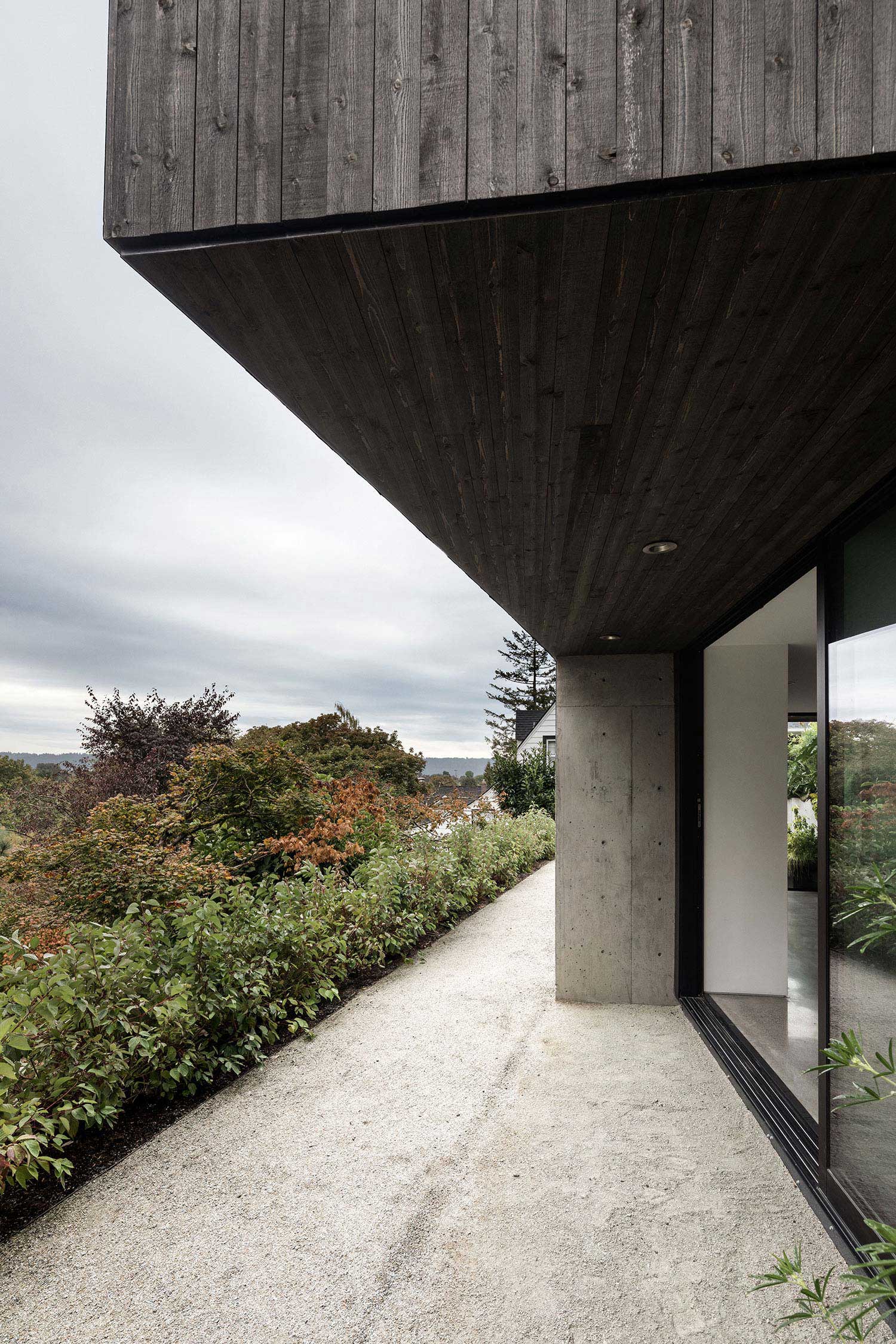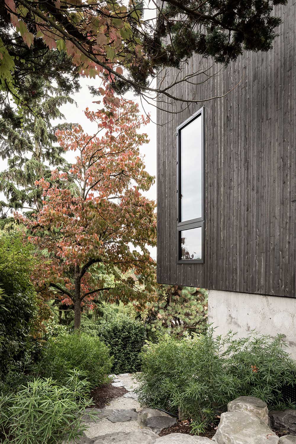 다양한 창을 통해, 이 부지와 인접 부지에 있는 몇 그루의 독특한 큰 나무들을 의도적으로 액자화했다. 그리고 이웃집들과는 대조되는 현대식 외관이지만, 여기에 어두운색을 적용함으로써 나무가 우거진 풍경과 조화를 이루도록 했다.