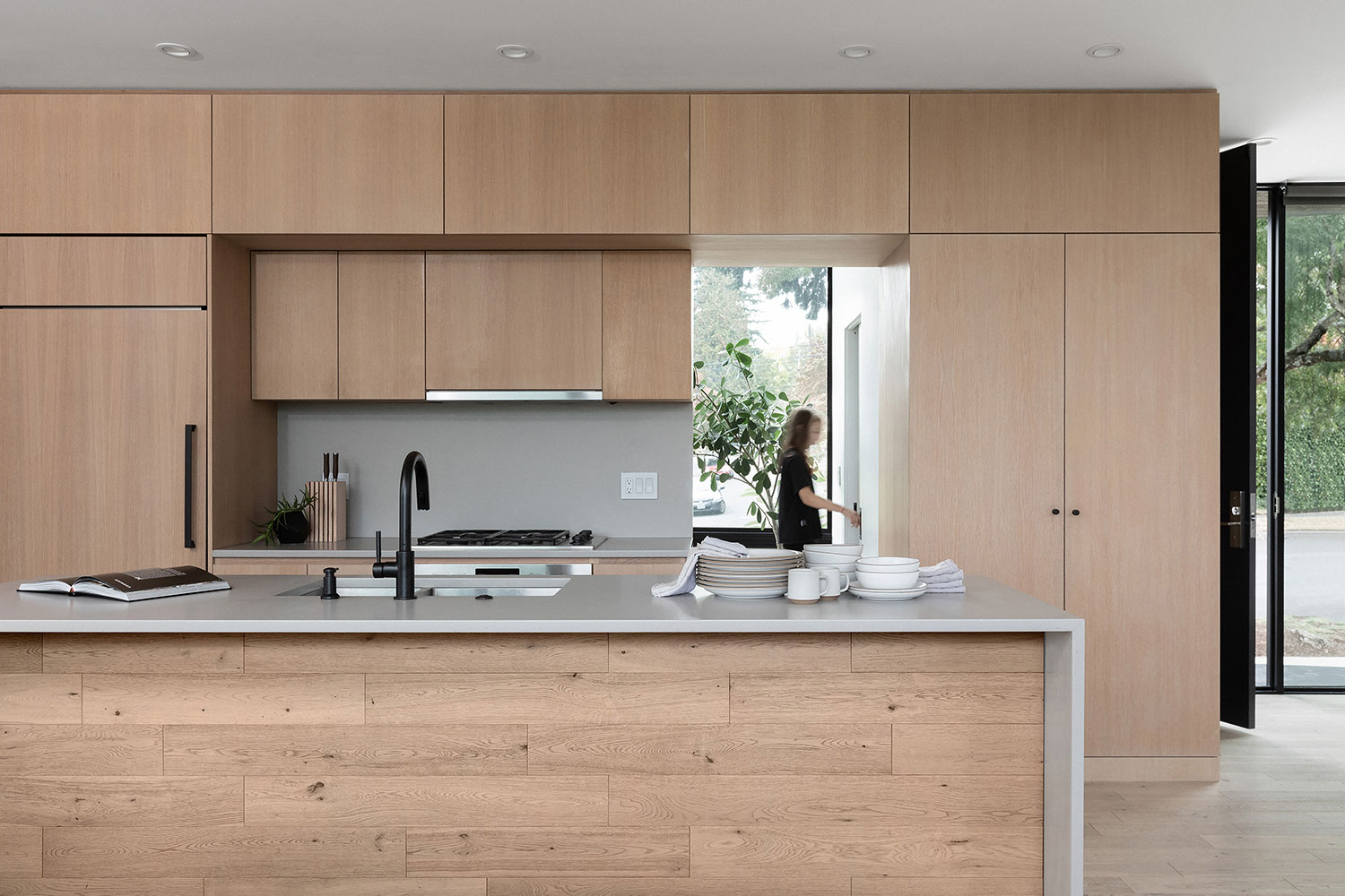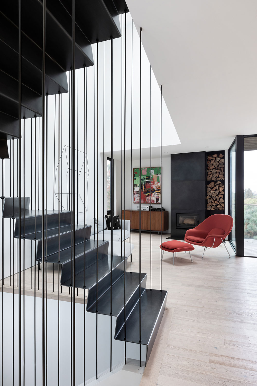 절제된 색상의 재료들이 사용되었다. 내부에는, 콘크리트, 석고판, 화이트 오크 등이 사용되었고, 여기에 검게 칠한 강재로 포인트를 주었다. 외부는, 검은색 창호와 함께 어두운색 삼나무 보드를 세로로 설치하여 마감했다. 한편, 비가 잦은 미국 북서부 태평양 연안 지역 날씨에 에너지 효율적으로 난방을 할 수 있도록, 붙박이식 장작 난로가 설치되었다.