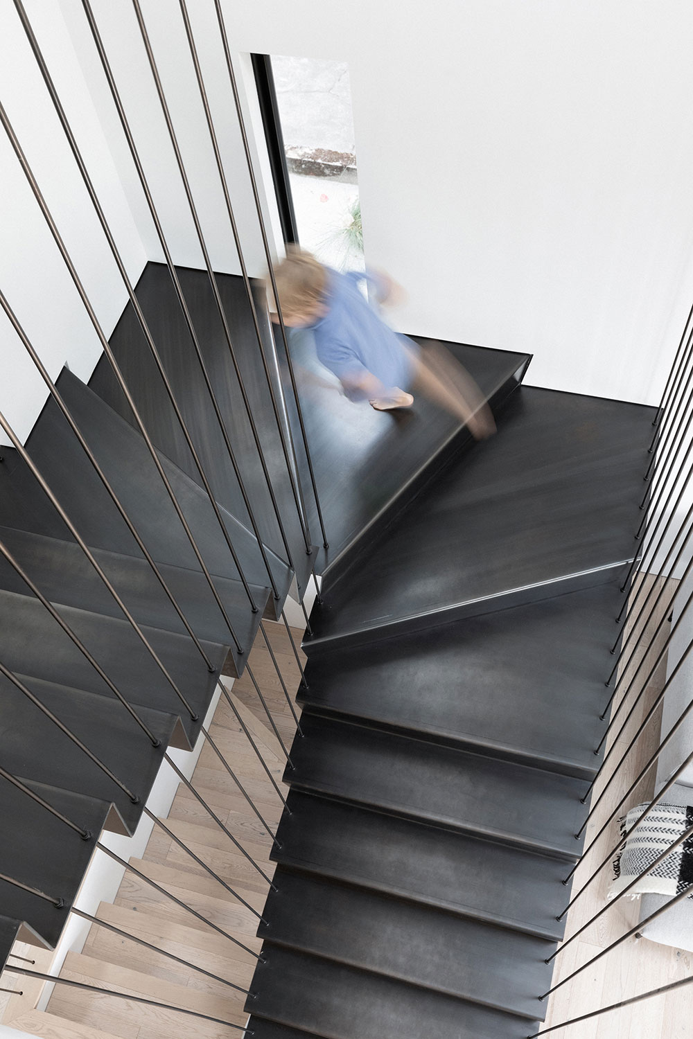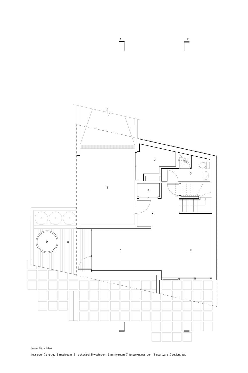 1층은, 철판을 접어서 만든 계단과 천창이 있는 2층 높이의 거실을 비롯한 주방, 식당이 있는 하나의 개방형 공간으로 이루어졌다. 대지가 경사져 있어서, 차고가 들어 있는 지하층에도 남쪽과 서쪽으로 트인 공간을 확보한 다음, 가족실, 요가/명상 공간 겸 게스트 룸 등이 밝고 넓게 배치되었다.