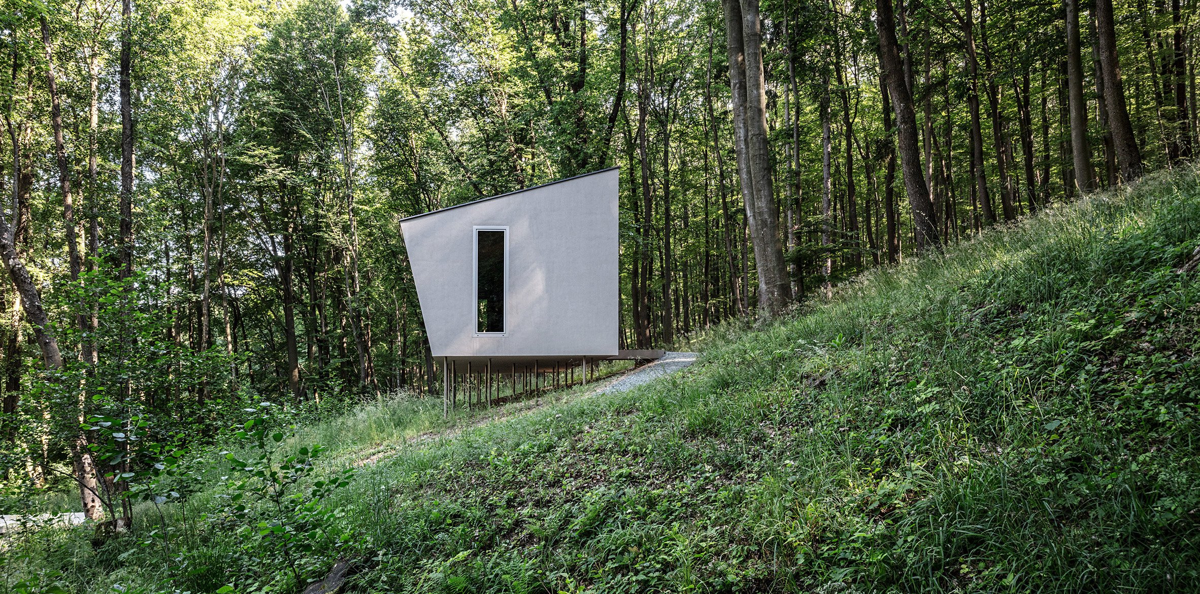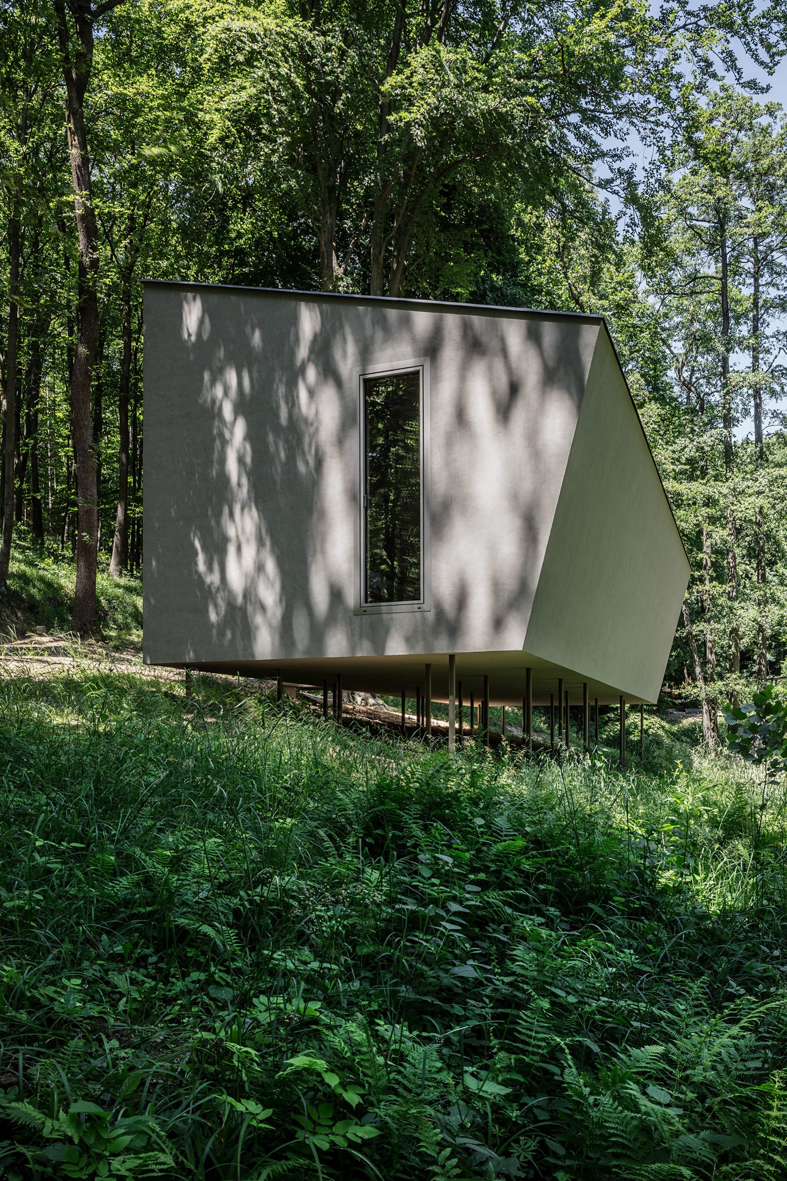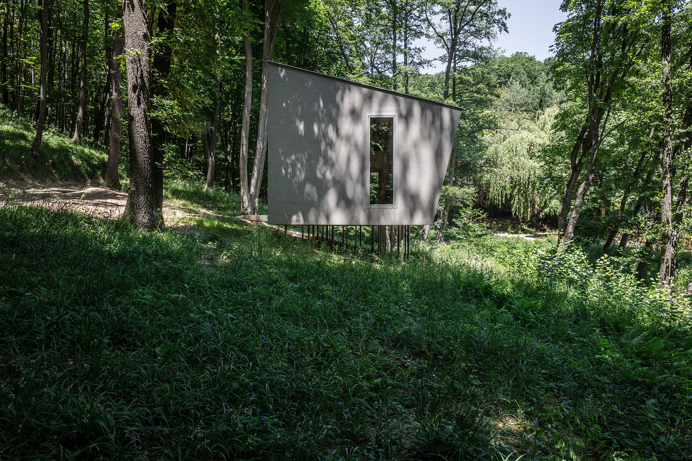 건물 전체가 여러 개의 가느다란 기둥 위에 지어진, 헝가리 쾨세그Köszeg 인근 Alpokalja 숲속의 휴가용 주택으로, 40제곱미터(약 12평) 밖에 안 되지만 침실을 갖춘 집이다.