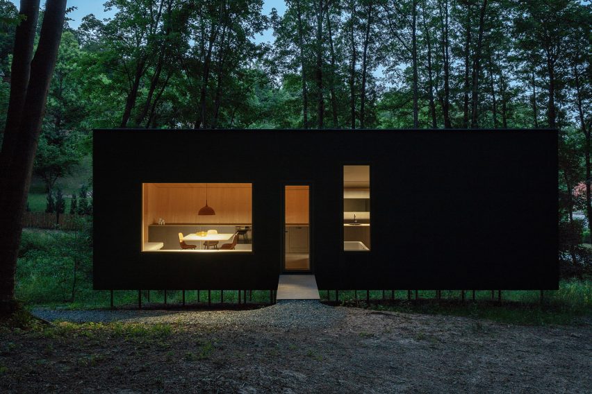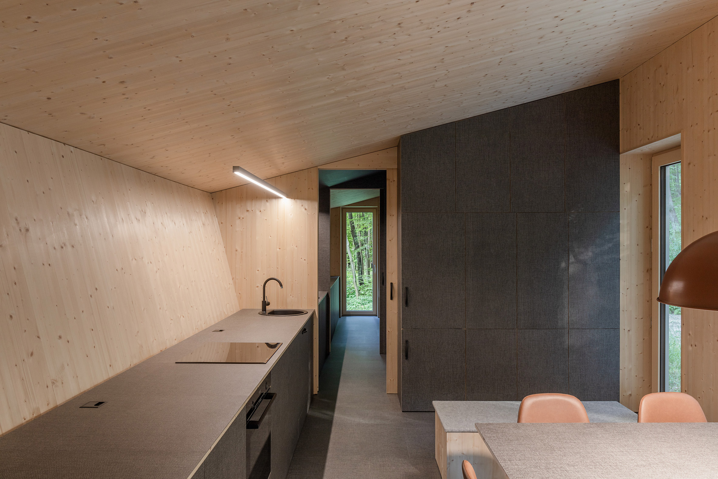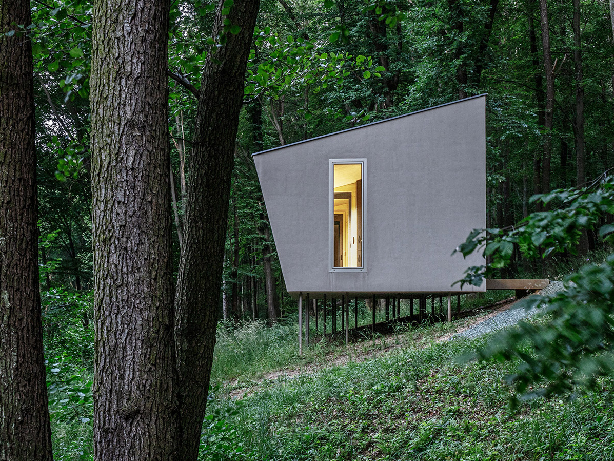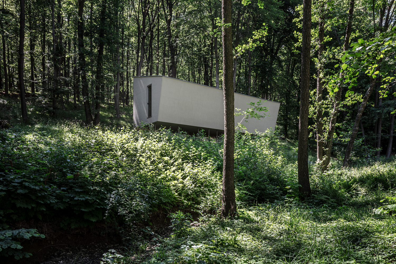 건물 전체가 여러 개의 가느다란 기둥 위에 지어진, 헝가리 쾨세그Köszeg 인근 Alpokalja 숲속의 휴가용 주택으로, 40제곱미터(약 12평) 밖에 안 되지만 침실을 갖춘 집이다.