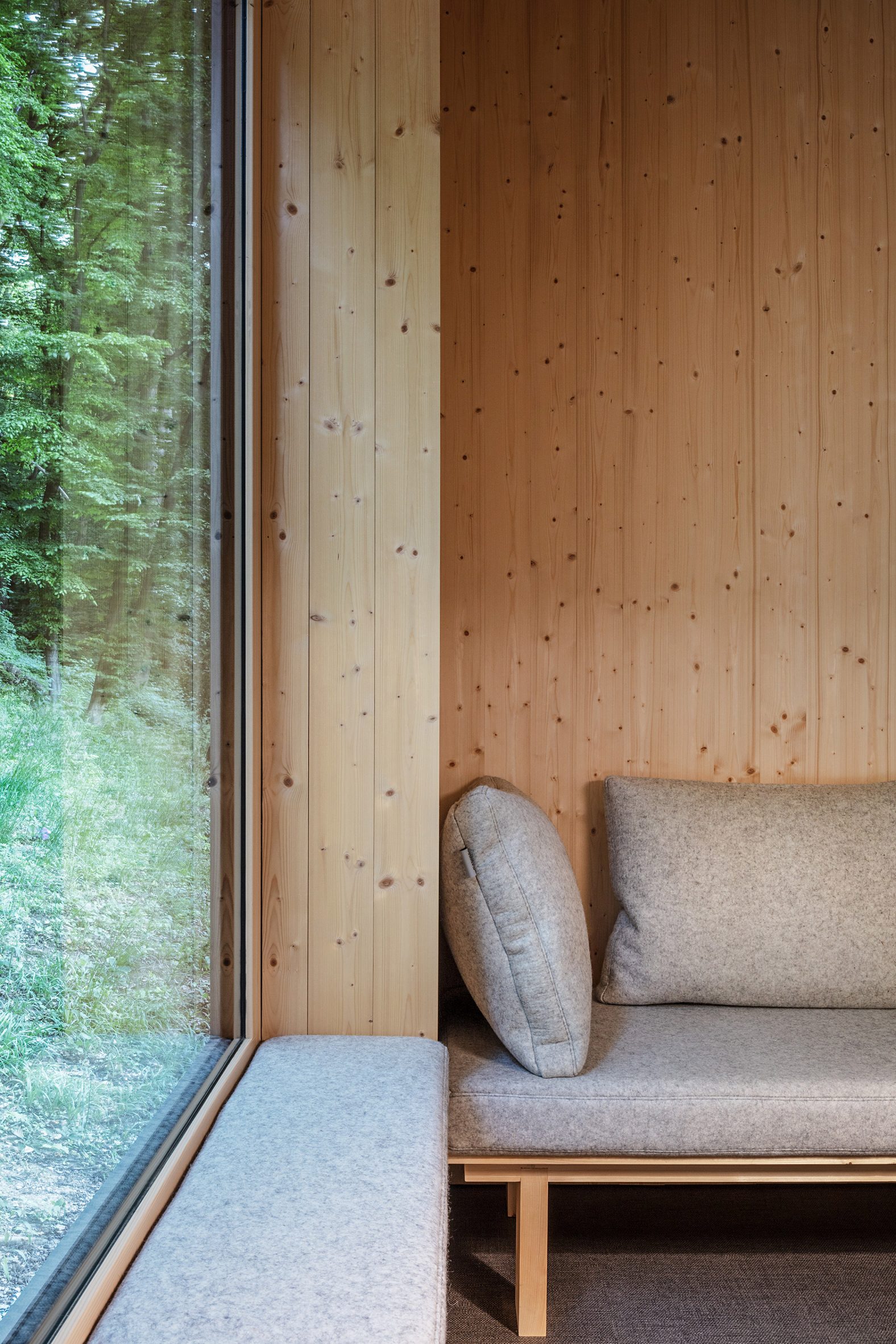 건물 외부에는, 내부 마감재와 대조되는 회색이 균일하게 적용되었다. “내부는 따뜻하고 포근한 분위기로 인테리어를 하고, 외부는 캔버스처럼 거칠면서도 균일한 색상으로 마감하여 숲이 그 위에 마음대로 색상과 패턴을 그려나갈 수 있게 했습니다.”