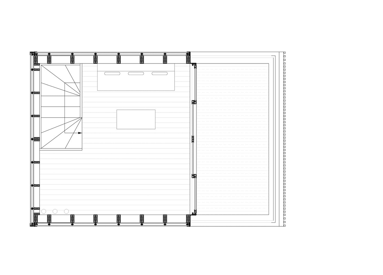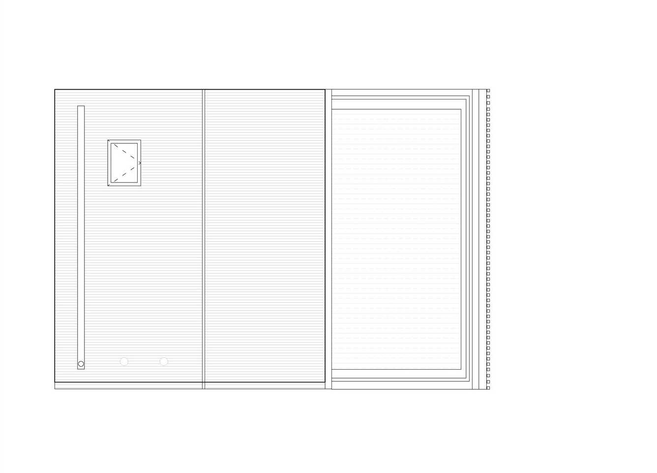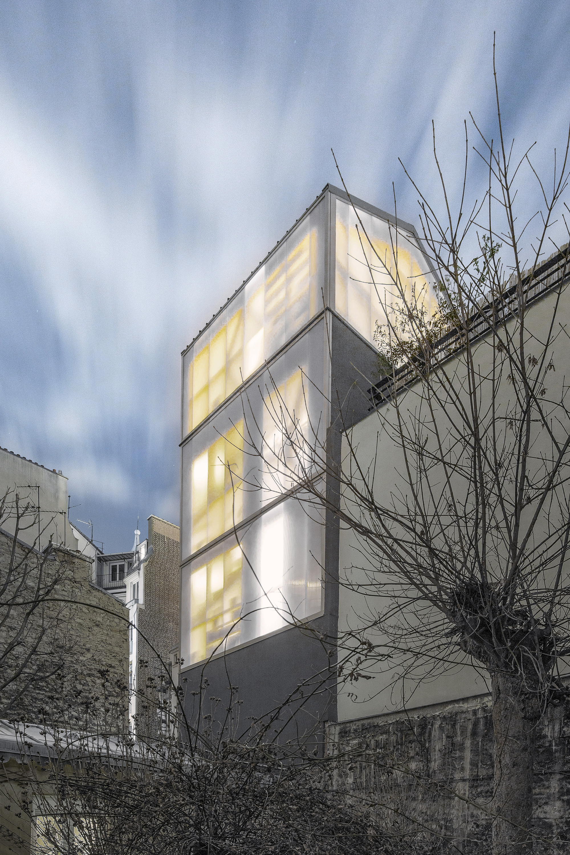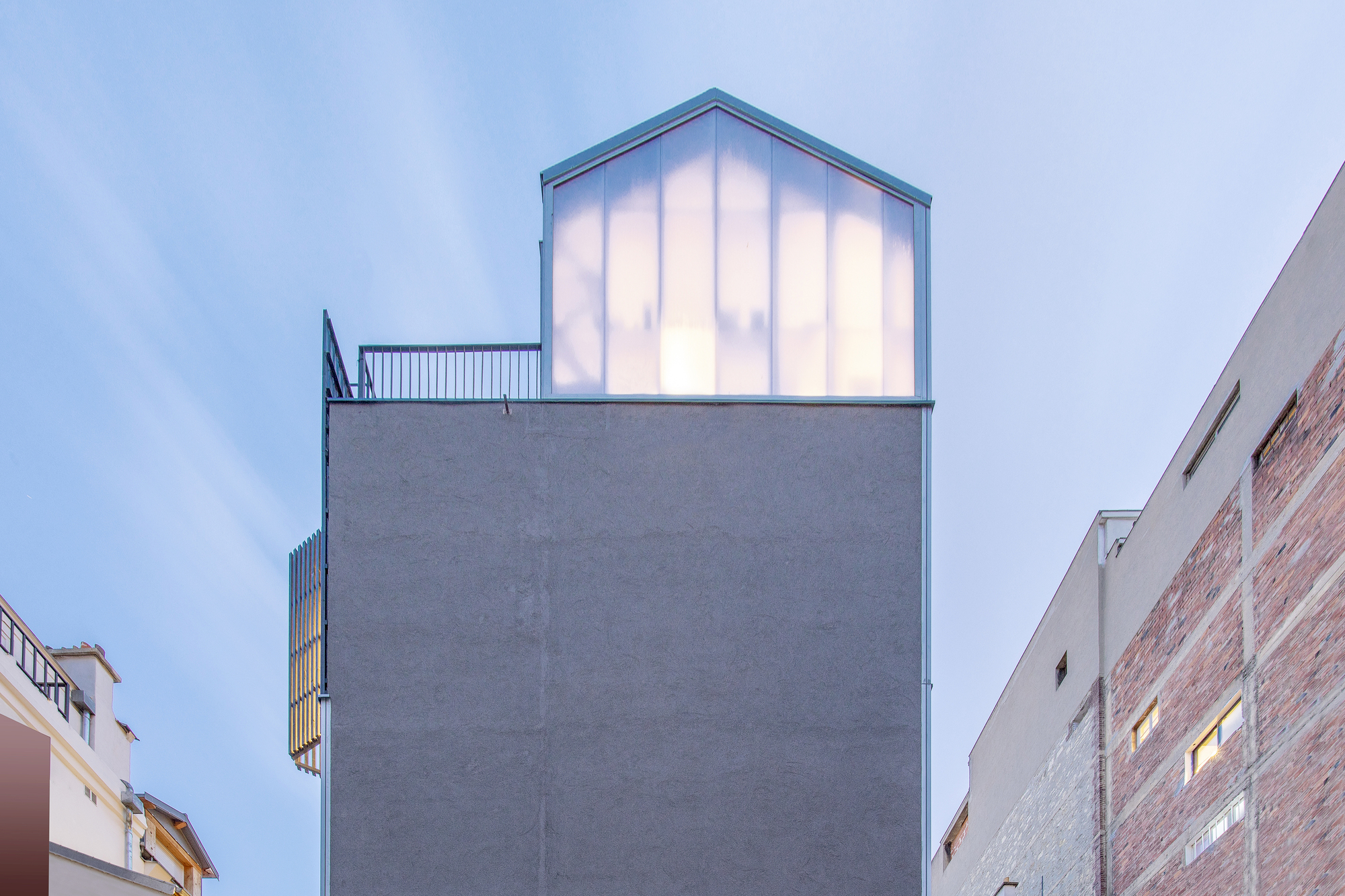 조망이 가능한 파사드는 하나뿐입니다. 전면의 이 메인 파사드를 층마다 다르게 디자인하여, 용도가 다른 공간들이 여러 개 쌓인 건물처럼 보이게 했습니다. 반면, 건물의 후면 파사드는 반투명 폴리카보네이트로 마감하여 은은한 빛이 내부로 투과됩니다. 옥탑 층은, 투명한 전면 파사드와 삼면의 반투명 외피로 이루어져 있어서 마치 온실처럼 보입니다. 그래서 해질 녘 불을 켜면 건물이 하나의 랜턴처럼 보입니다.