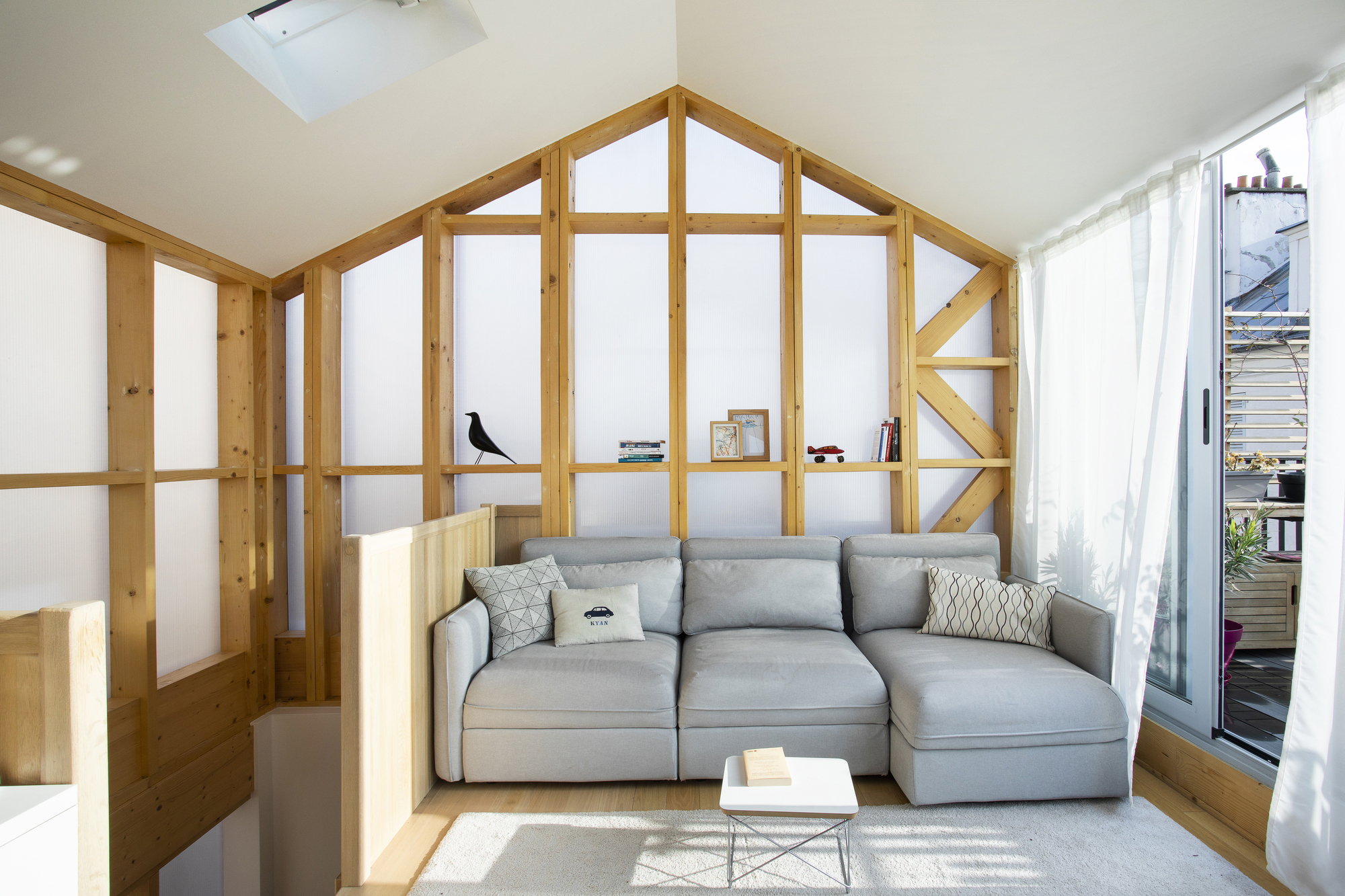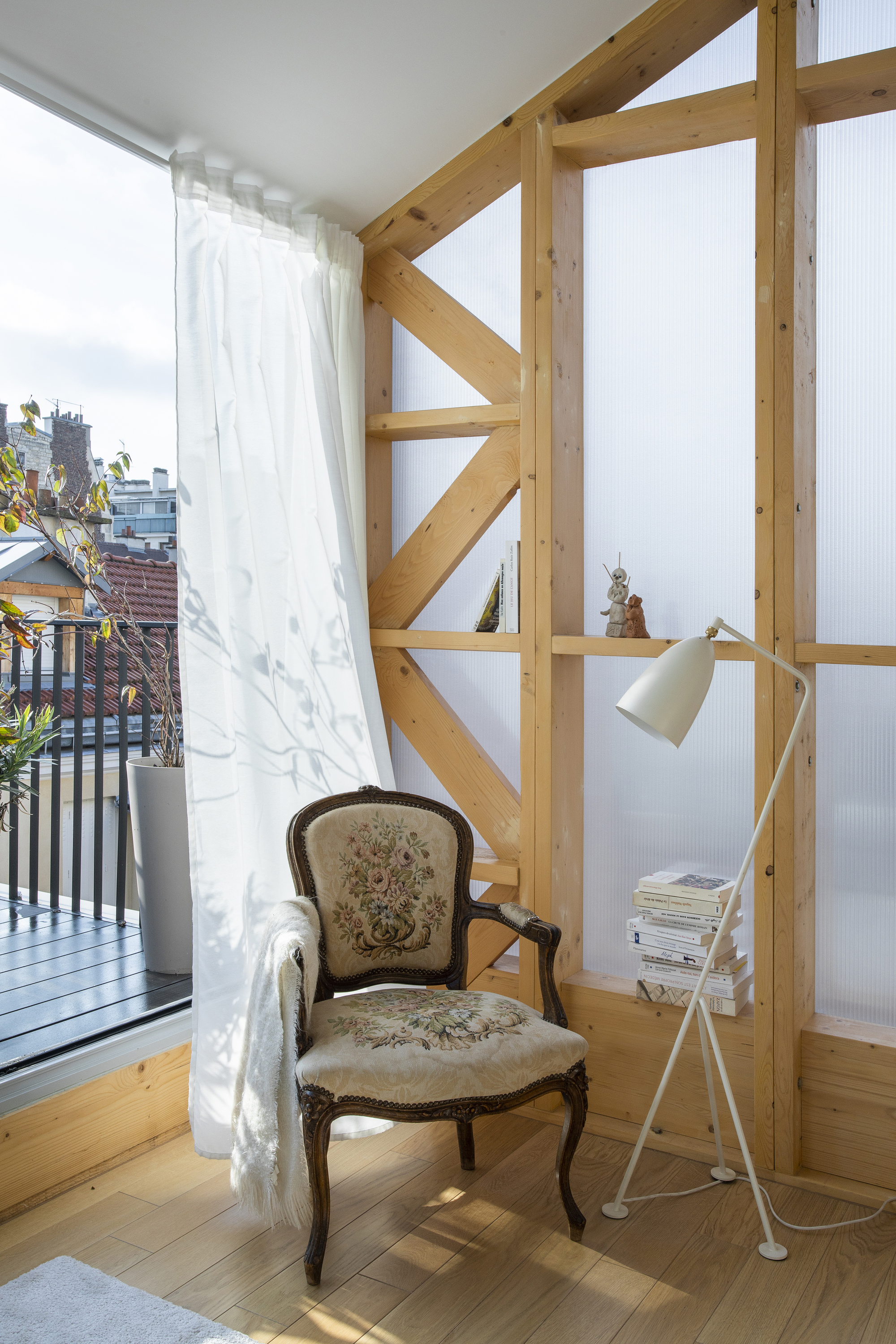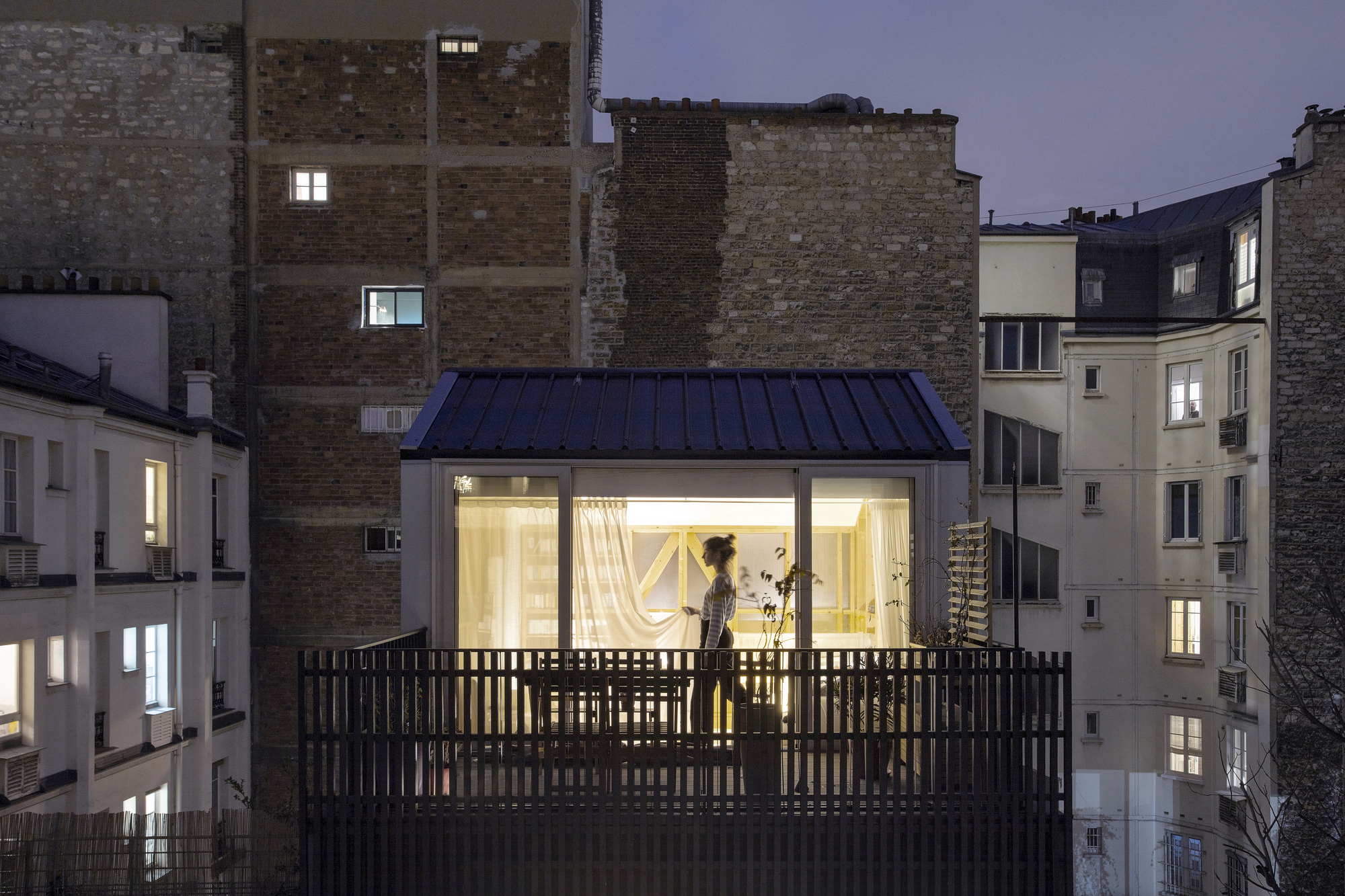 Staying in Paris. 일견 미친 도박처럼 보일 수도 있겠지만, 집값이 천정부지로 치솟고 있는 파리 같은 도시에 중산층 가족이 집을 가질 수 있는 방법을 찾기 위한 좋은 실험이었다고 생각합니다. 기존 건물의 구조를 재사용함으로써, 건축 자재, 에너지, 토지, 예산 등을 많이 절약할 수 있었습니다. 미친 짓처럼 보였지만, 마침내 건축주는 혼잡하고 비싼 도시 한가운데에 에너지 효율적인 현대식 주택을 갖게 되었습니다.”