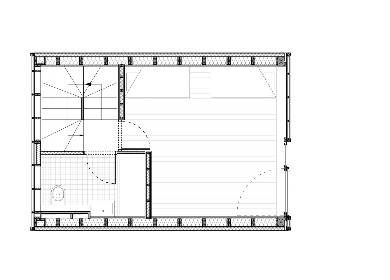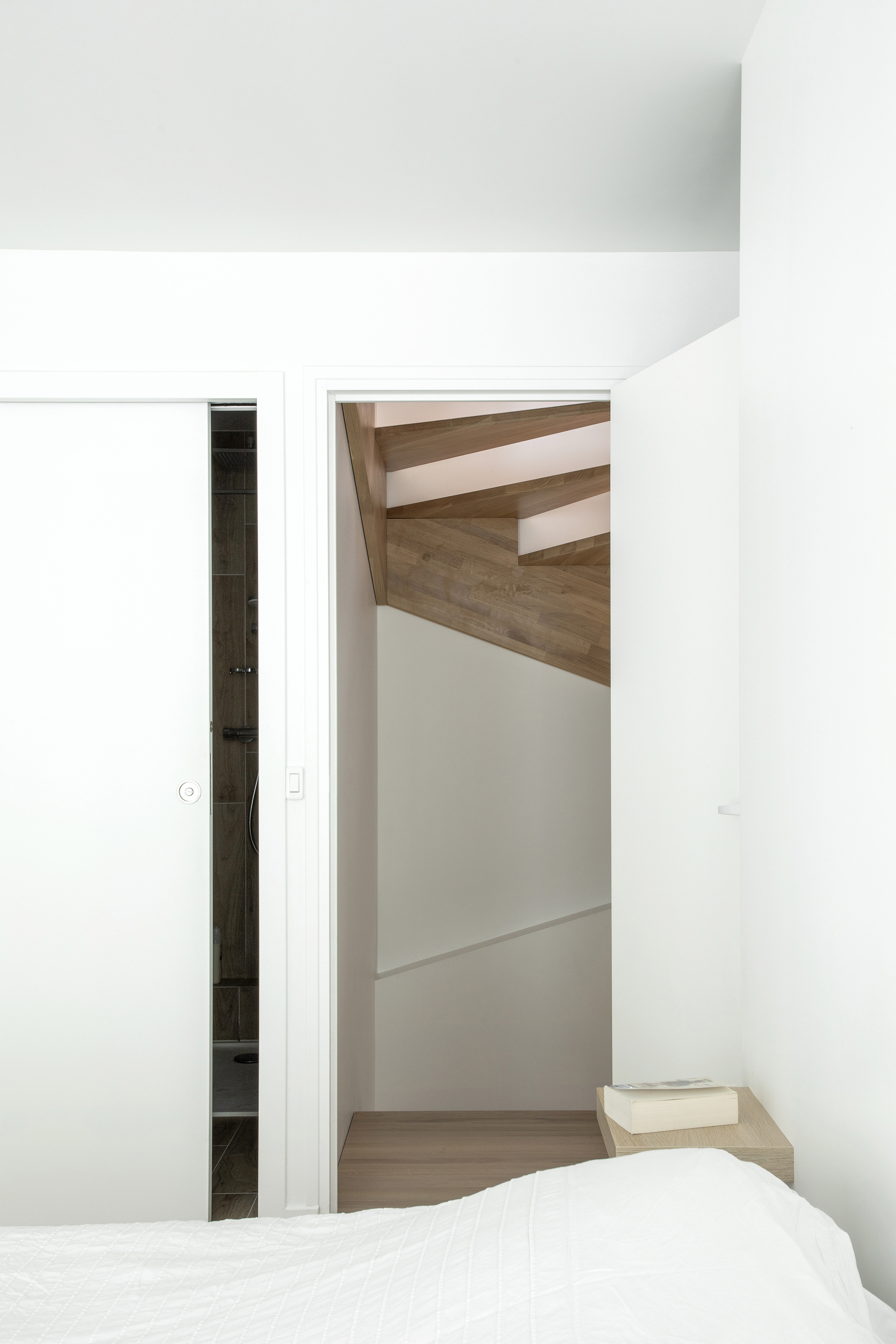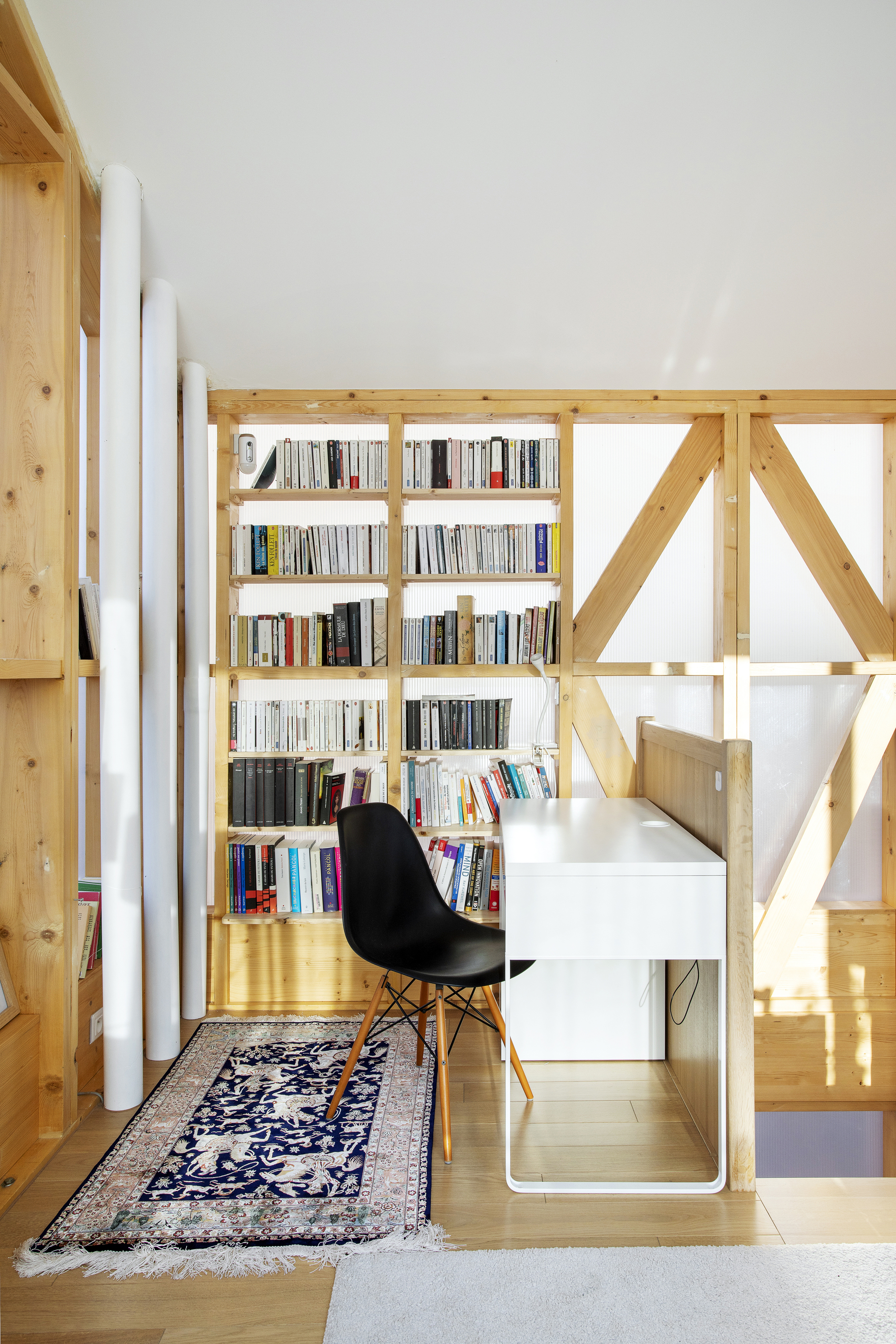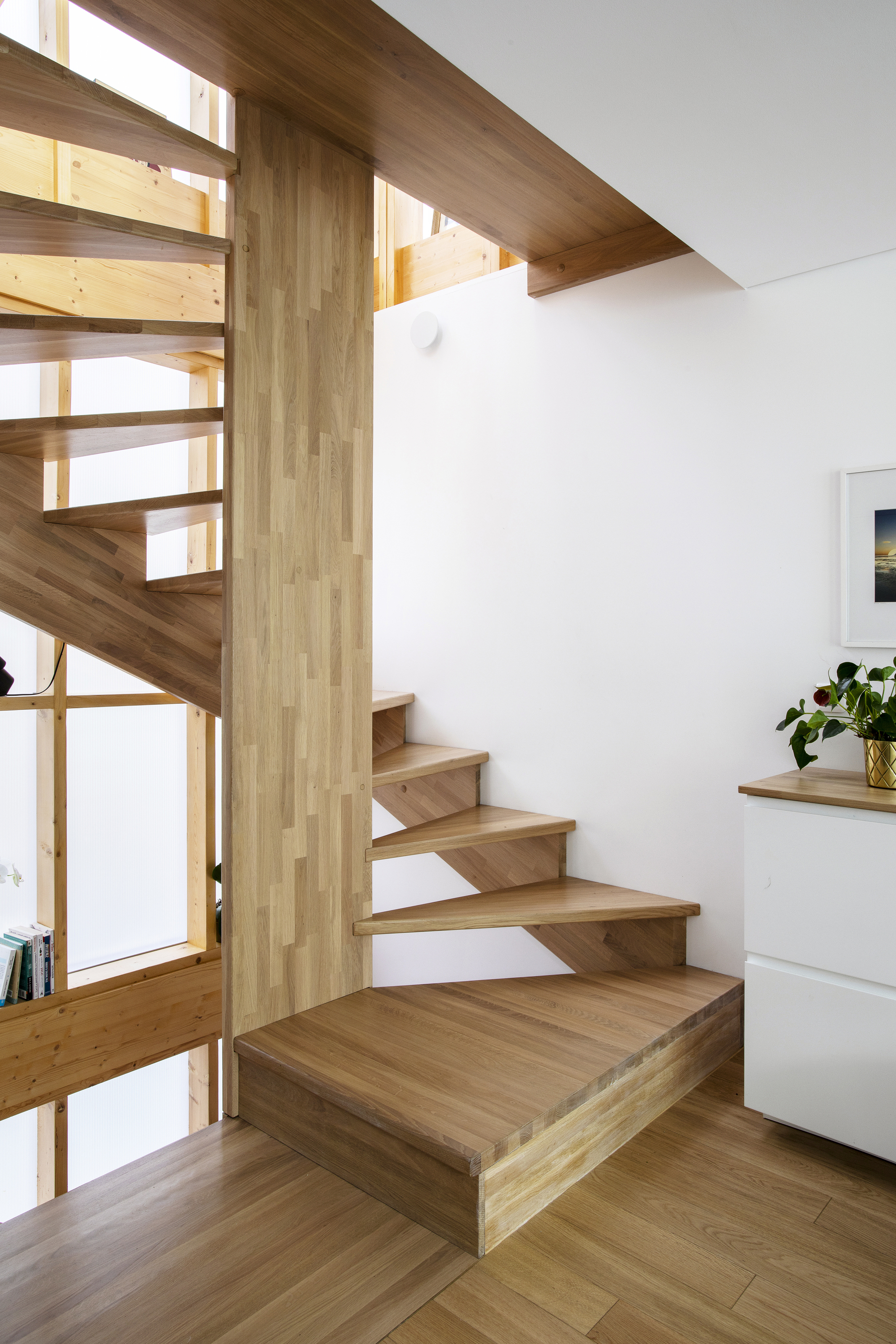 A tower in the middle of a courtyard. 건물 자체에 대한 이야기입니다. 기존 건물에 세 개 층을 더 올려서, 6m x 4m 공간을 기반으로 하는 6층짜리 ‘타워’ 건물이 되었습니다. 기존 구조 위에 증축을 해야 했기 때문에 하중을 줄이기 위해 목조로 지었습니다. 대부분의 내부 공간, 특히 계단실에 목구조가 적나라하게 드러나 있습니다.