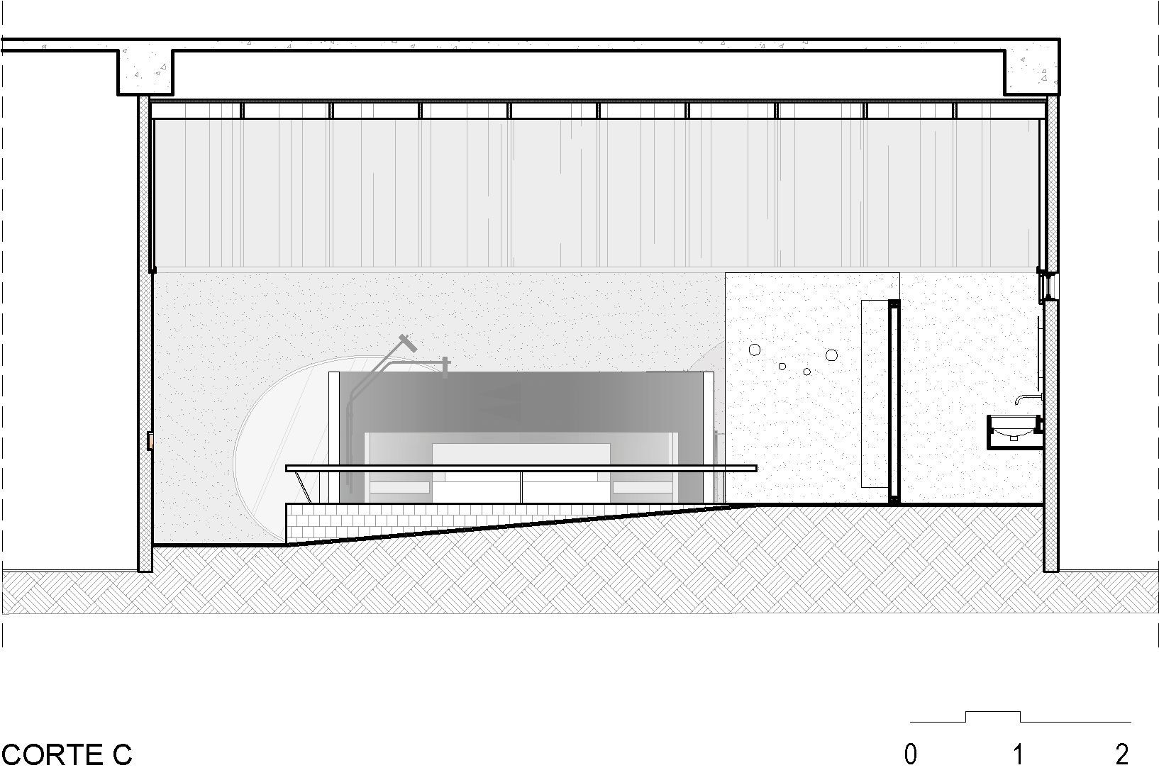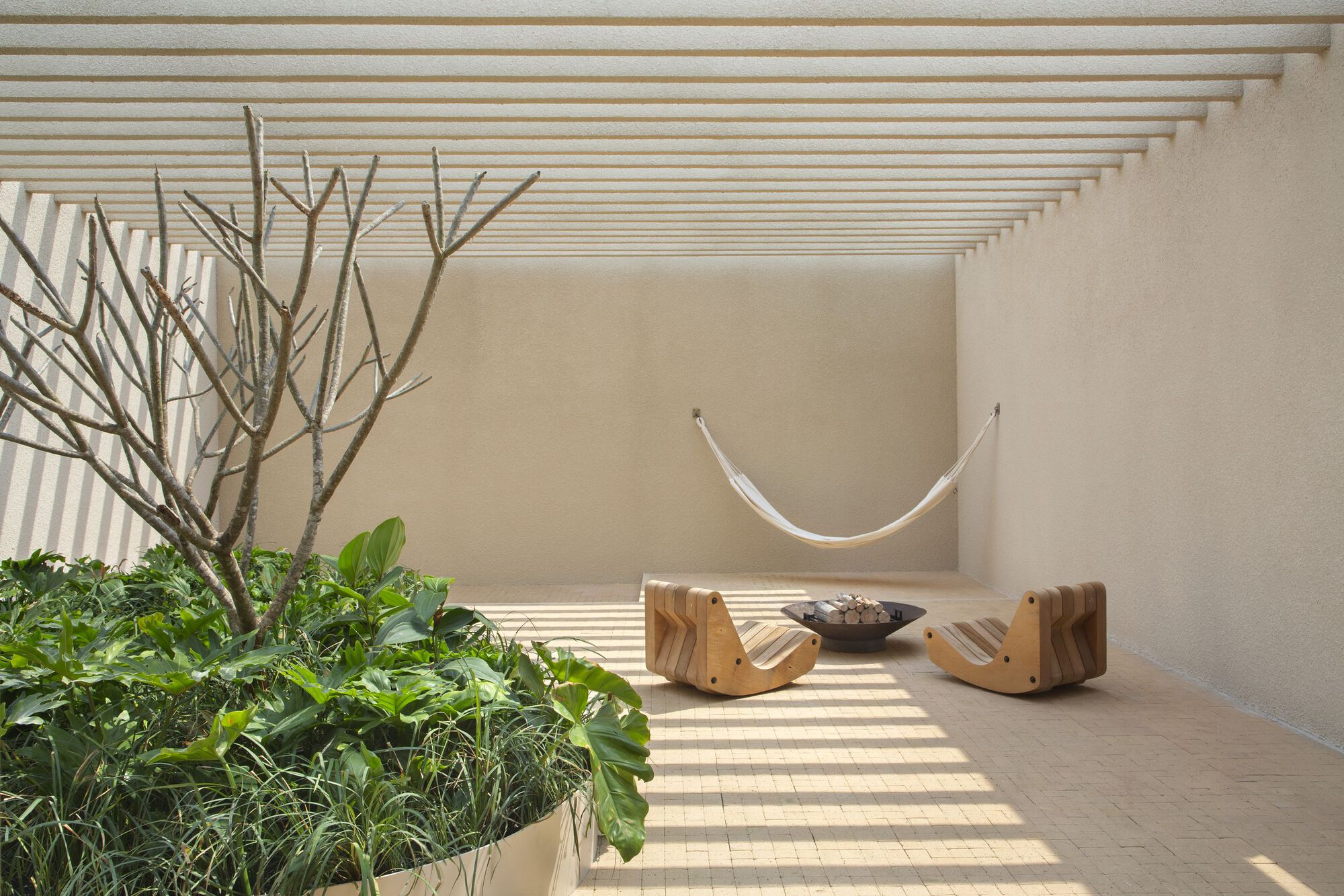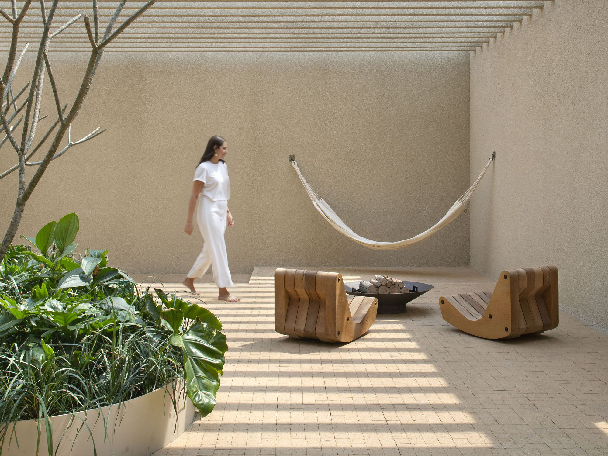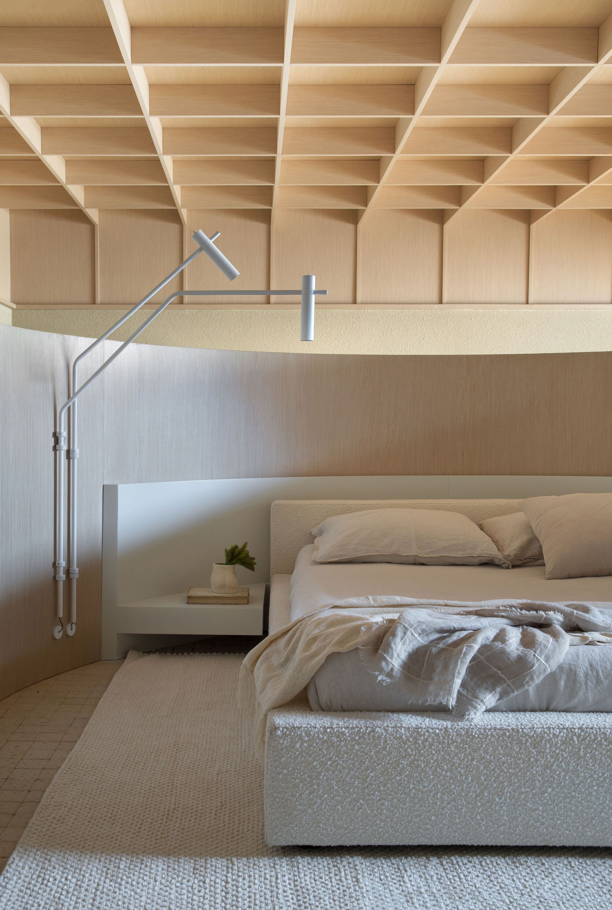 성찰과 칩거의 공간을 전제로 디자인된 이 공간은 벨기에 건축가 Juliaan Lampens의 House Vandenhaute-Kiebooms(1967)에서 영감을 가져온 반 원통형 볼륨을 통해 침실이 거실과 느슨하게 그리고 절묘하게 분리되었다. 브라질 도예가들의 수공예 작품의 유기적인 형태와 기하학적 형태를 재해석하여 편안하고 미니멀한 미학을 특징으로 디자인한 이 공간은 이 프로젝트의 파트너인 Bontempo 사가 Legnos Nordico 마감 시스템을 통해 구현했다고 한다. 브라질 모더니즘을 재해석하여 장선을 격자형으로 설치한 천장이 친밀한 분위기를 고조시킨다.