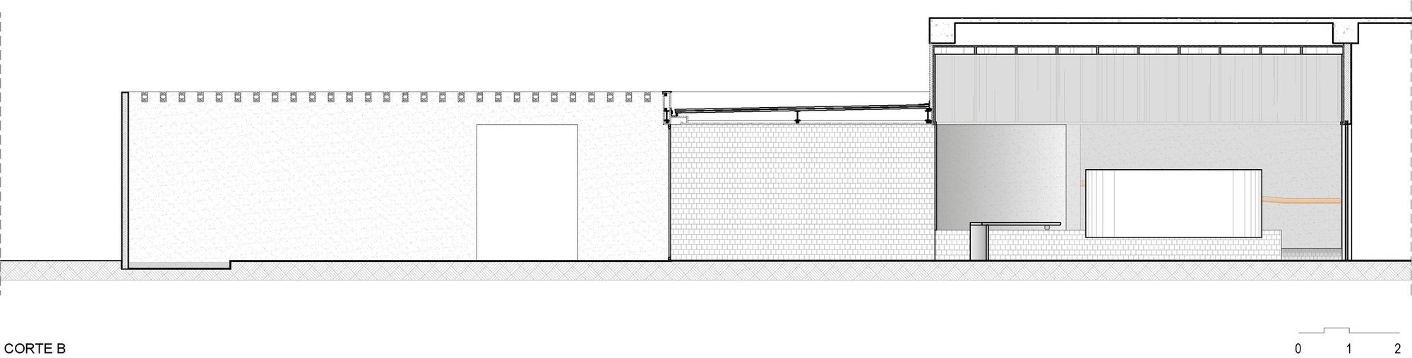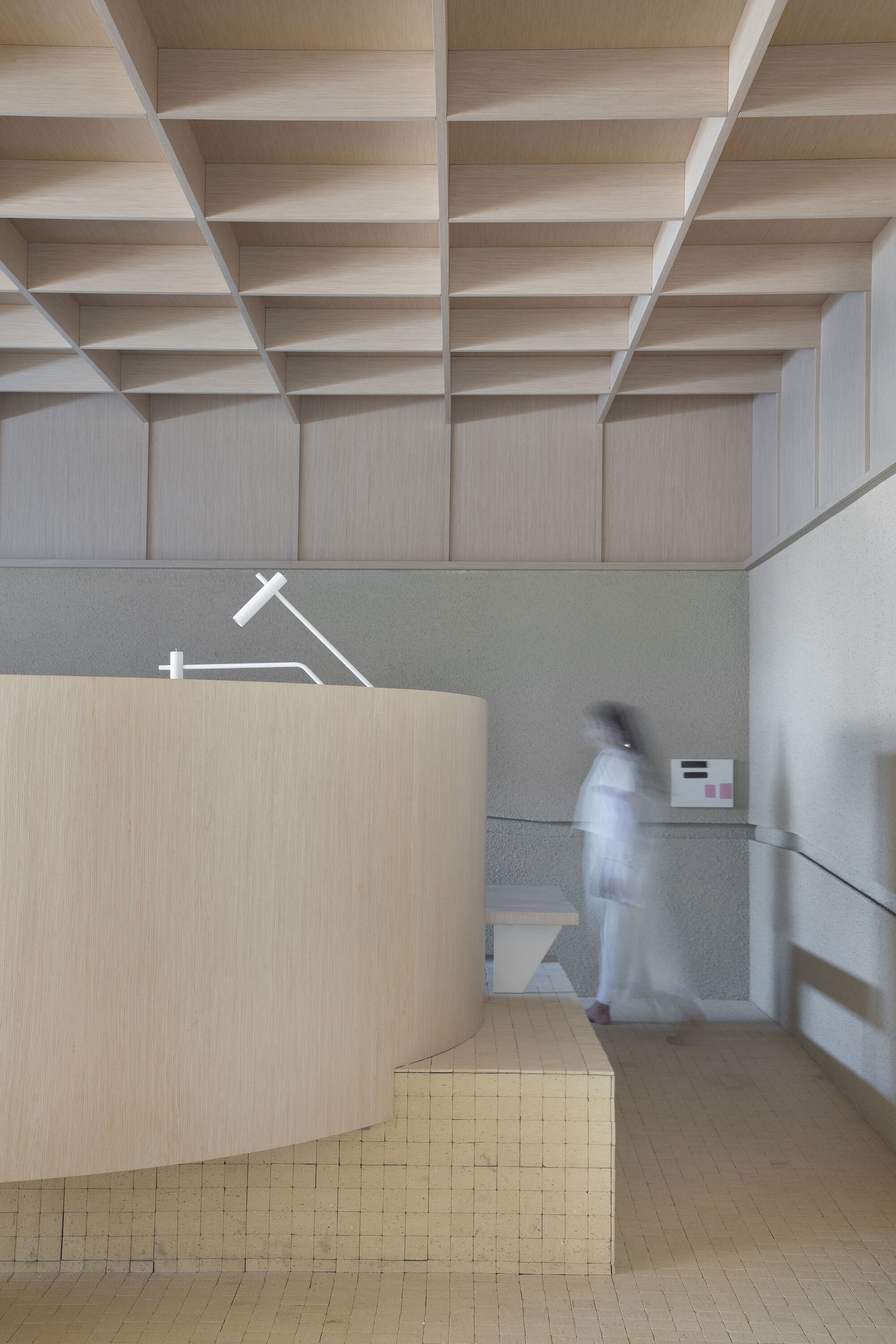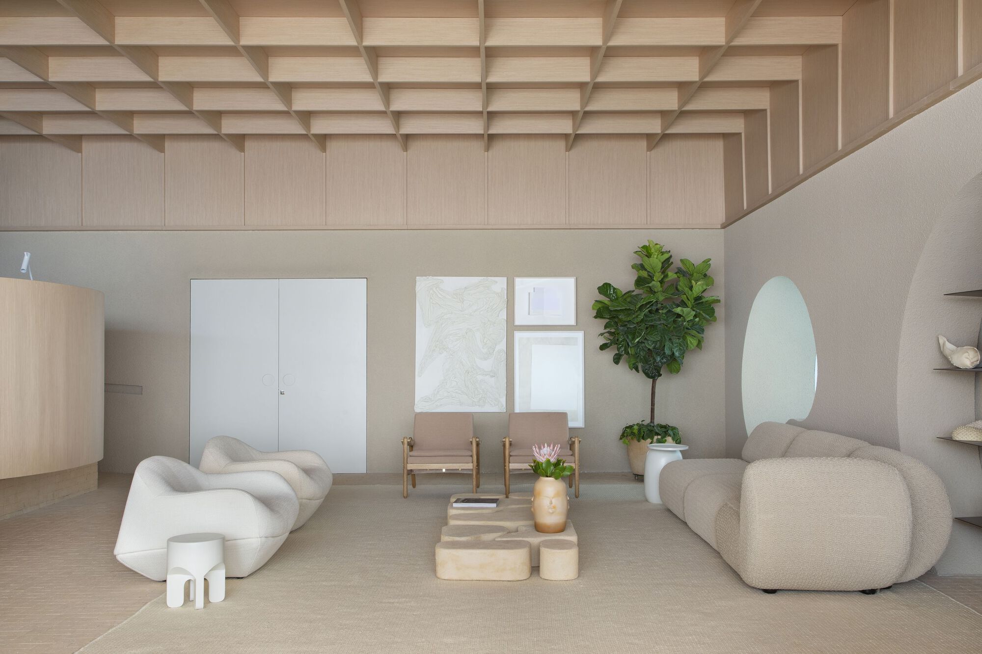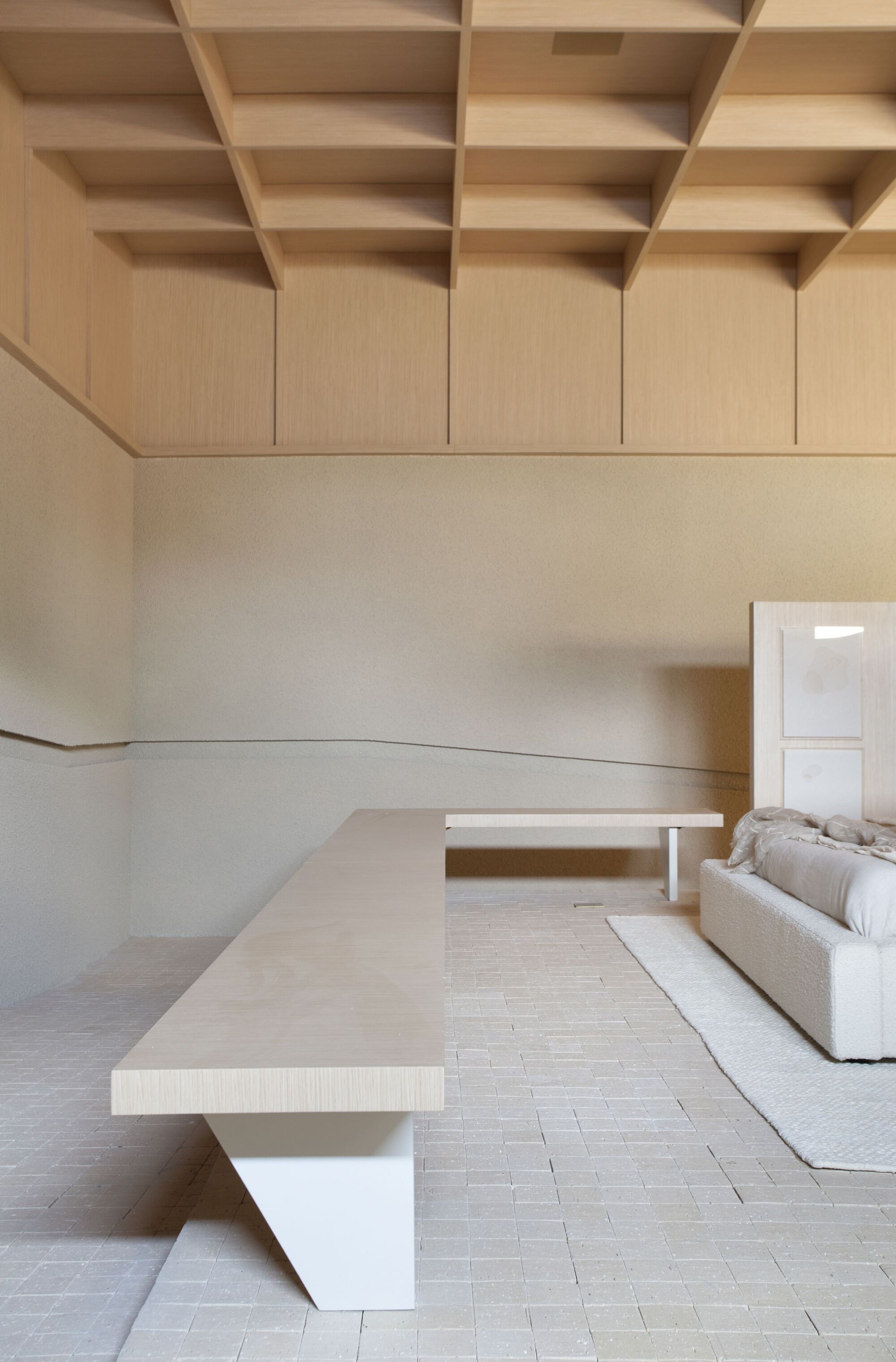성찰과 칩거의 공간을 전제로 디자인된 이 공간은 벨기에 건축가 Juliaan Lampens의 House Vandenhaute-Kiebooms(1967)에서 영감을 가져온 반 원통형 볼륨을 통해 침실이 거실과 느슨하게 그리고 절묘하게 분리되었다. 브라질 도예가들의 수공예 작품의 유기적인 형태와 기하학적 형태를 재해석하여 편안하고 미니멀한 미학을 특징으로 디자인한 이 공간은 이 프로젝트의 파트너인 Bontempo 사가 Legnos Nordico 마감 시스템을 통해 구현했다고 한다. 브라질 모더니즘을 재해석하여 장선을 격자형으로 설치한 천장이 친밀한 분위기를 고조시킨다.