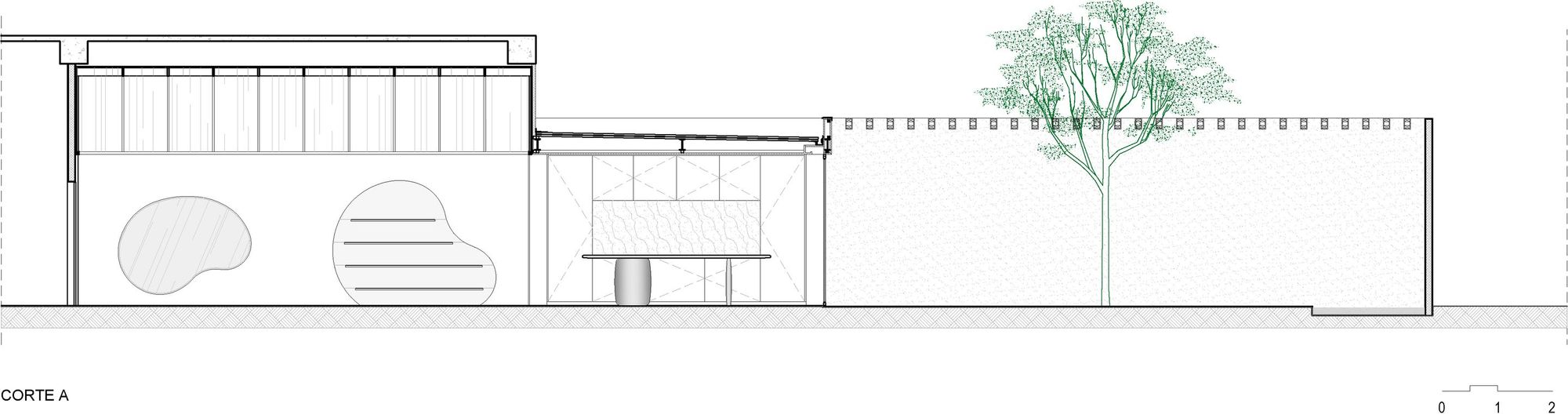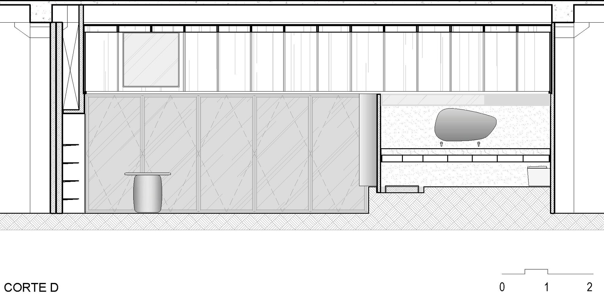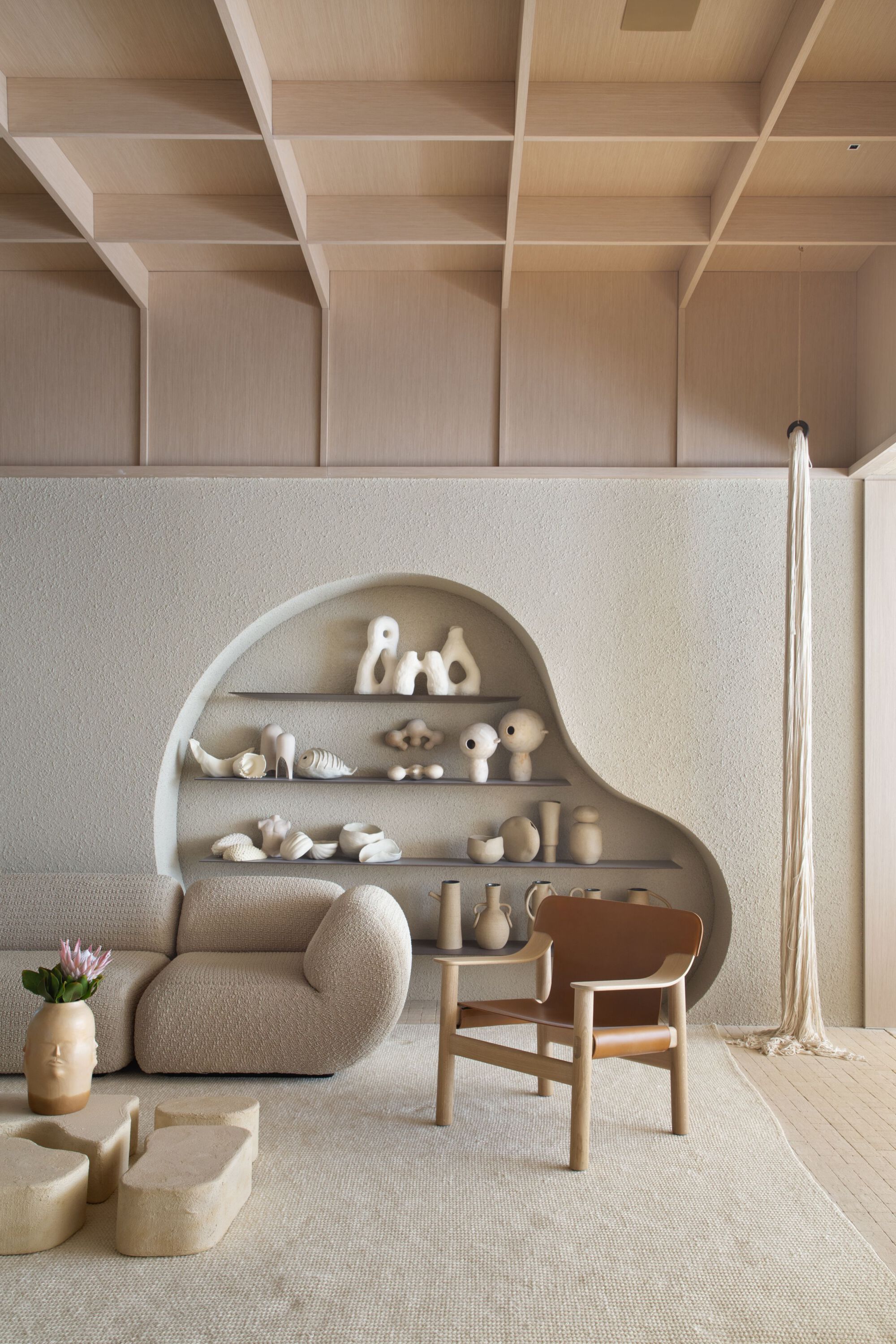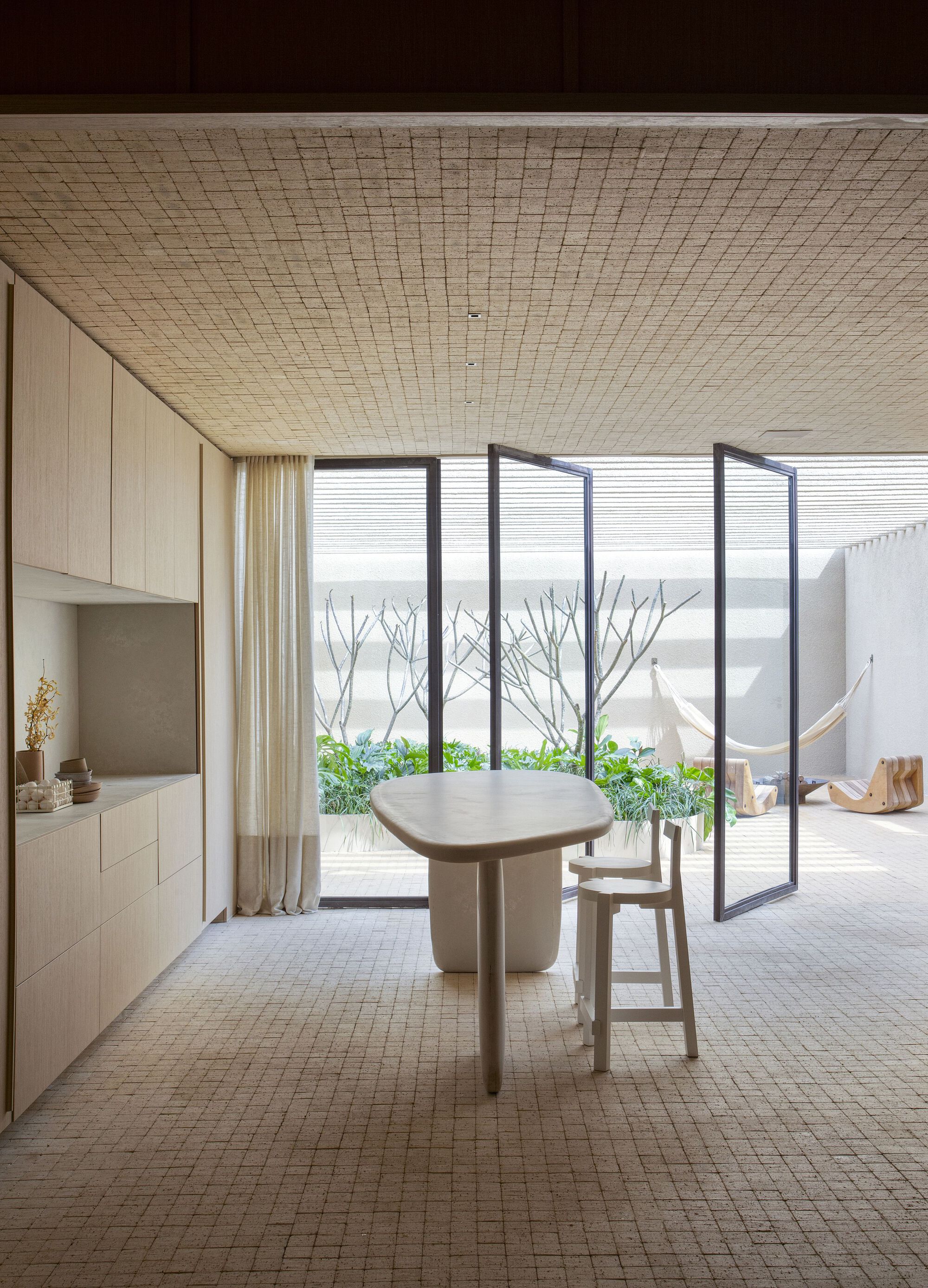 이 본템포 천장은 전통 기와지붕을 참조한 것으로 유기적인 형태의 거실에서 포인트 요소로도 작용한다. 거실에는 브라질 작가들의 도예 작품이 진열된 코르텐 선반이 설치되었다. 독특한 개성을 구현하는 데 특화된 Bontempo의 패널로 천장과 접하는 벽면 상부를 마감하여 기하학적이면서도 편안한 분위기를 냈다.