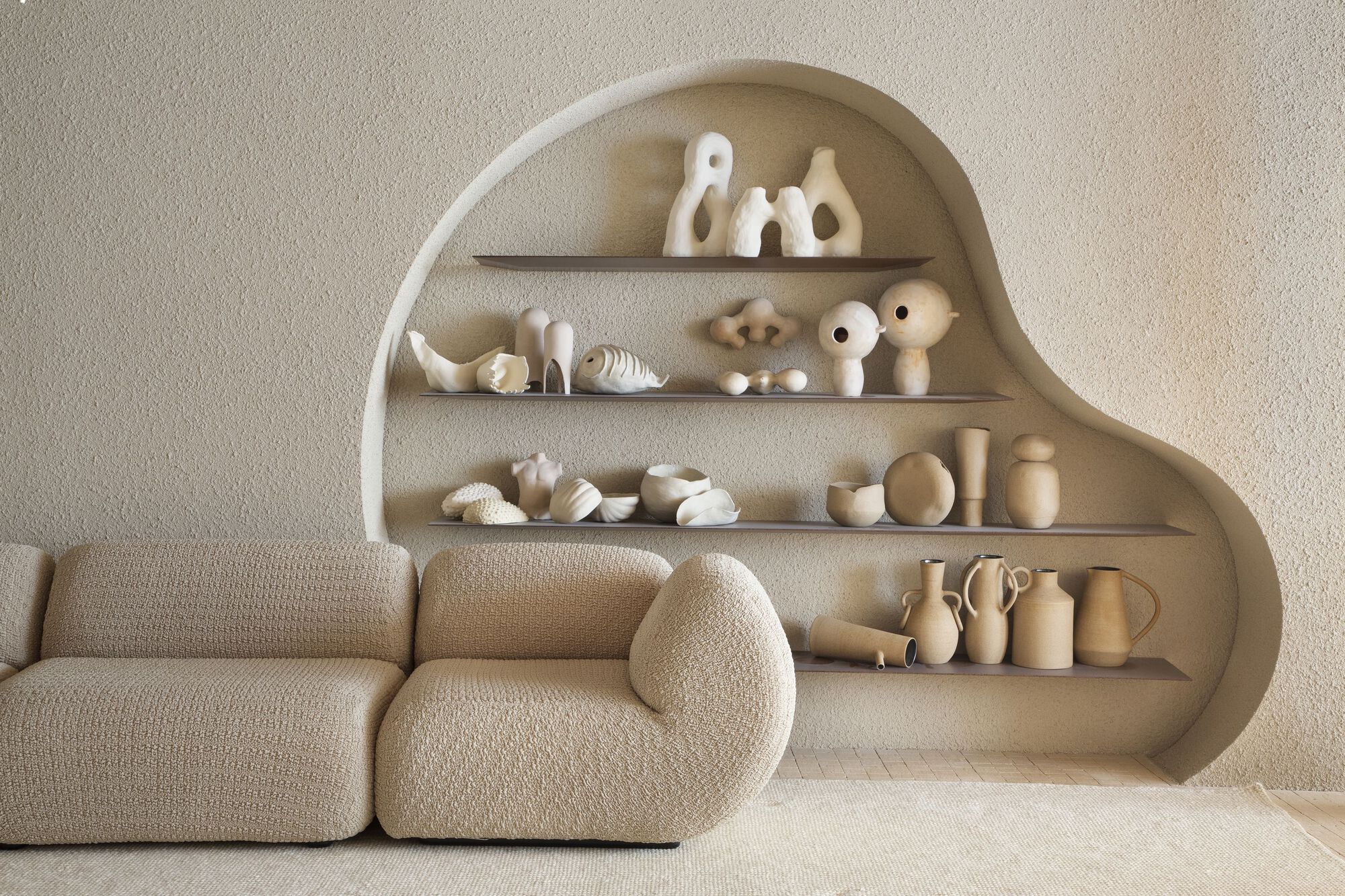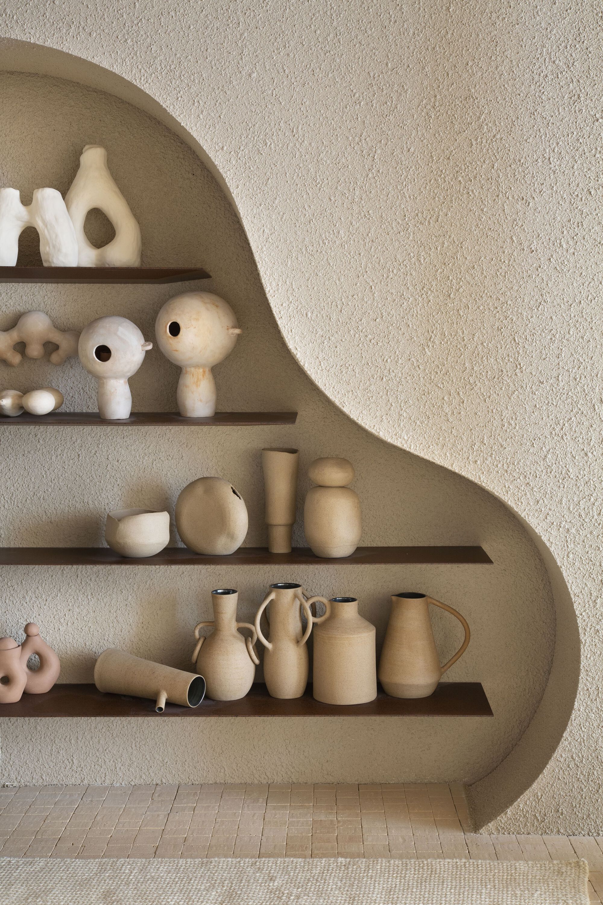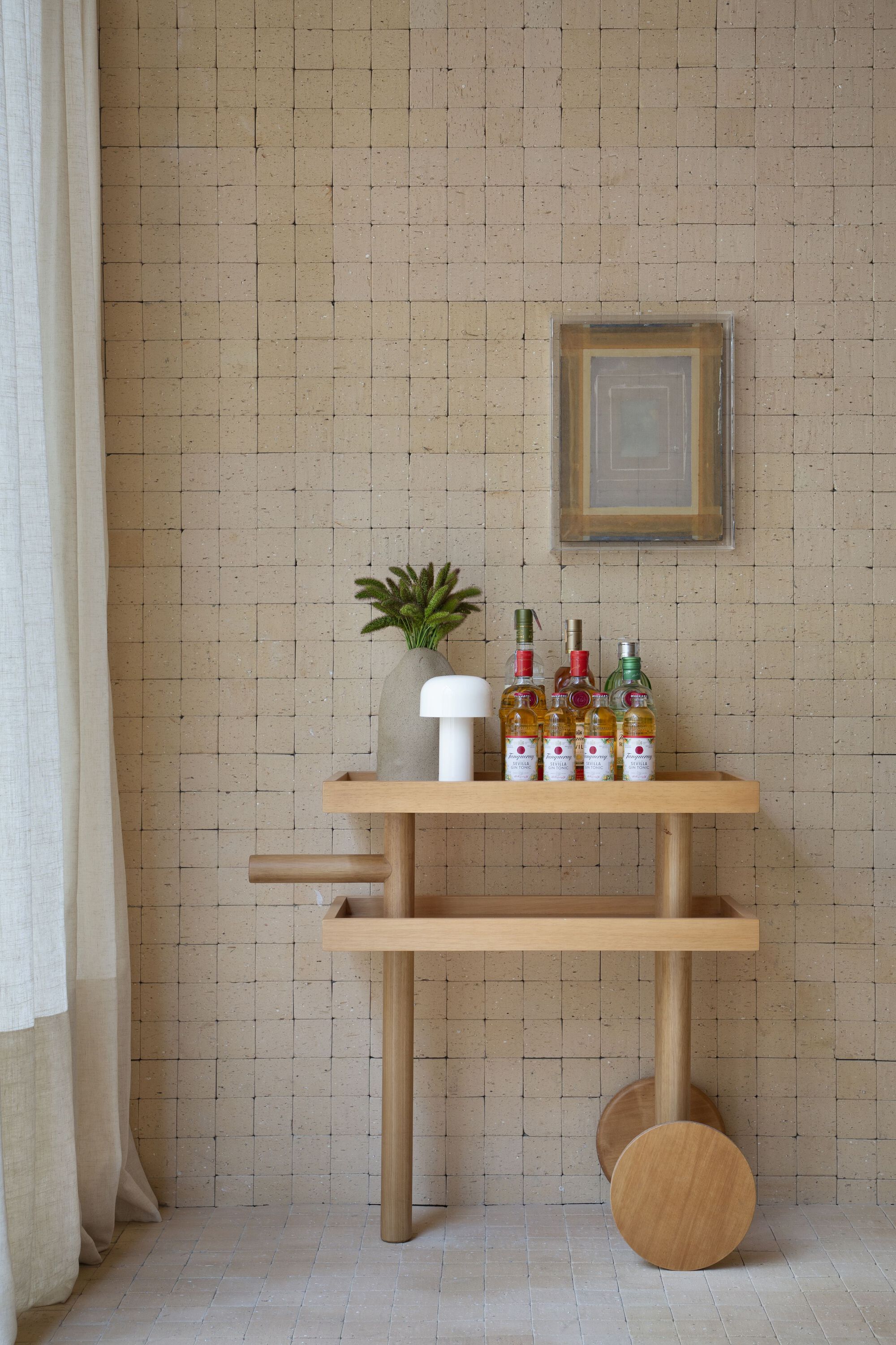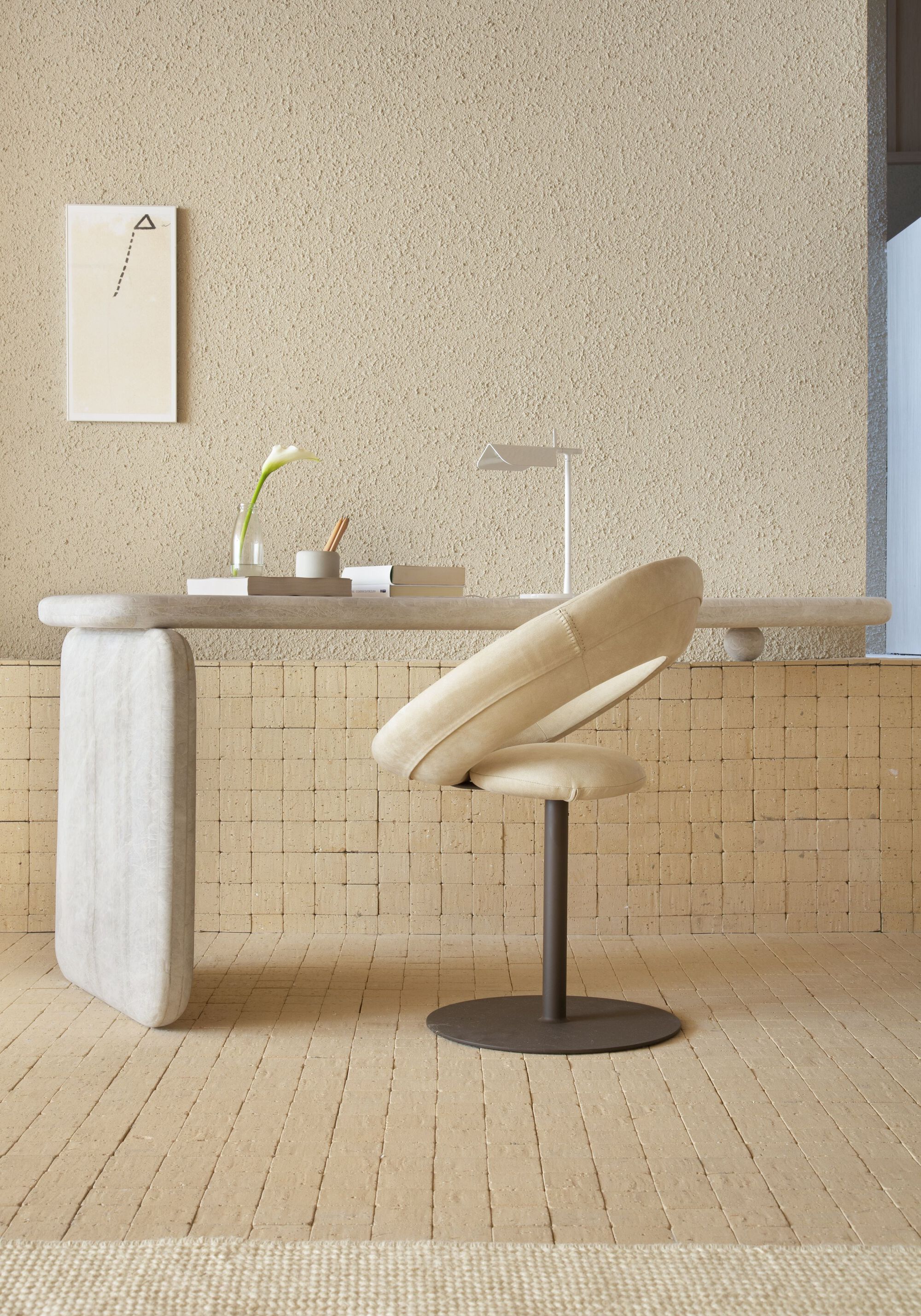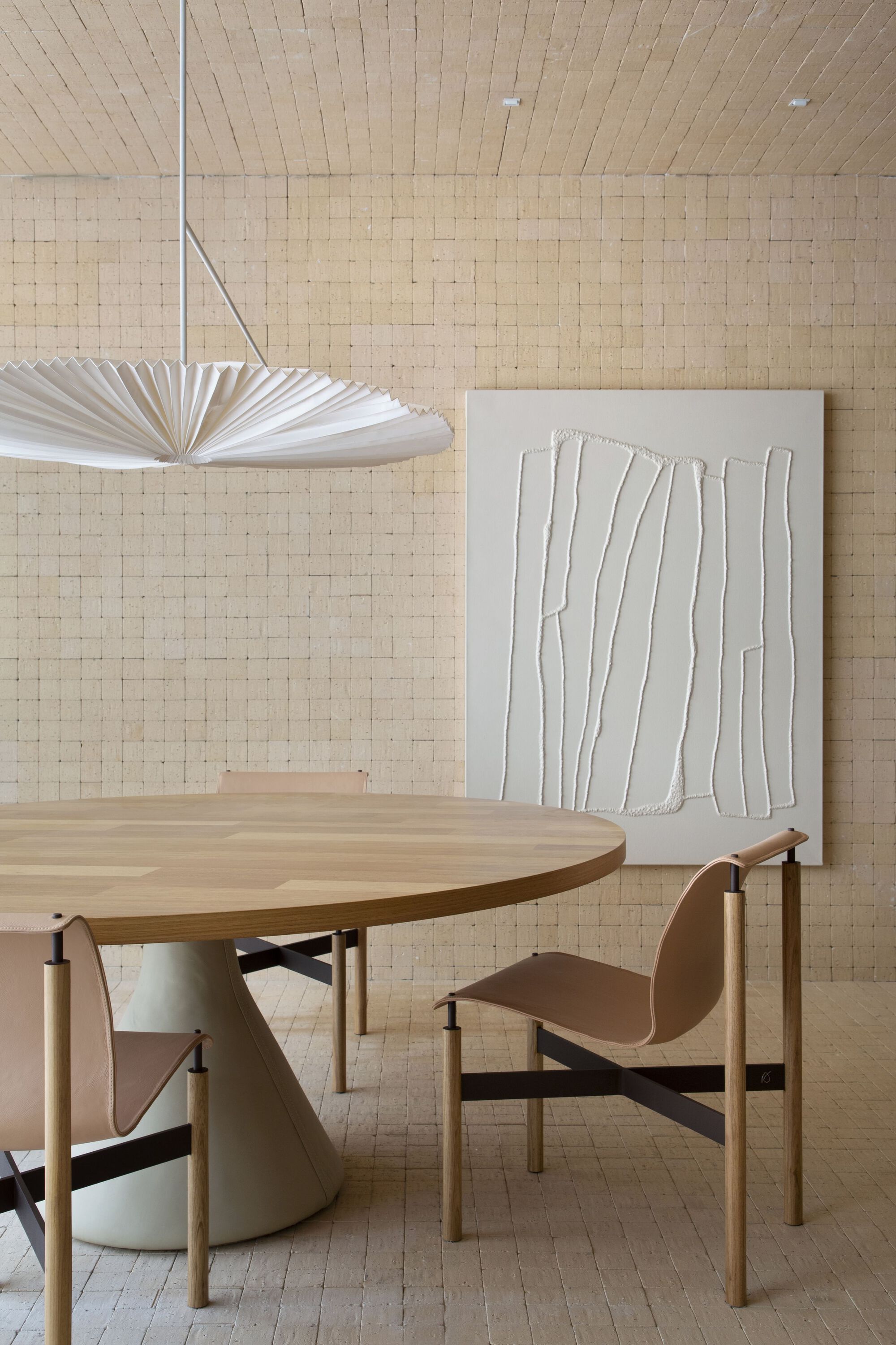 Coffee tables, side tables, benches, and some parts of the space are signed by the office itself, such as the Cabaça armchair. The most important works of art in the environment are by Mira Schendel, Célia Euvaldo, Zanini De Zanine, Carlos Nunes, Georgia Kyriakakis, Sergio Sister, Rodrigo Andrade, Gabriella Garcia and Ana Vitória Mussi. In the ceramics collection, we have pieces produced by Dona Rita, a resident of the village of Campo Alegre and one of the oldest artisans working in Vale do Jequitinhonha. In addition to other names such as Nado, Hanna Englund, Nicia Braga, Denise Stewart, Gilberto Gomes, Alice Aroeira, Studio Nun, Mila & Romi, Frida do not bark, Jamila Cruzado, Noni, Beatriz Dutra and Cristina Palma Lopes.