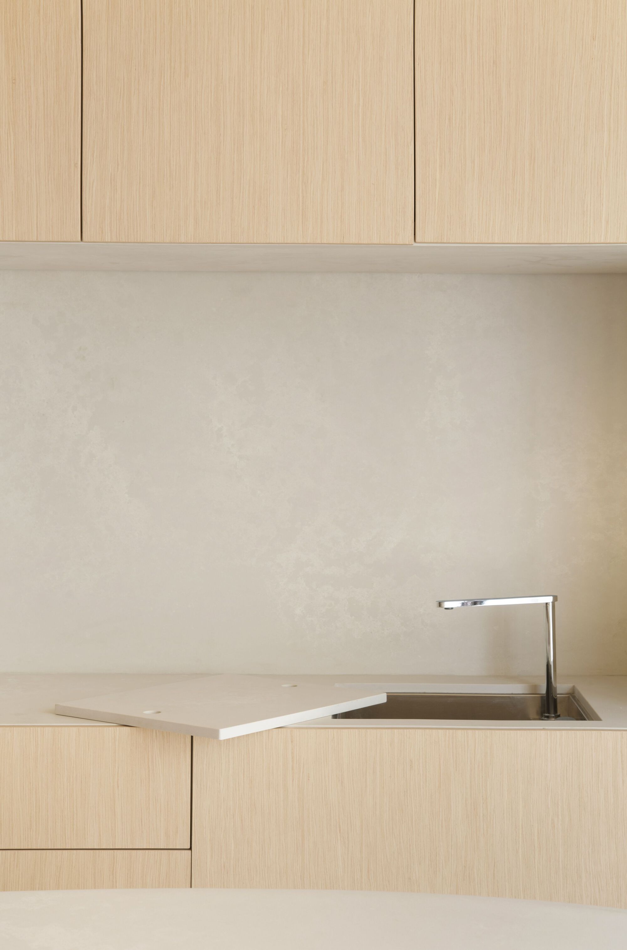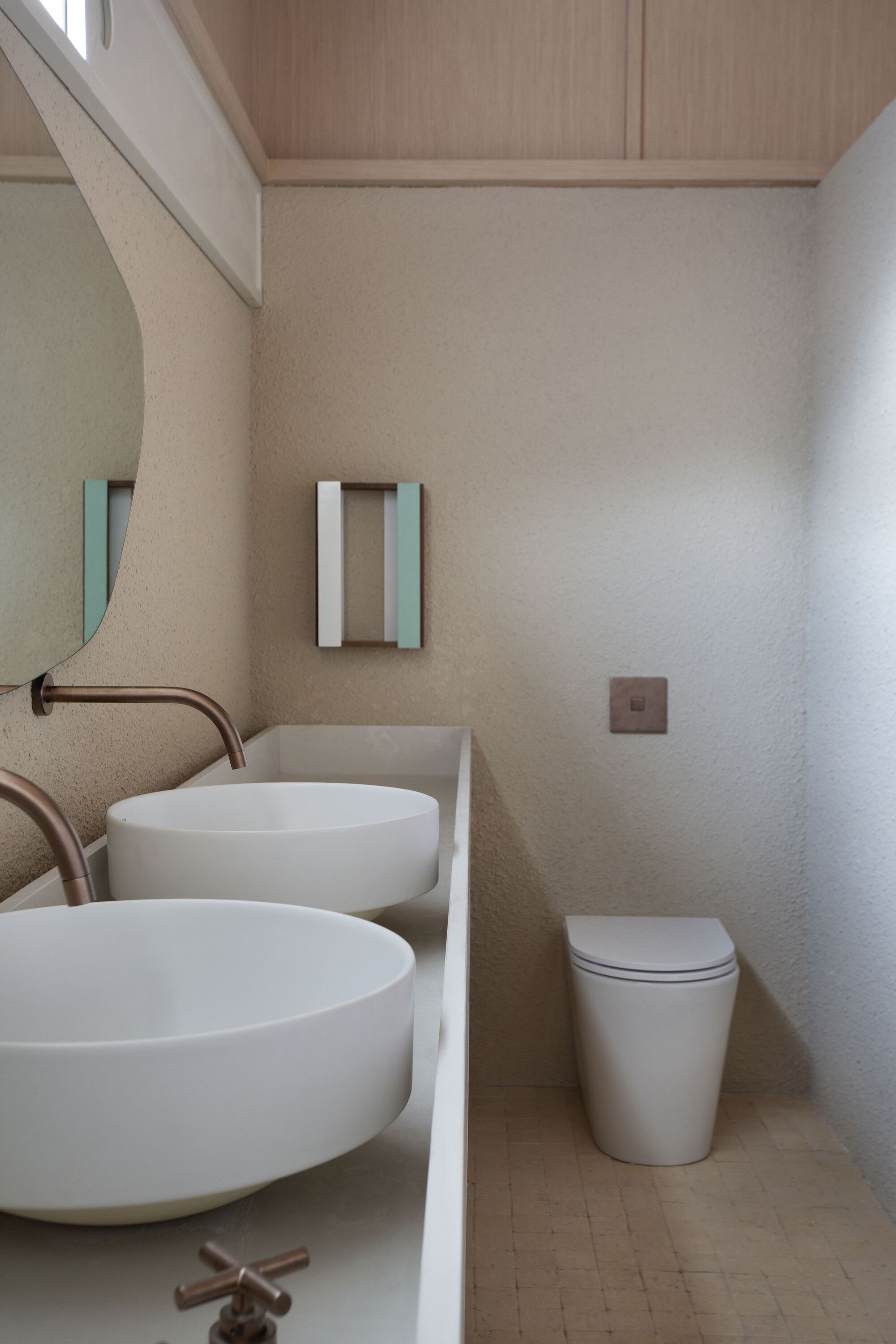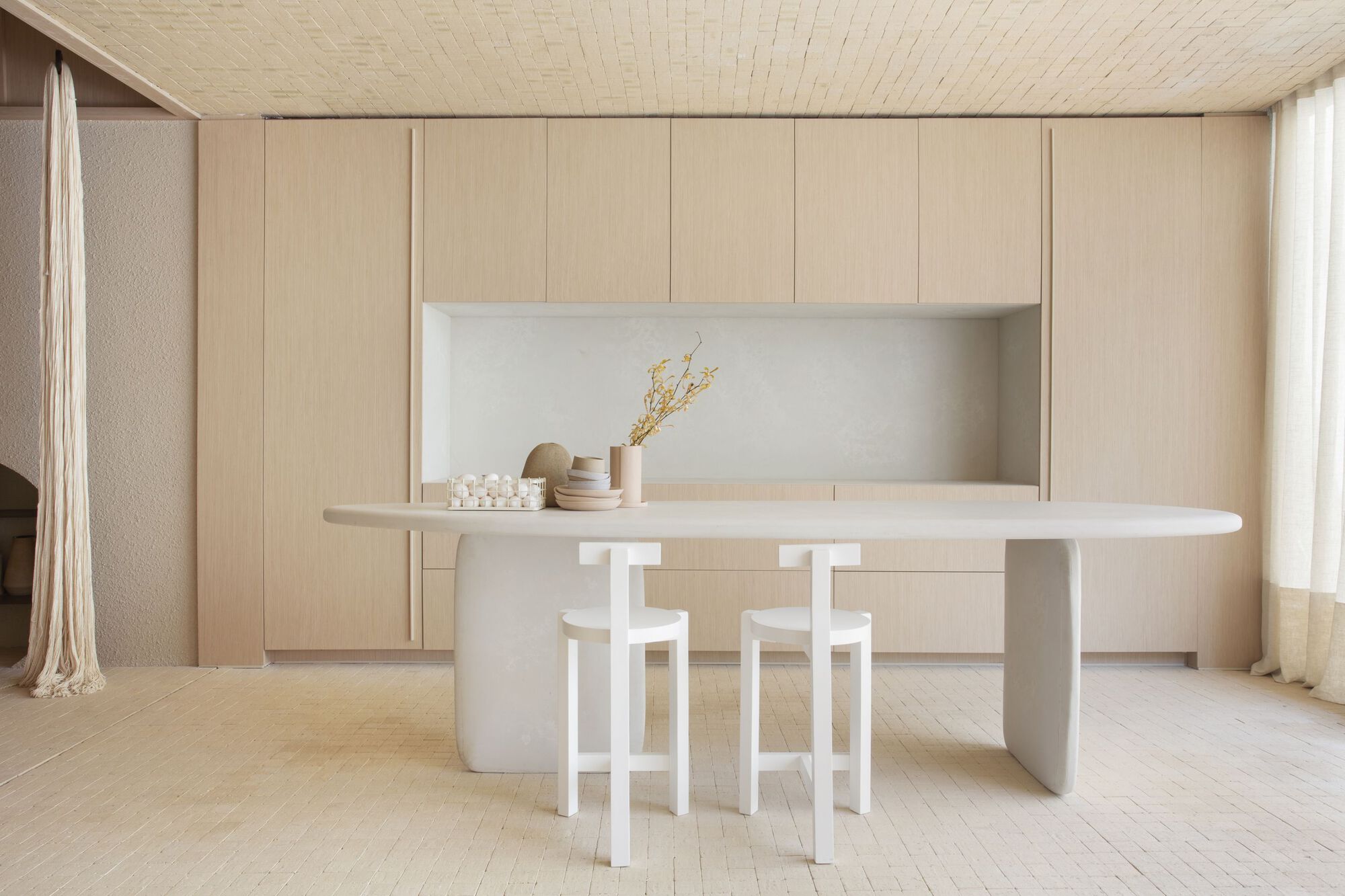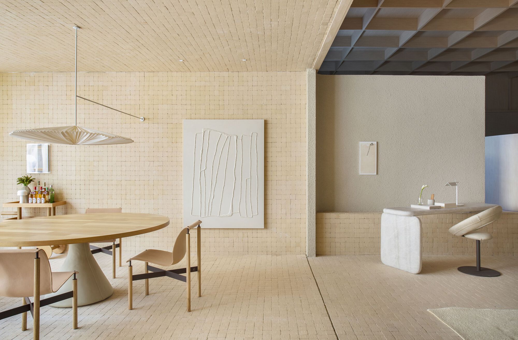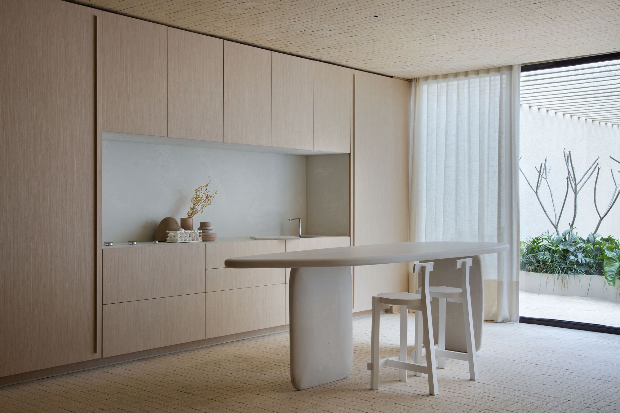 이 나무 천장 아래에 회색 계열의 색상을 배경으로 둥글둥글한 인테리어 아이템들을 배치하여 현대적인 미니멀리스트 공간으로 꾸몄다. 식당, 홈 오피스, 주방, 욕실 딸린 침실 등에 천연 재료가 광범위하게 사용되었다.