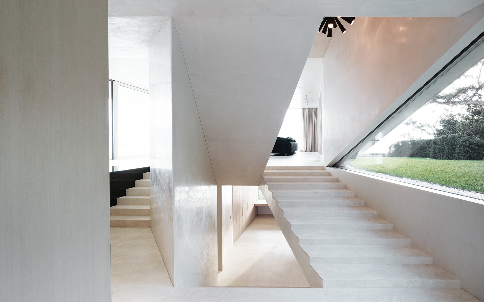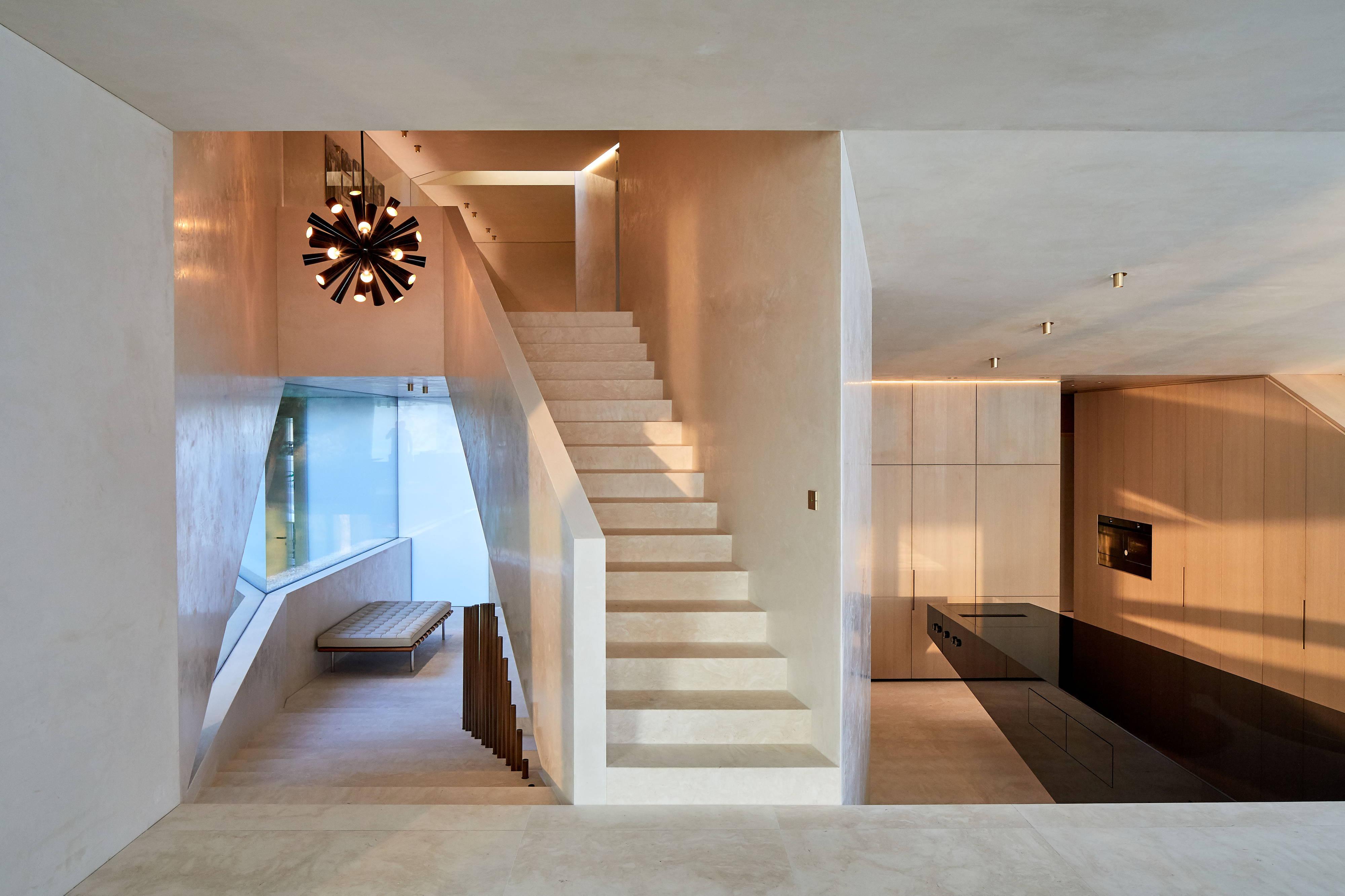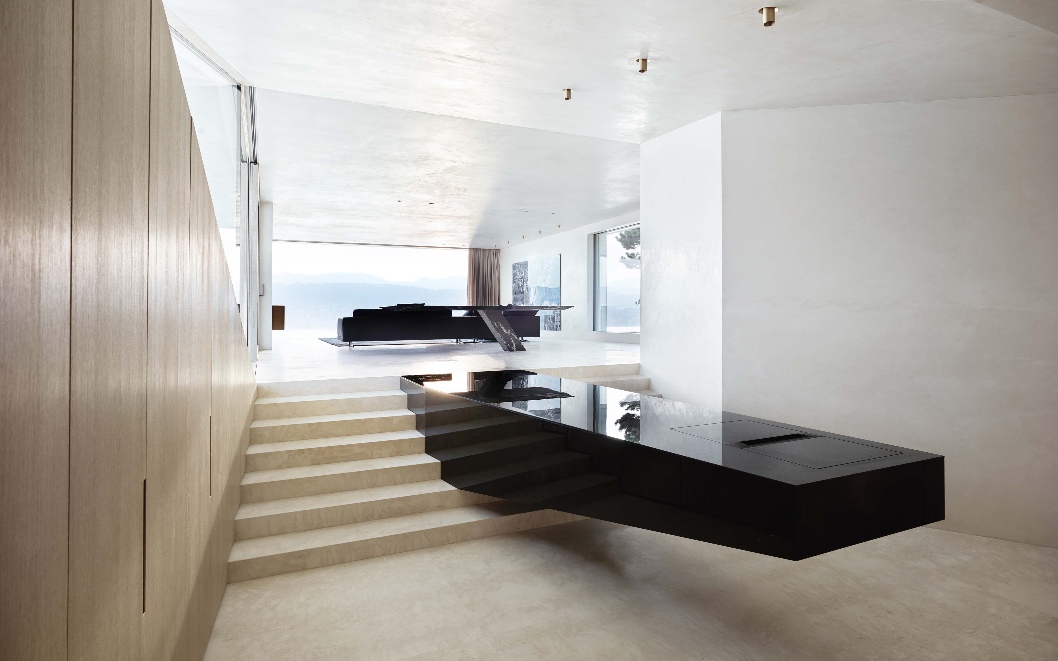 북측 입구를 통해 집 안으로 들어서면 맨 먼저 대형 계단을 통해 전망이 보인다. 한쪽으로 취리히 호수의 인상적인 전망이 있는 1층 거실로 오를 수 있는 계단이 있고, 다른 한쪽으로는 거실과 식당으로 이어진 넓은 계단에 캔틸레버 구조로 조리대가 설치되었다.