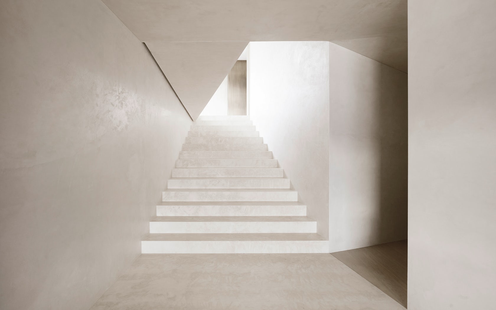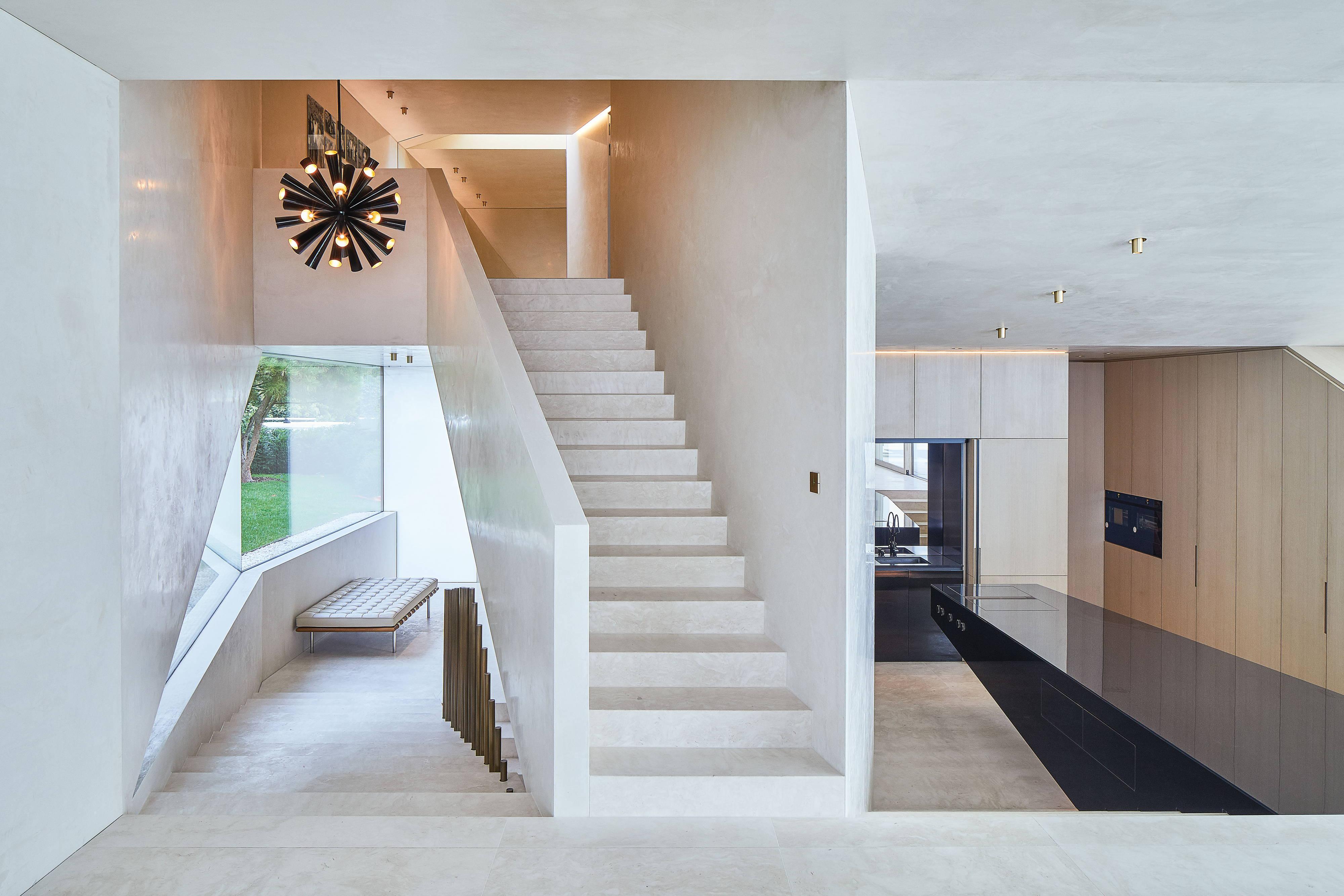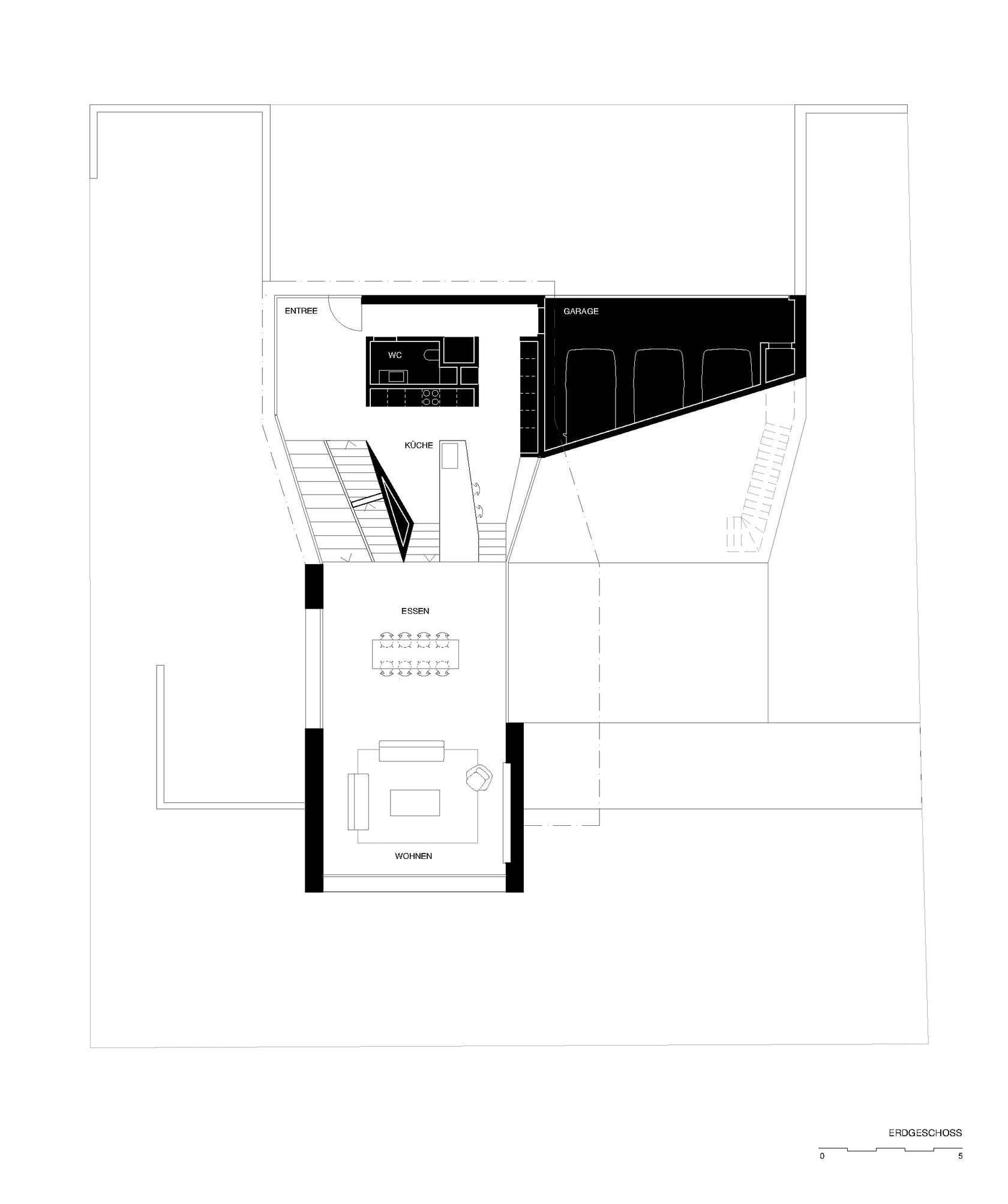 북측 입구를 통해 집 안으로 들어서면 맨 먼저 대형 계단을 통해 전망이 보인다. 한쪽으로 취리히 호수의 인상적인 전망이 있는 1층 거실로 오를 수 있는 계단이 있고, 다른 한쪽으로는 거실과 식당으로 이어진 넓은 계단에 캔틸레버 구조로 조리대가 설치되었다.