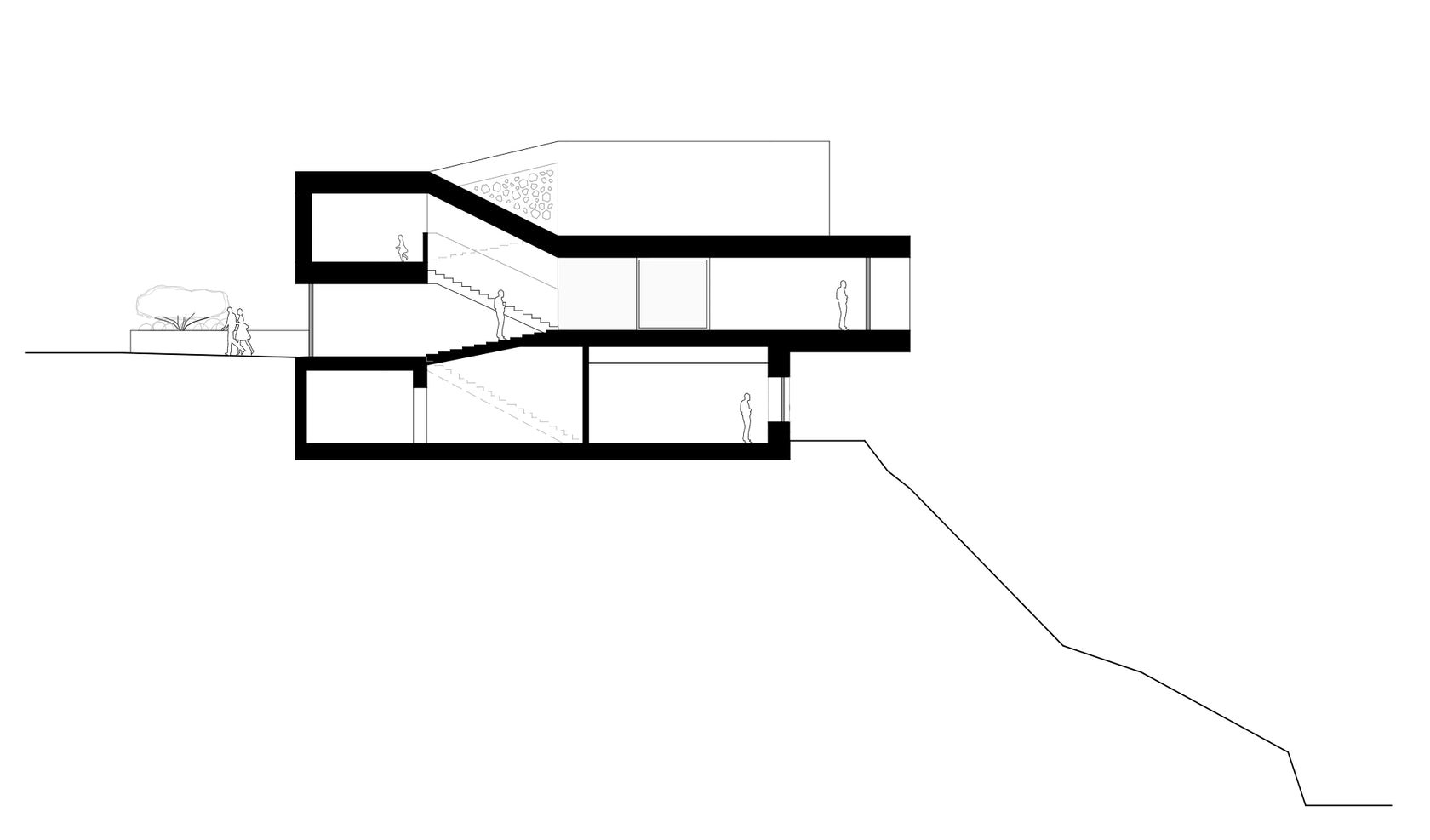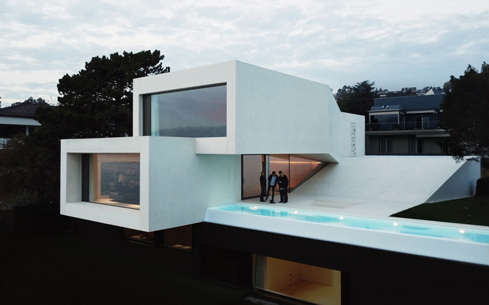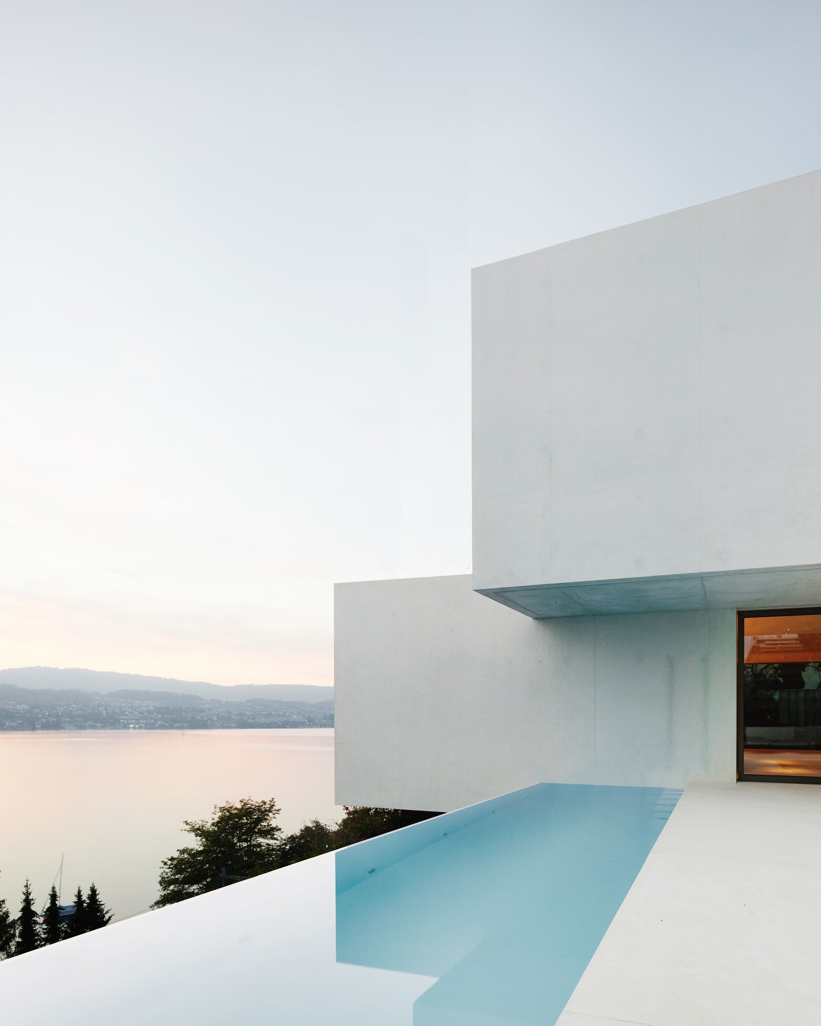 내부는, 널찍널찍한 공간들 사이가 넉넉한 크기의 계단으로 연결되었다. 환경적으로 프라이버시가 최대한 확보된 이 집은, 호수와 호수 건너 멀리 있는 그림 같은 알프스 풍경을 각기 다른 관점으로 즐길 수 있게 계획되었다. 수면이 호수의 수면과 이어져 있는 것처럼 보이도록 비탈 가장자리를 따라 설치한 야외 수영장도 인상적이다.