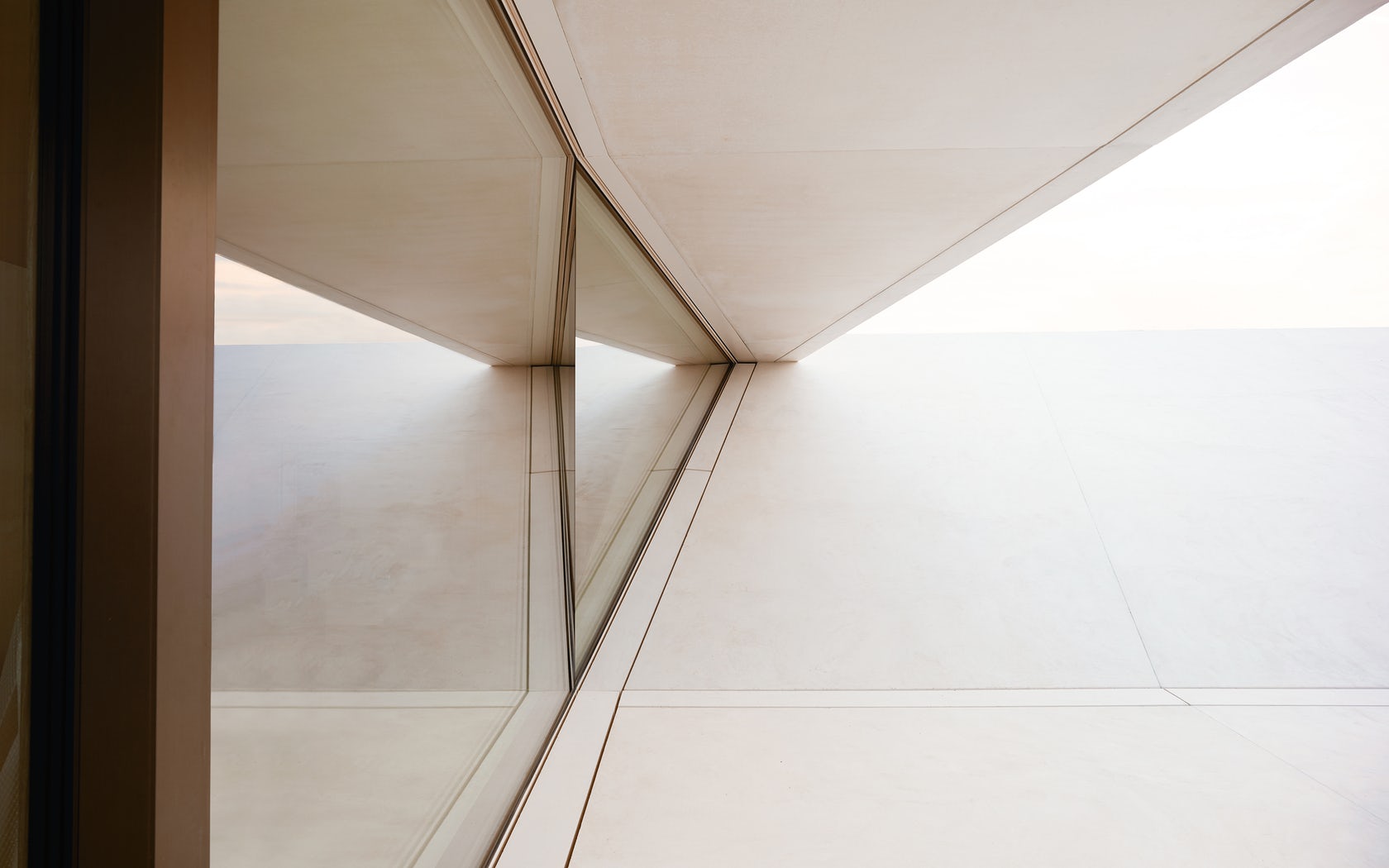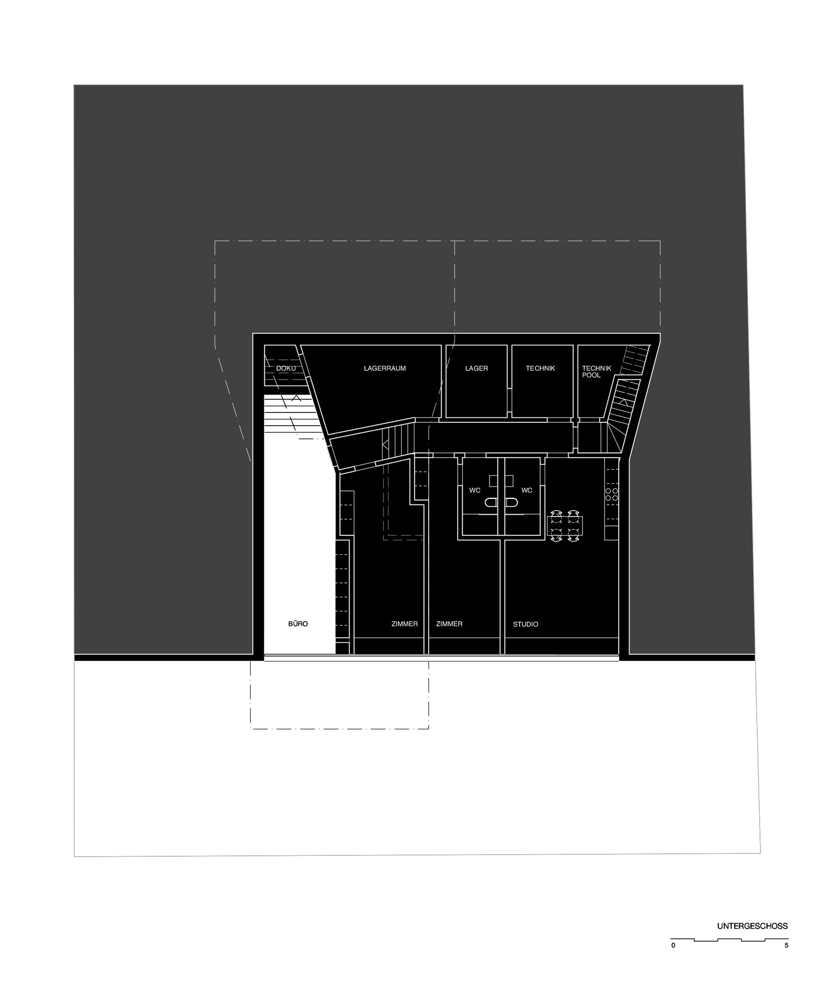 호수를 향한 남서 측 파사드가 대형 파노라마 창들로 개방적인 반면, Quartierstrasse를 향한 북동 측은 창이 설치되지 않은 폐쇄적인 파사드를 하고 있다.
