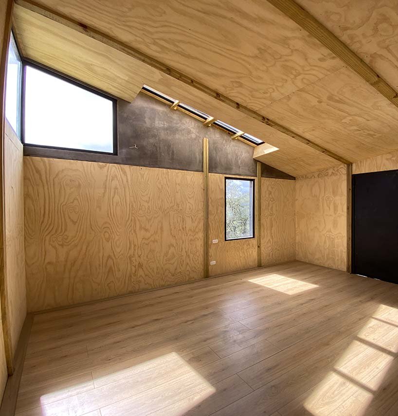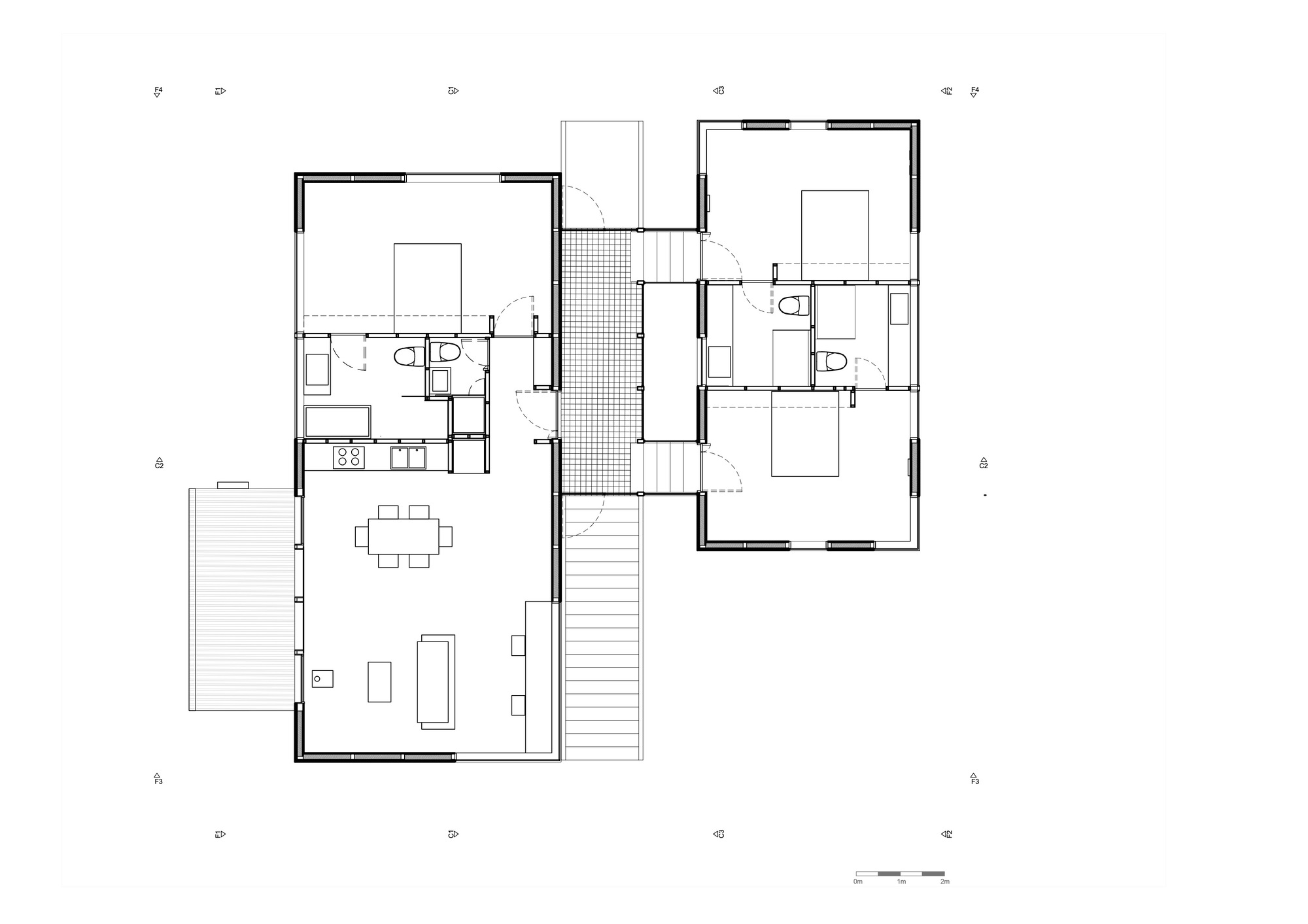 이 집은, 일광욕실로 연결된 두 개의 모듈로 이루어졌다. 메인 모듈에는, 식당과 주방을 포함한 개방형 거실, 마스터 침실과 욕실, 그리고 화장실이 배치되었다. 다른 모듈 하나에는 각각 욕실이 딸린 침실 두 개가 갖추어졌다.