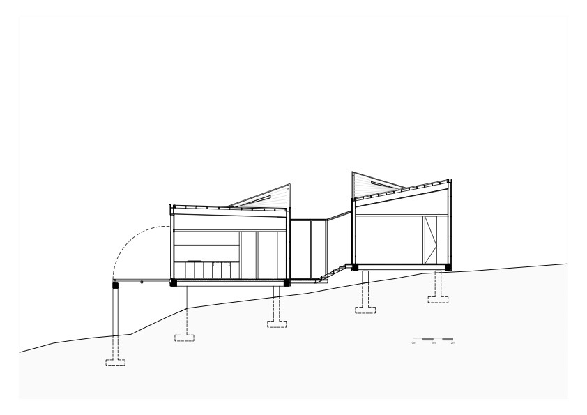 식물로 덮인 지표에 미치는 영향을 최소화하기 위해, 바닥 기초를 타설하지 않고 설치한 콘크리트 기둥 위에 집을 지었기 때문에, 물의 흐름이 막힘없이 원활하게 이루어진다. 기둥 위에, 조립식 OSB 벽체와 지붕 시스템을 통한 일련의 조립식 목재 포르티코가 설치ㆍ연결되었다. 조립식으로 지었기 때문에 시간과 폐기물이 줄어들었다. 중장비의 힘을 빌리지 않고 100% 수작업으로 조립할 수 있게 설계되기도 했다.