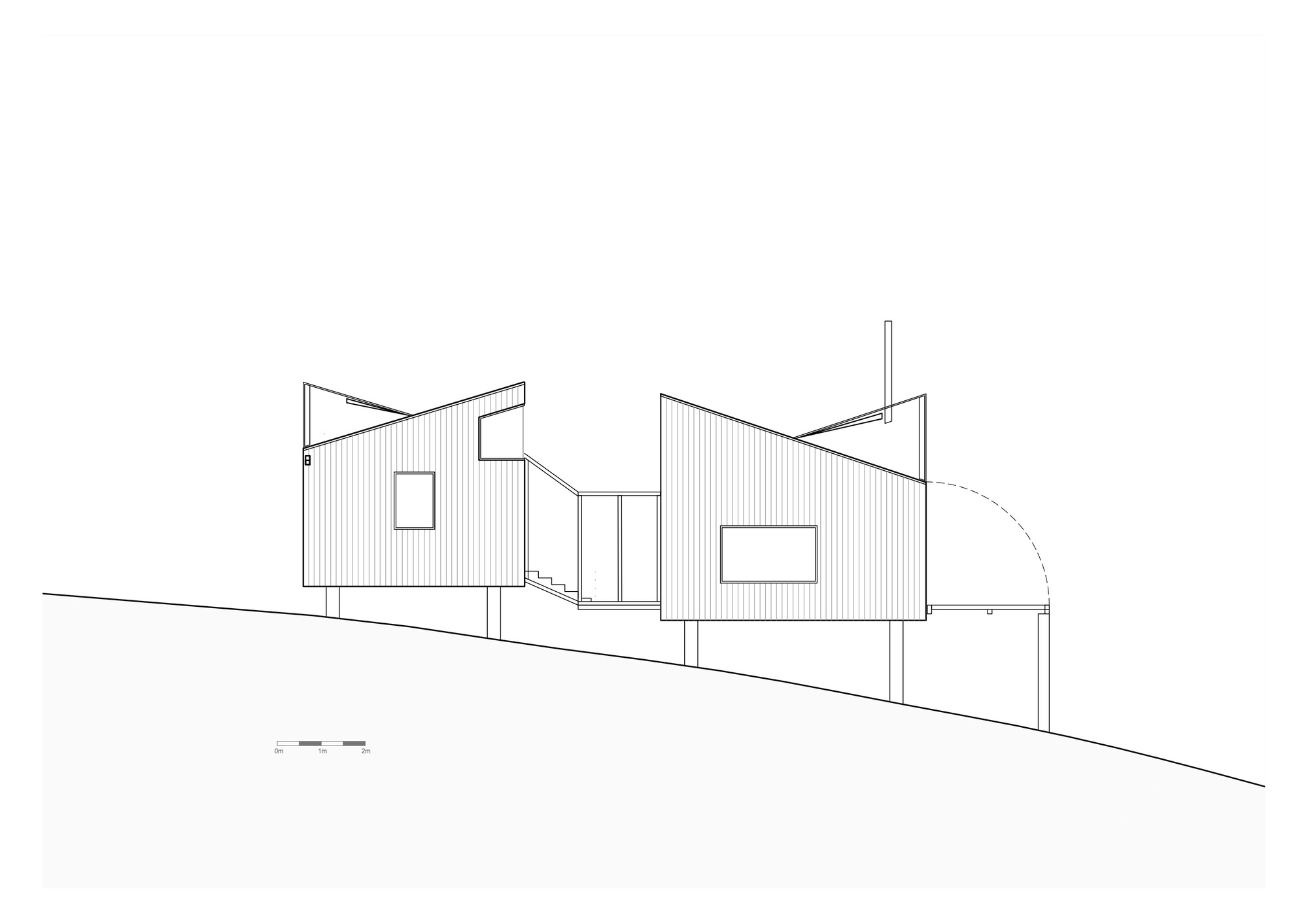 두 개의 모듈로 나눔으로써, 규모가 소형화되었을 뿐만 아니라 전망과 투명도가 다양한 파사드 여러 개를 가지게 되었다. 북쪽 전망을 향해 있는 거실은, 수동 체인 호이스트로 작동하는 도개교식 테라스를 통해서도 내부 공간을 외부로 확장할 수 있게 되어 있다.