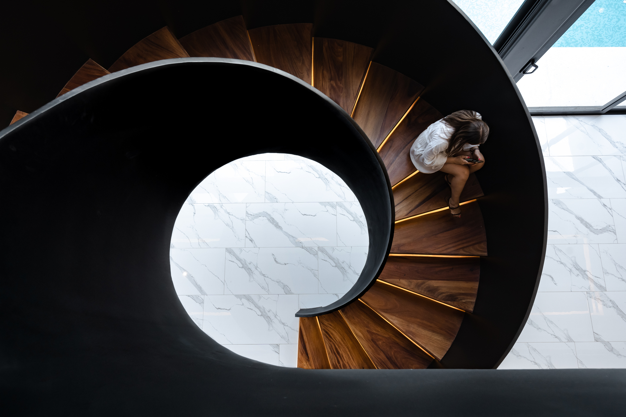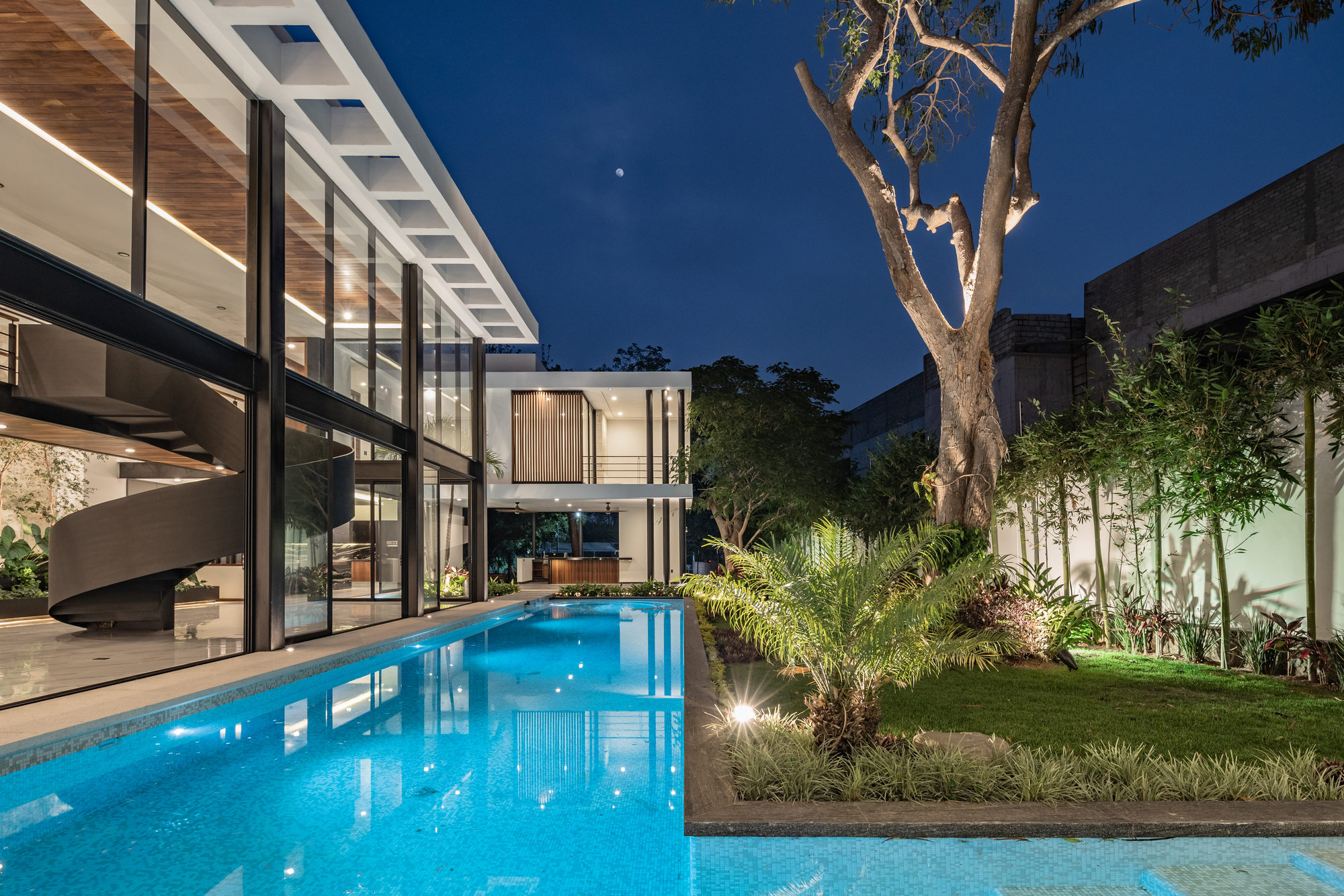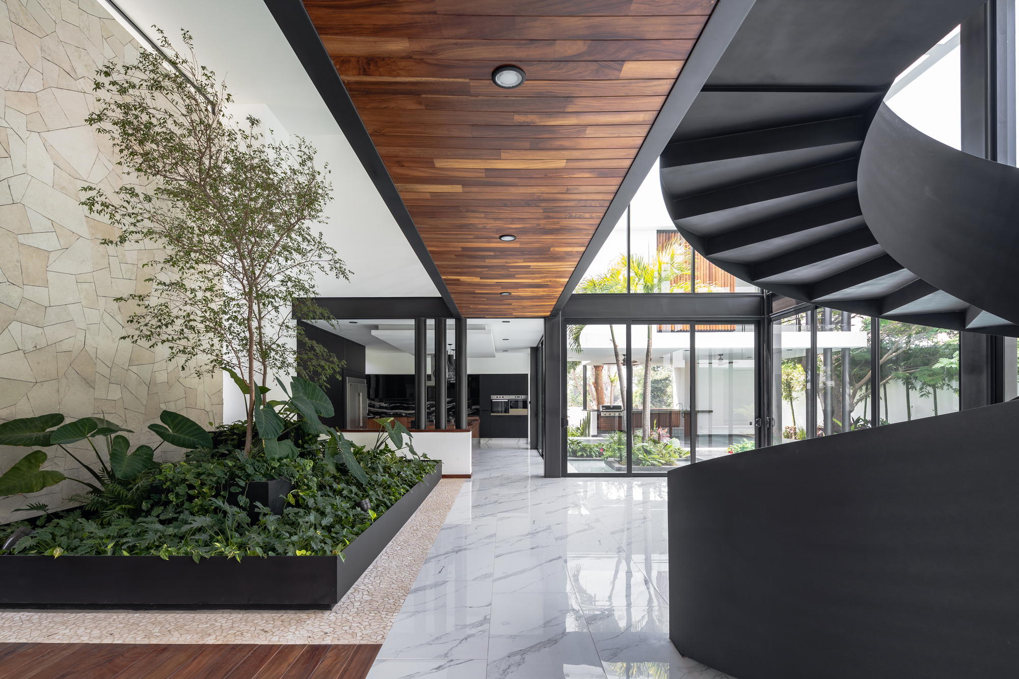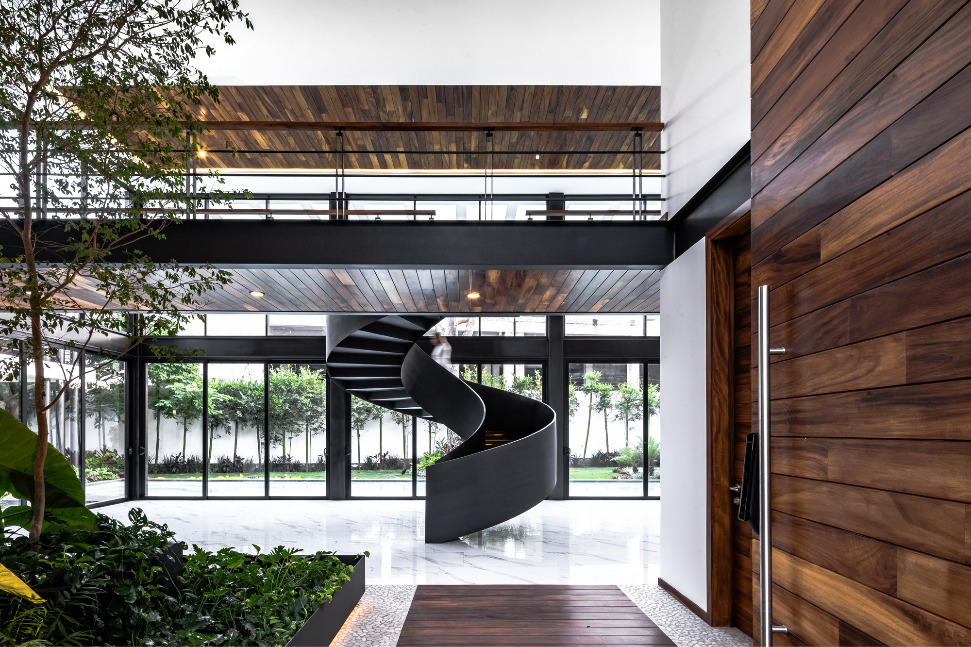 구조적 해법(브리지 지지)이자 빈 공간(무주 공간)을 만들기 위한 필수 요소인 동시에 조형적 요소이기도 한 인상적인 디자인의 강재 나선형 계단은, 검은색으로 칠해진 강 기둥 및 보와 같은 건축 구성 요소 사이의 조화를 꾀함으로써, 미학적으로 아름다운 집으로 만드는 데 결정적인 역할을 했다고 하겠다.