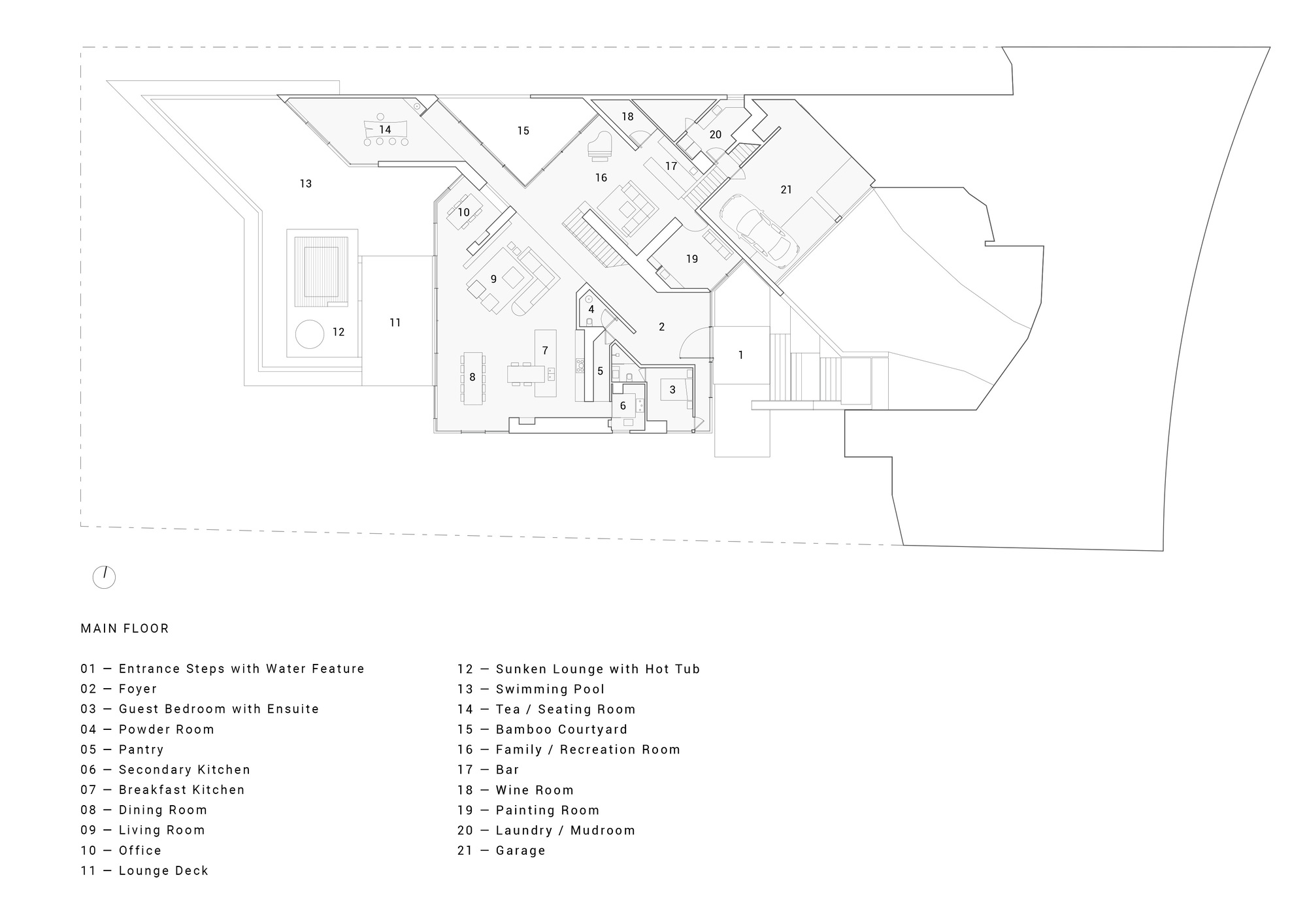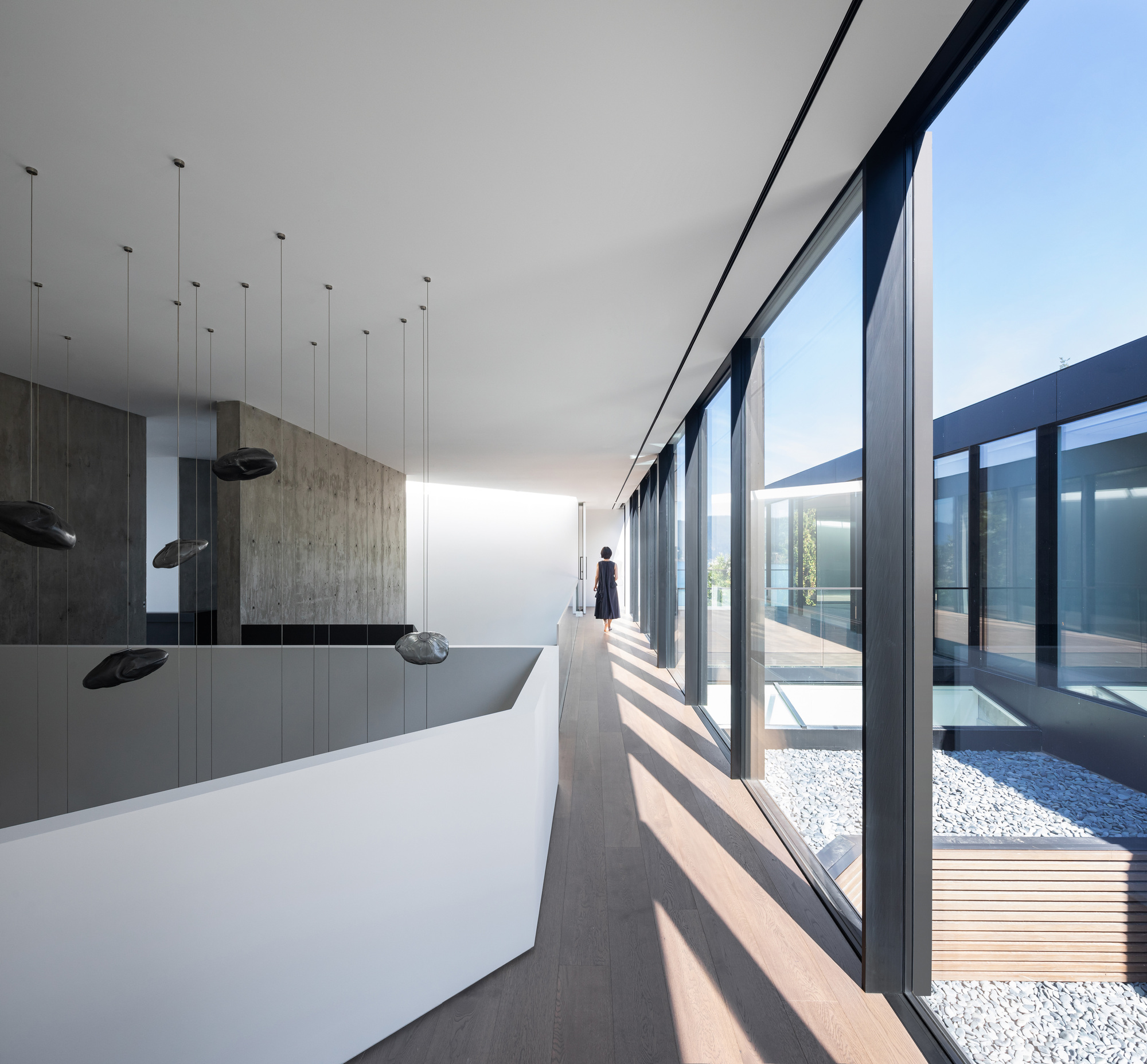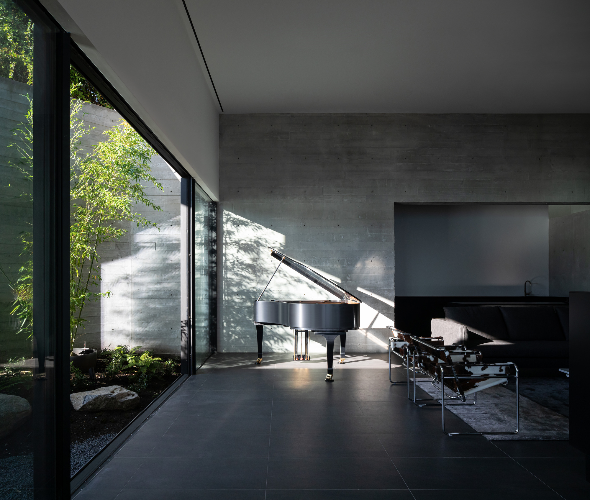 1층 거실은 야외 및 보조 공간들과 유기적으로 연결되었다. 개방형 거실 외에, 입구의 반사 연못 위에 떠 있는 화실, 대나무 중정이 딸린 가족실, 오피스, 복도 끝의 다실, 게스트 룸 등도 갖추어졌다. 그 밖에도, 온수 욕조, 성큰 라운지, 데크 등이 딸린 인피니티 풀이 매우 인상적인 캐나다 주택이다.