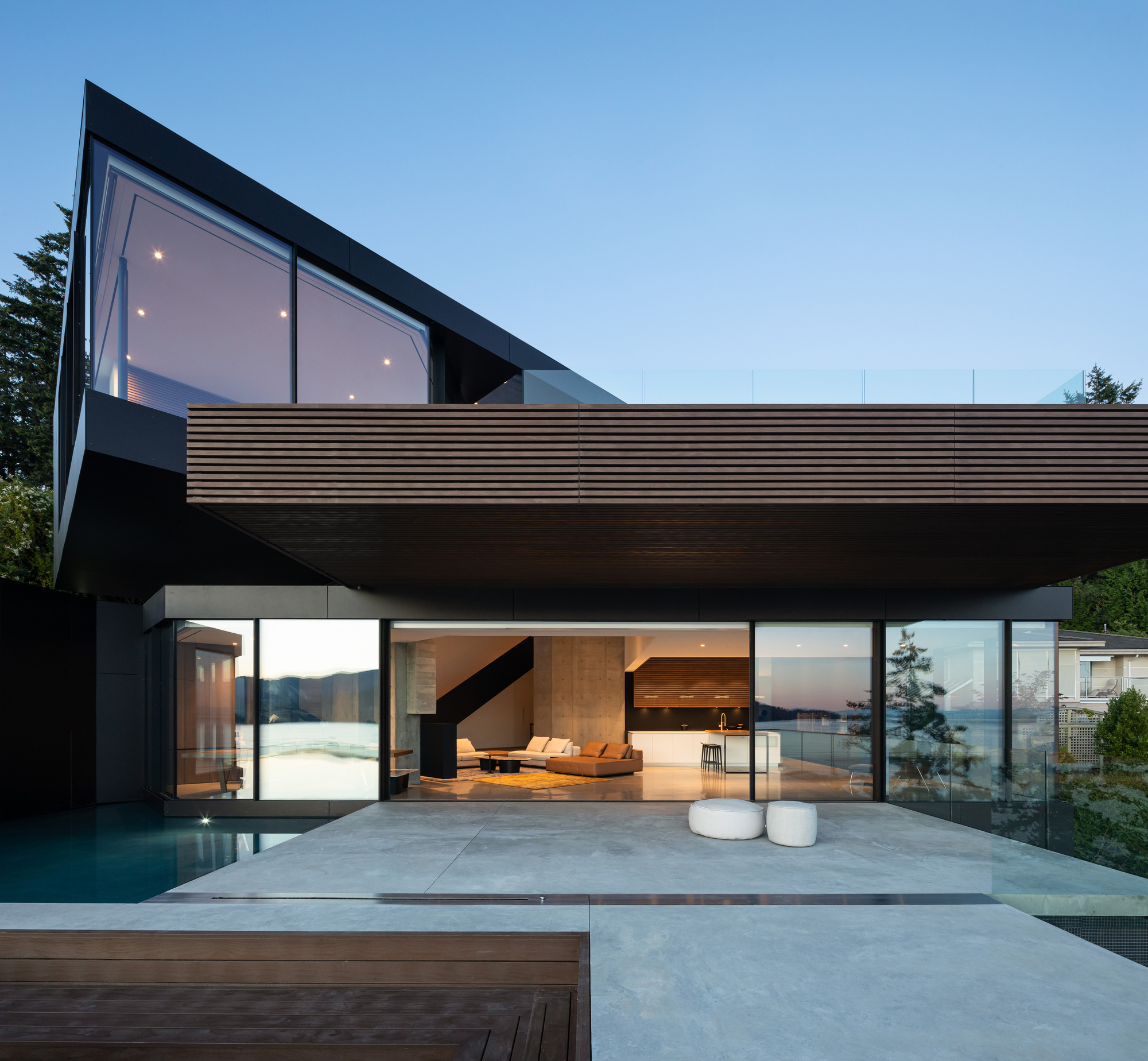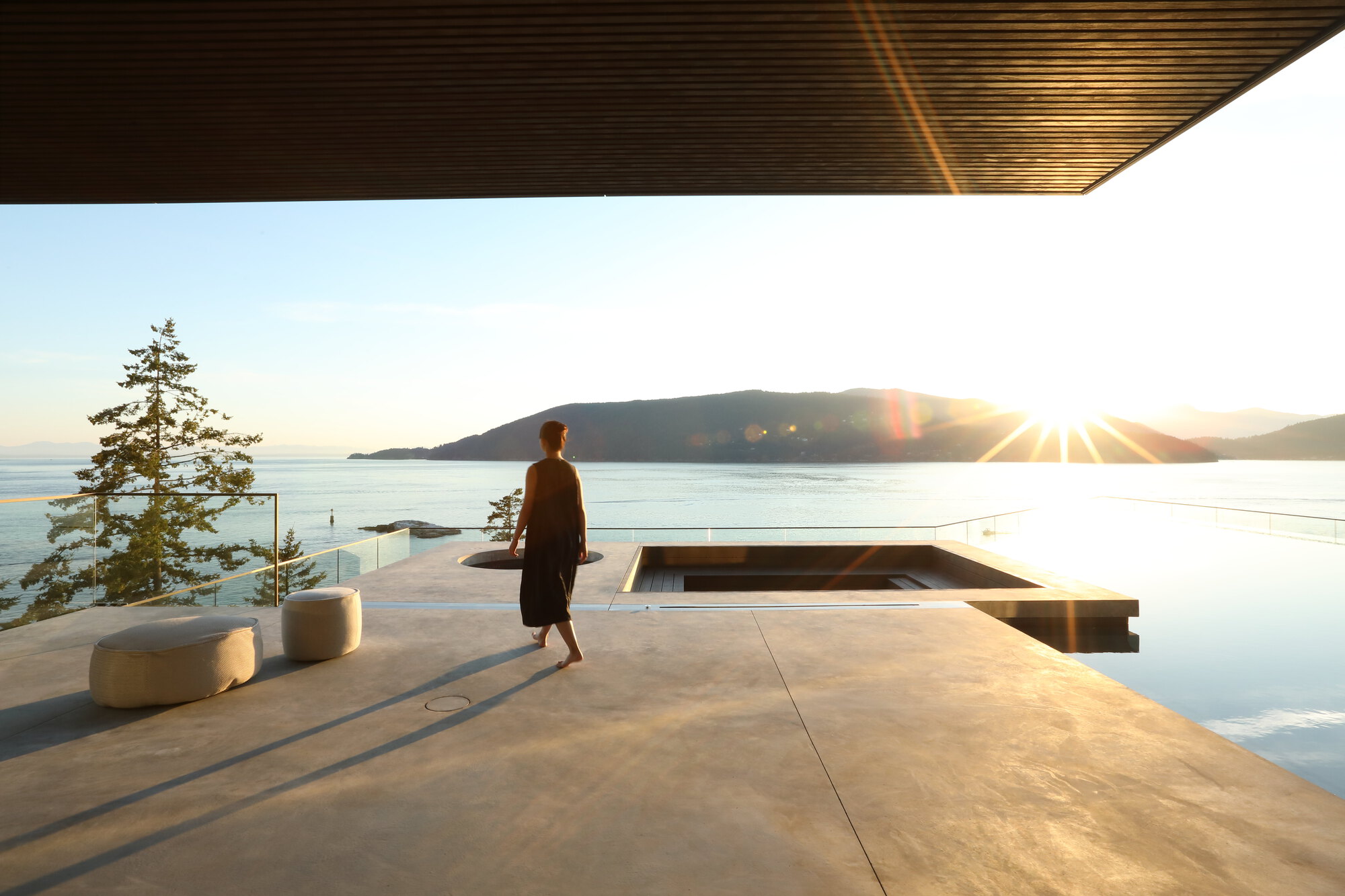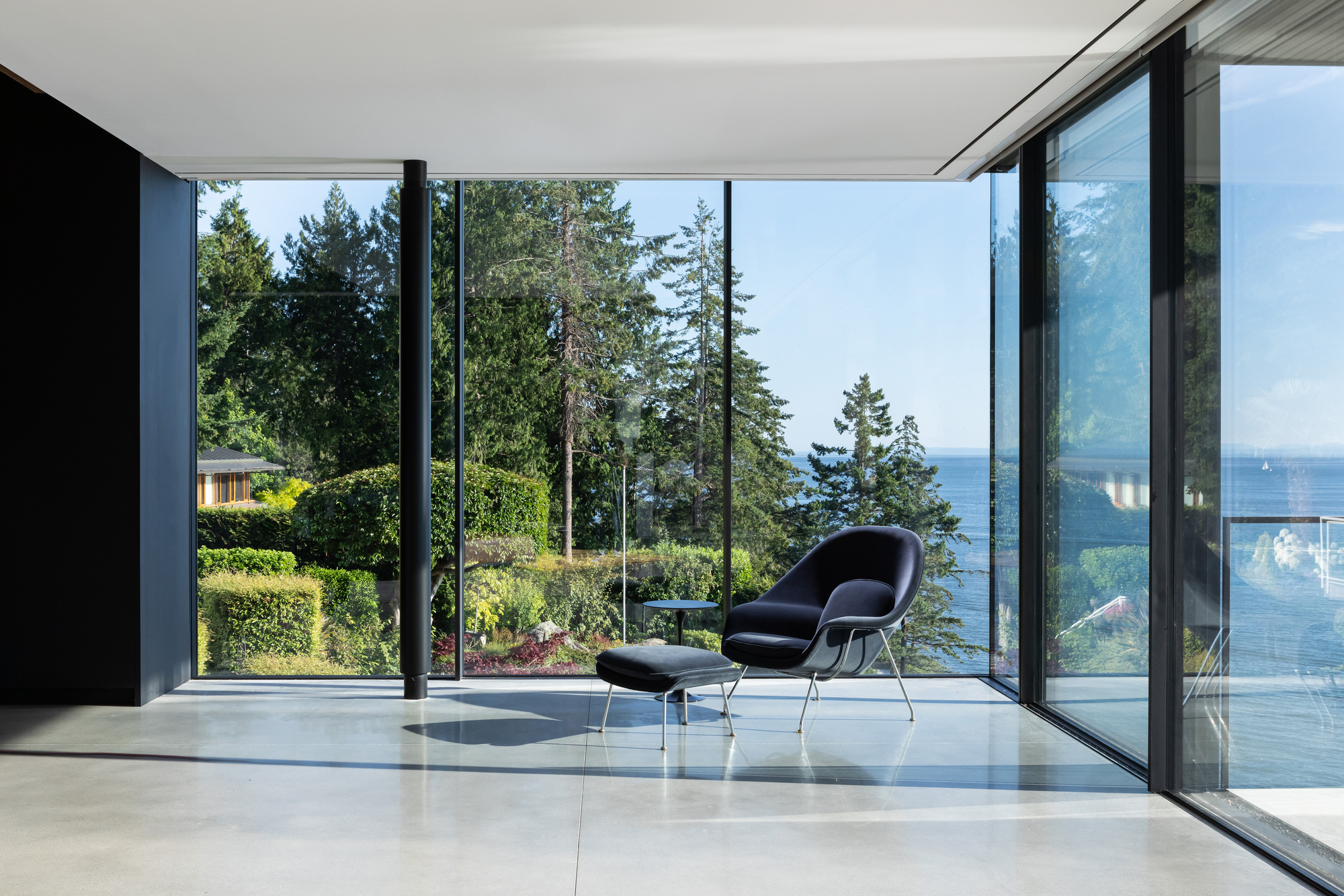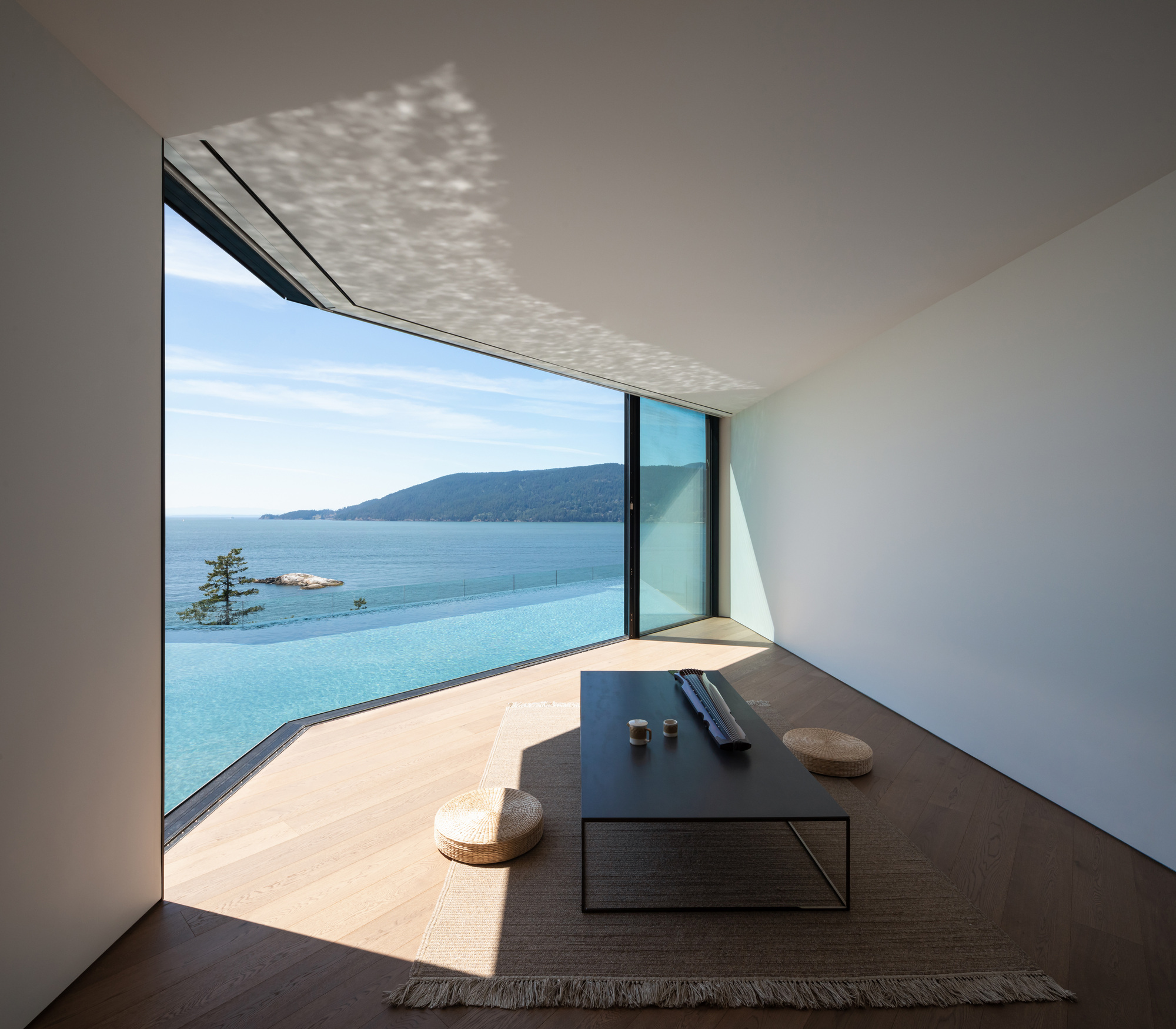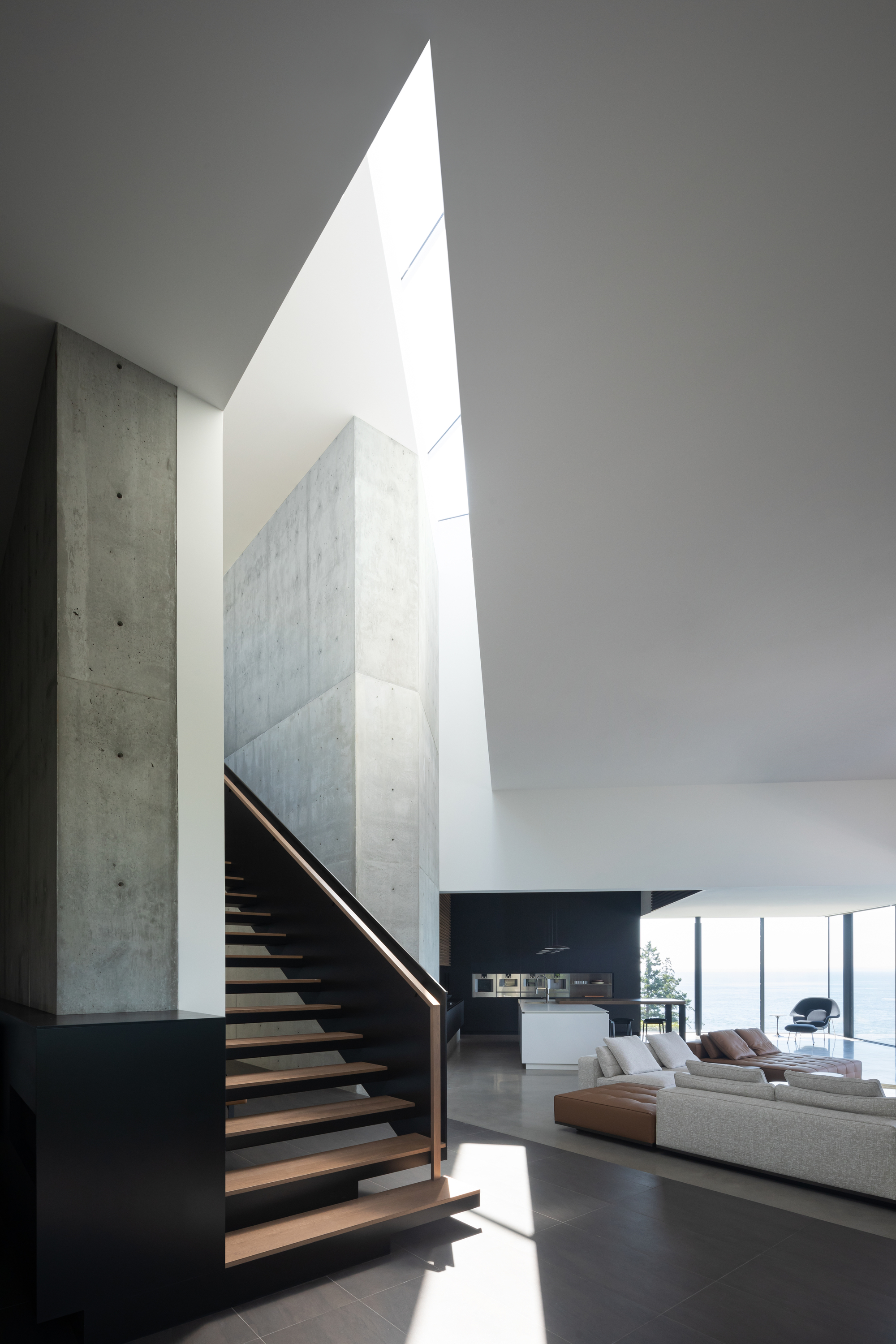이 집은, 남서향의 조망과 채광, 살리시해Salish Sea가 있는 서쪽으로 급격하게 떨어지는 절벽 등 독특하고 다양한 지형적 특징에서 받은 영감으로 디자인되었다. 남서향과 서향의 두 축을 기준으로 공간들을 배치하다 보니, 아래위층 사이의 교차점에서 공간의 기하학이 바뀌어서, 대지 중앙에 빈 공간이 생겨났다.