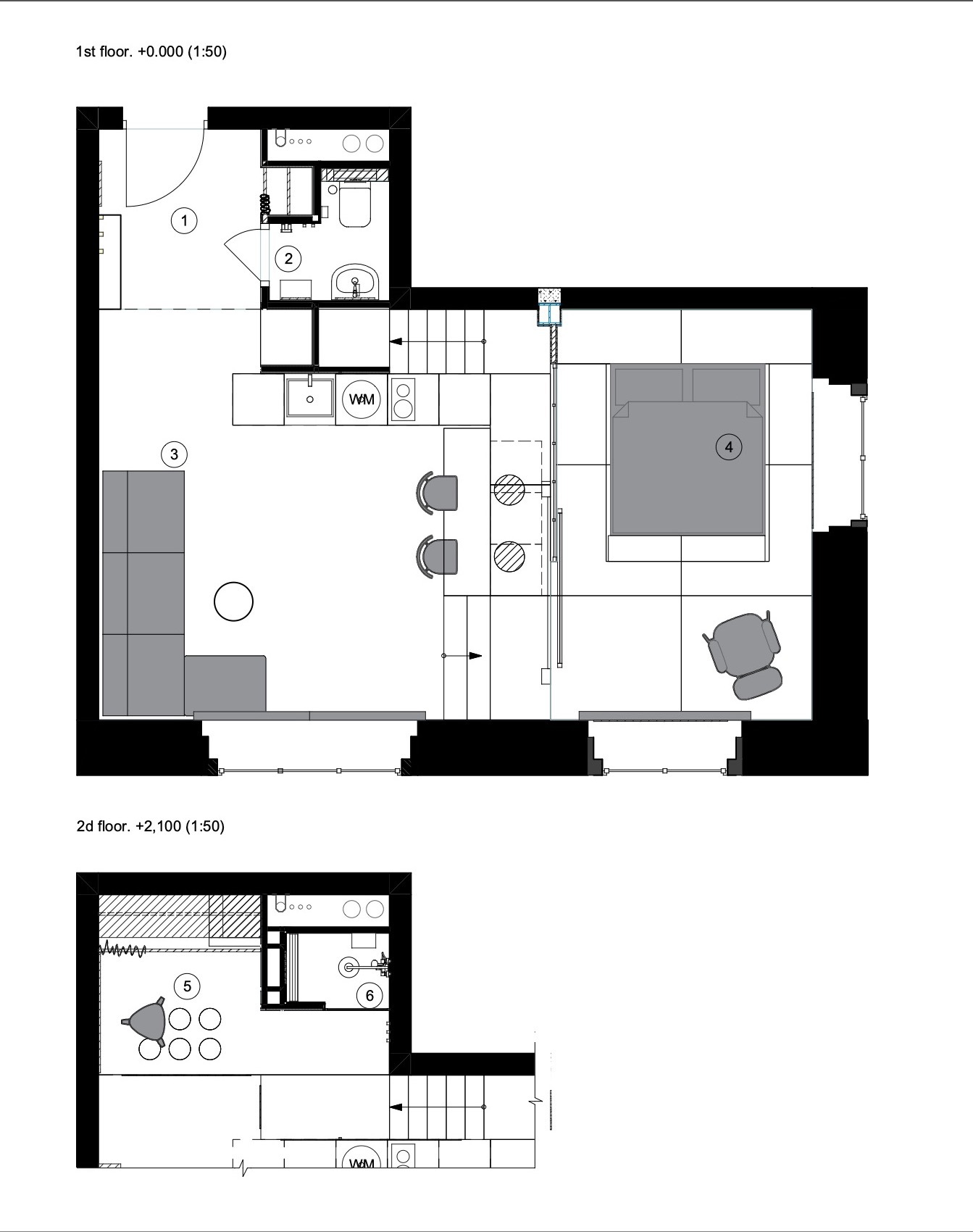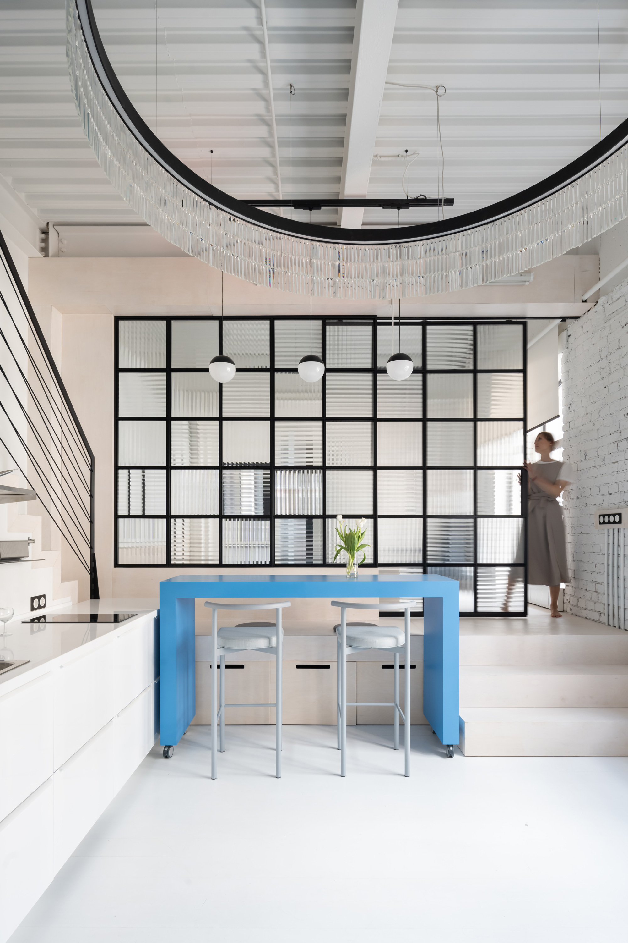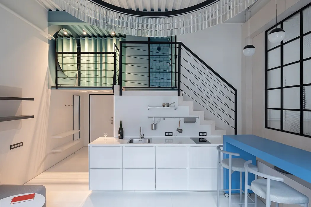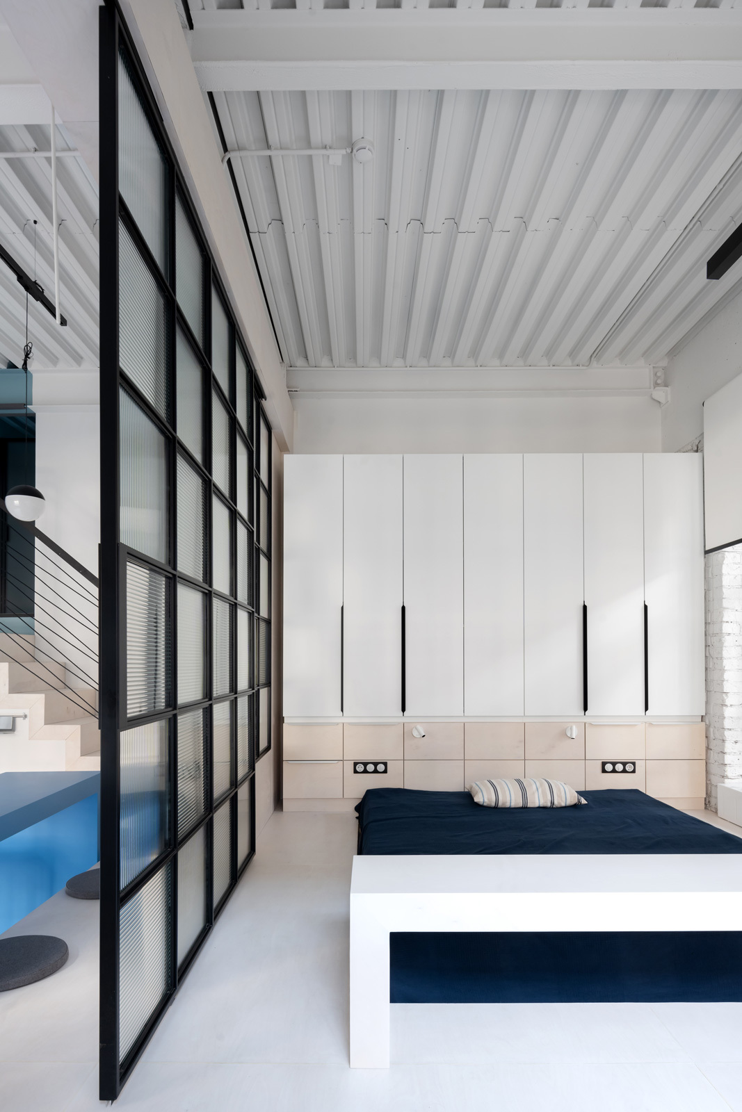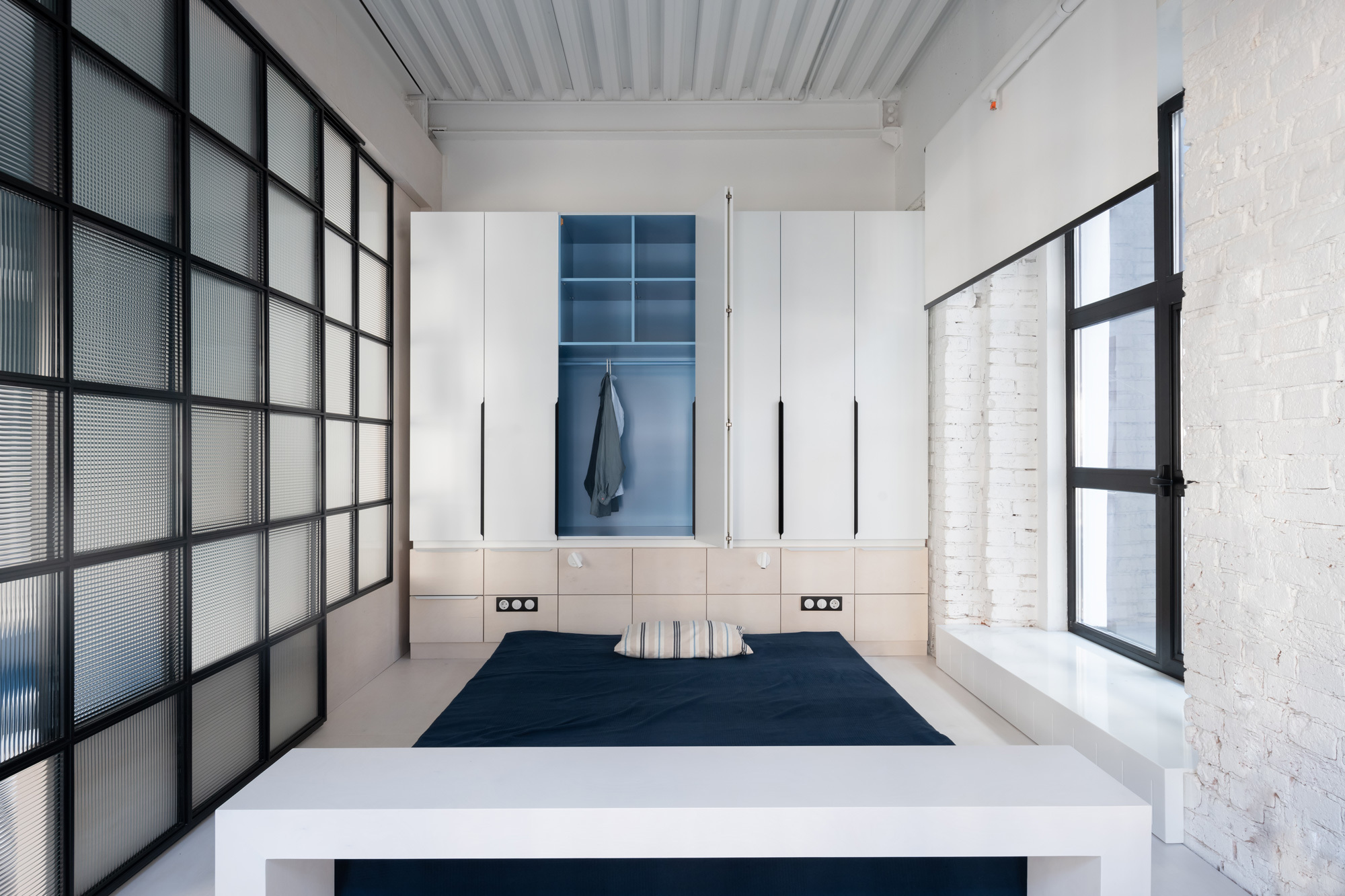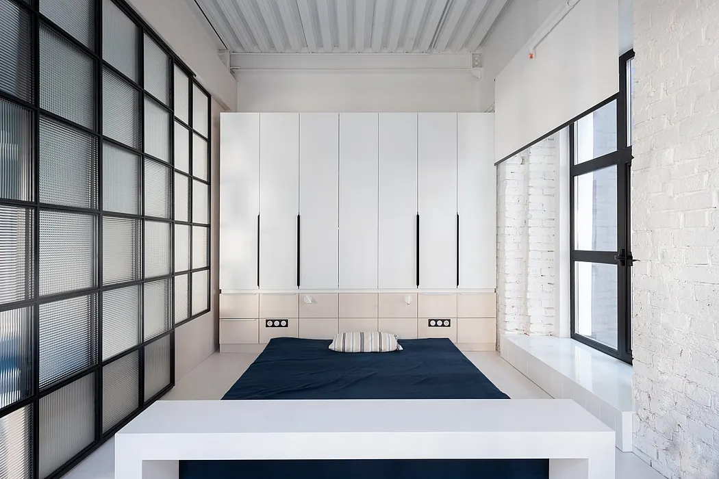 디자인팀의 해법은, 높은 천장고(4.3m)를 이용하여 다양한 레벨의 공간으로 만드는 것이었다. 가장 낮은 레벨의 공간에, 입구, 거실, 주방 등이 자리한다. 창턱 높이의 두 번째 레벨에 침실이 배치되었다. 그리고 세 번째 레벨에는 욕실과 드레스 룸이 갖추어졌다.