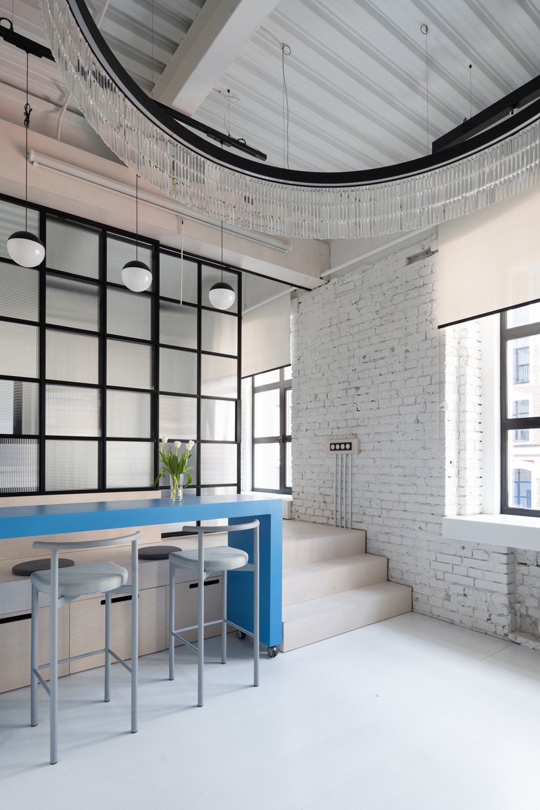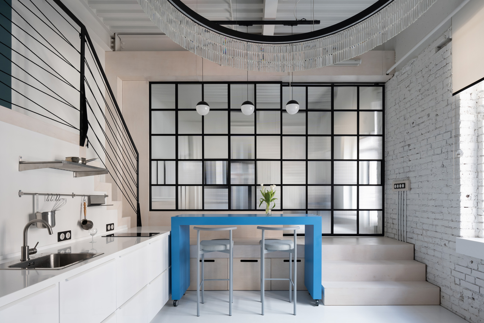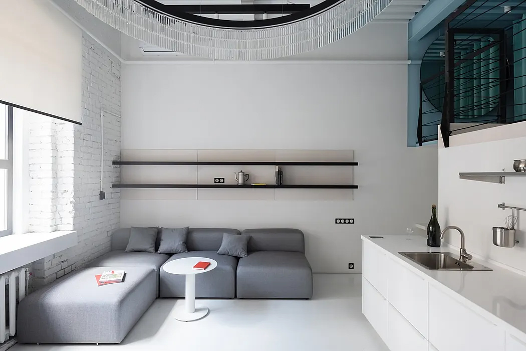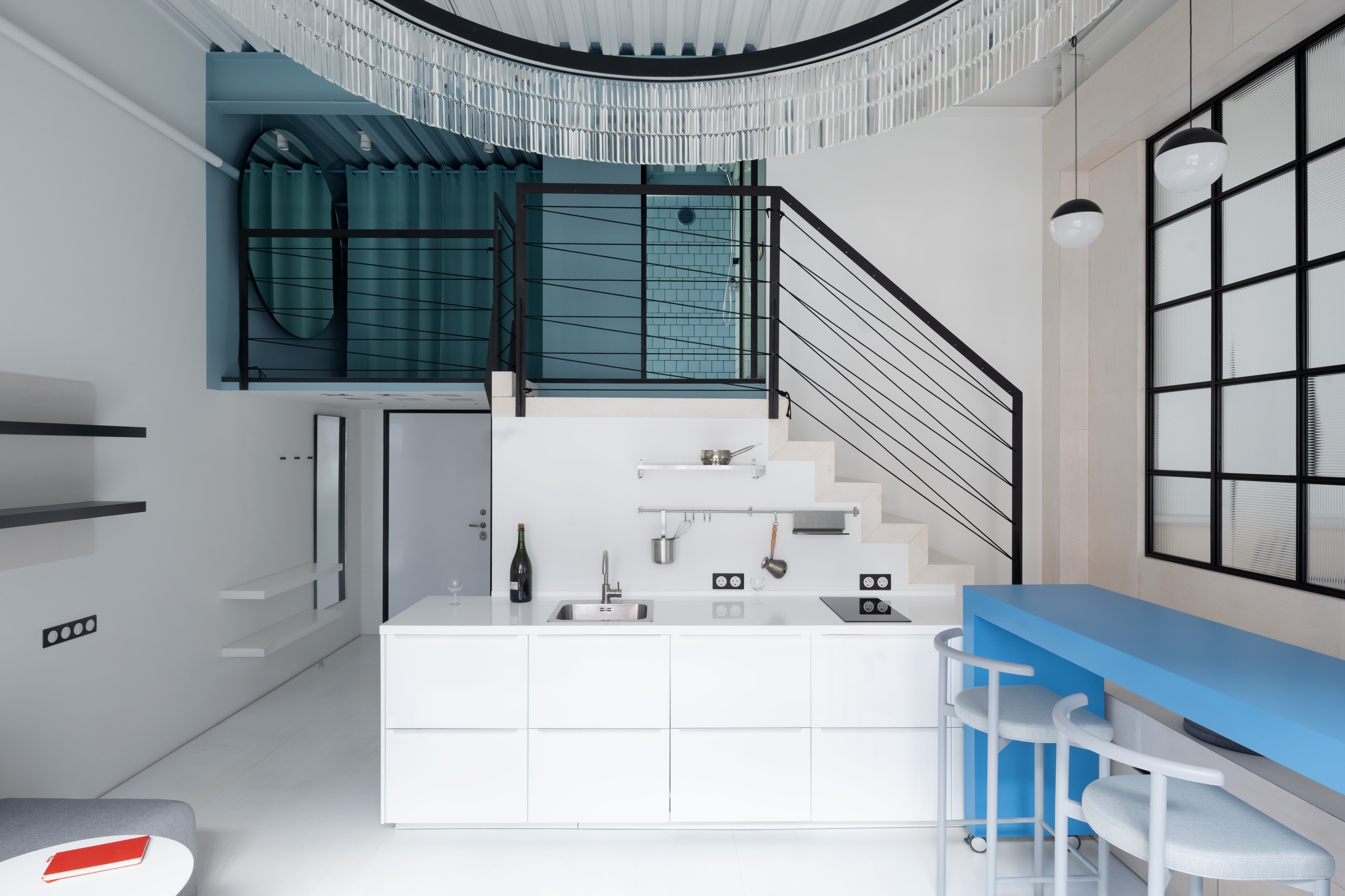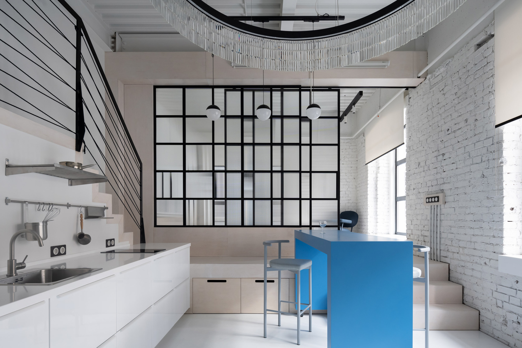 디자인팀의 해법은, 높은 천장고(4.3m)를 이용하여 다양한 레벨의 공간으로 만드는 것이었다. 가장 낮은 레벨의 공간에, 입구, 거실, 주방 등이 자리한다. 창턱 높이의 두 번째 레벨에 침실이 배치되었다. 그리고 세 번째 레벨에는 욕실과 드레스 룸이 갖추어졌다.