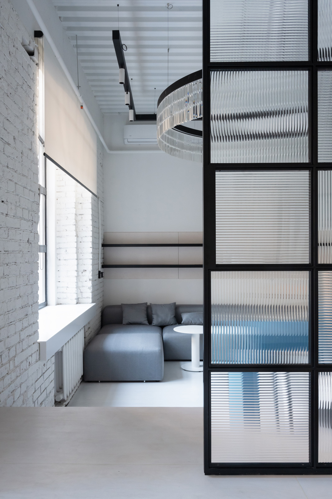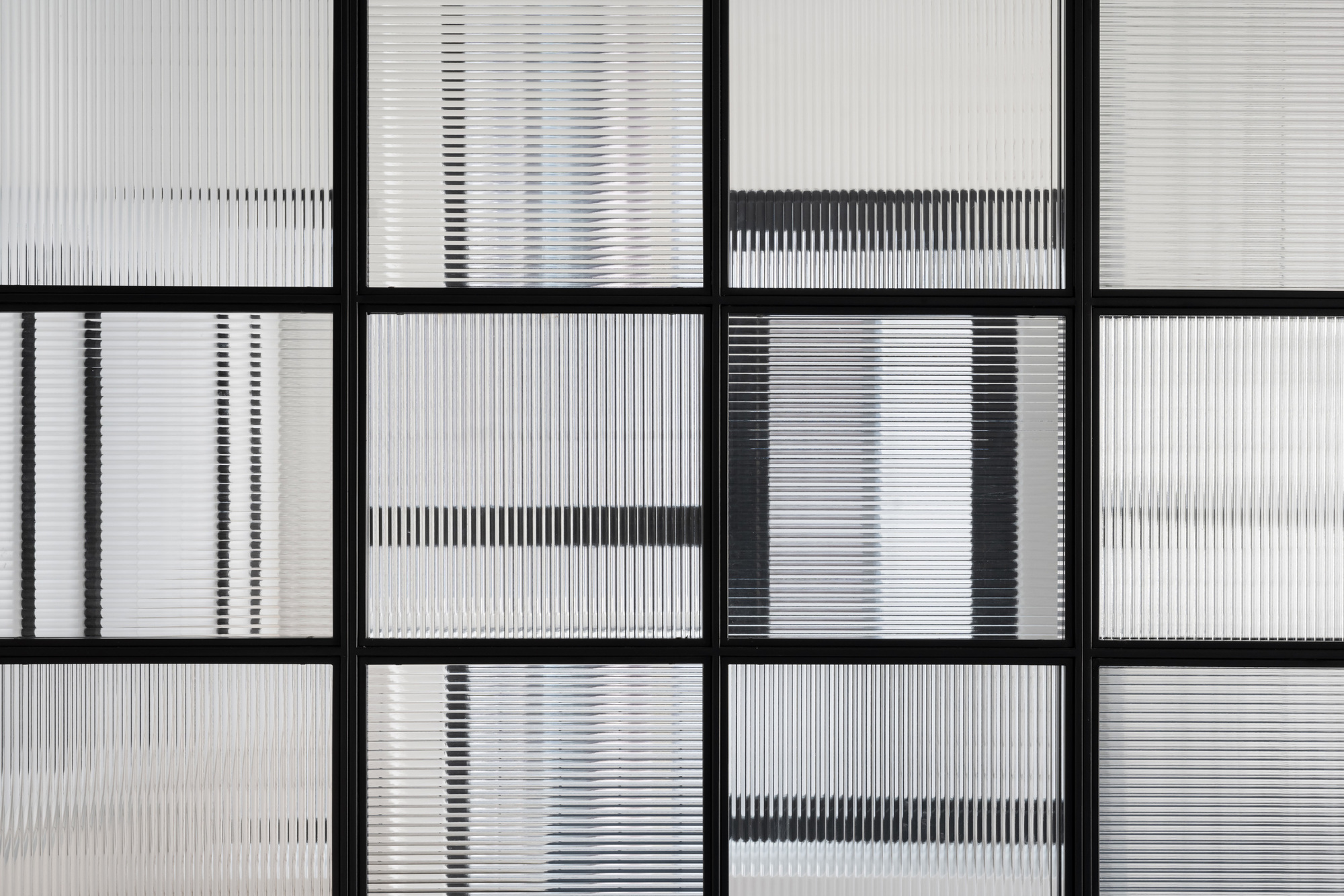 이 집 디자인의 핵심은, 격자 패턴의 슬라이딩 유리 파티션이다. 문을 열고 닫을 때마다 특별한 광학 효과가 만들어지도록, 요철 줄무늬 유리의 방향이 가로 세로로 번갈아 설치되었다.