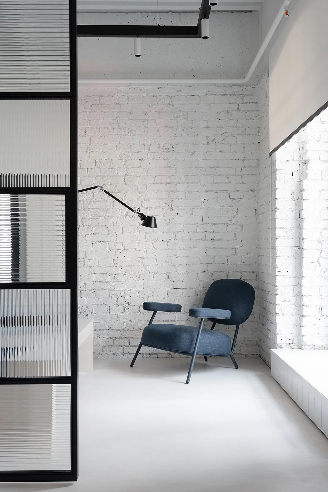 색상은, 흰색을 배경으로, 침실 파티션 프레임, 계단 난간, 조명, 전기 액세서리, 테이블 등에 파란색과 검은색을 사용하여 포인트를 주었다.