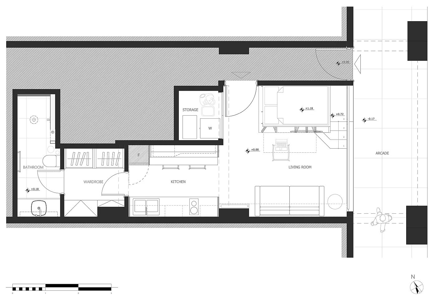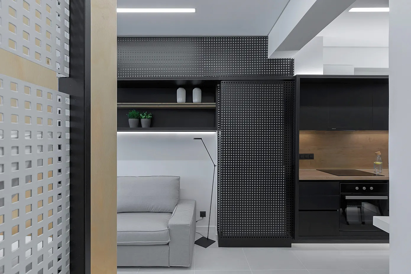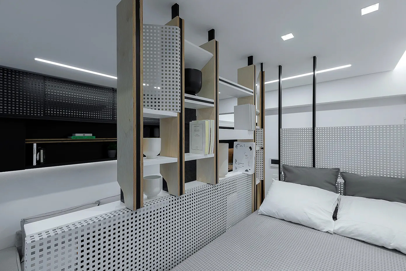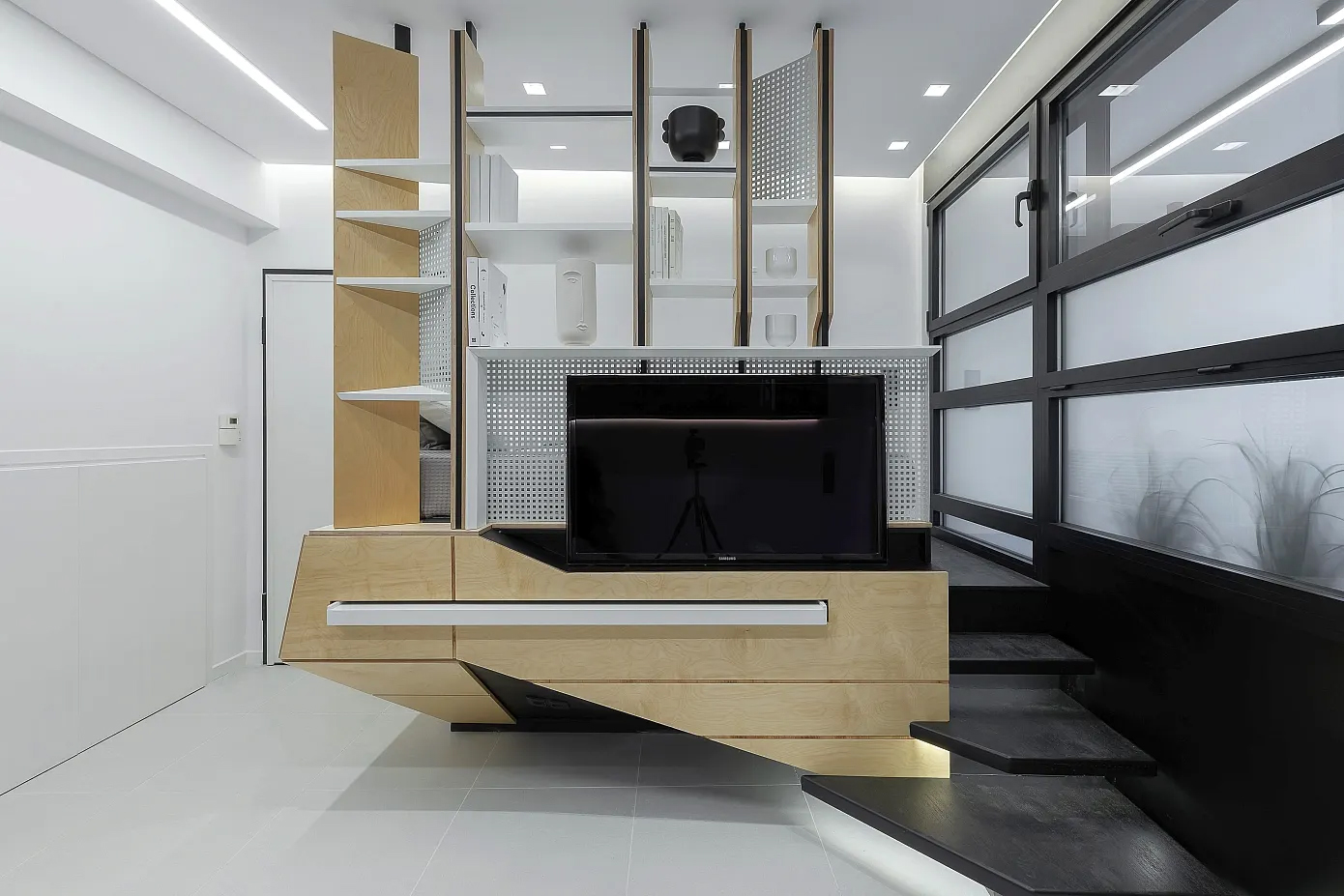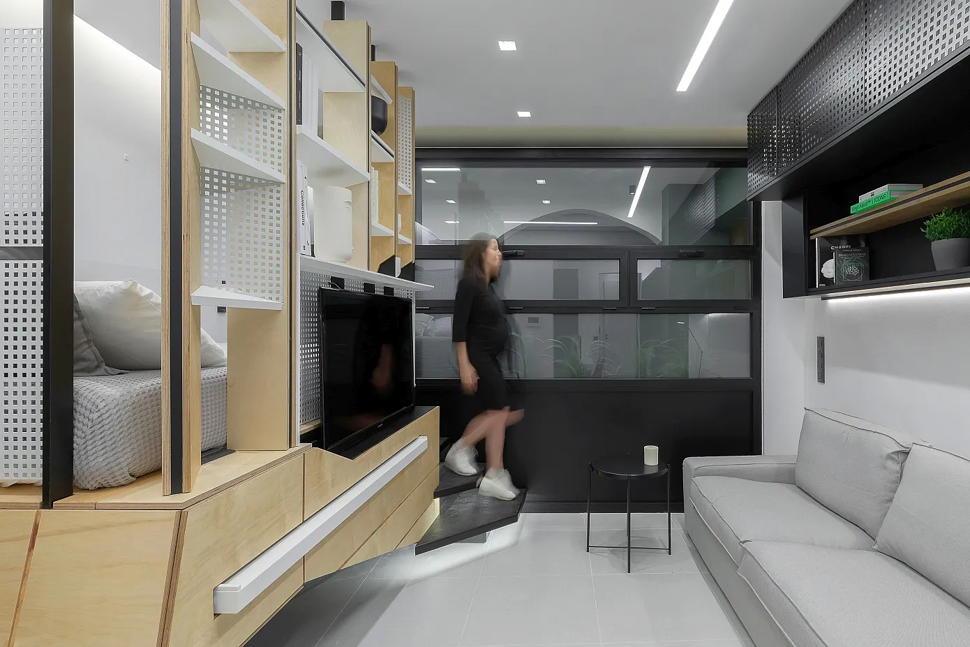 모든 기능들이 그대로 드러나 있다. 매트리스를 놓는 것으로 침실이 되었고, 책상은 자체로 서재가 되었으며, 소파가 거실을 대신한다. 거실과 침실 사이에 특별 제작한 다용도 책장이 설치되었다. 나무, 철재 타공판 등 질감이 다양한 재료를 사용하여 거실에 재미를 더했다. 그리고 주방, 드레스 룸, 욕실이 거실 옆으로 줄지어 배치되었다.
