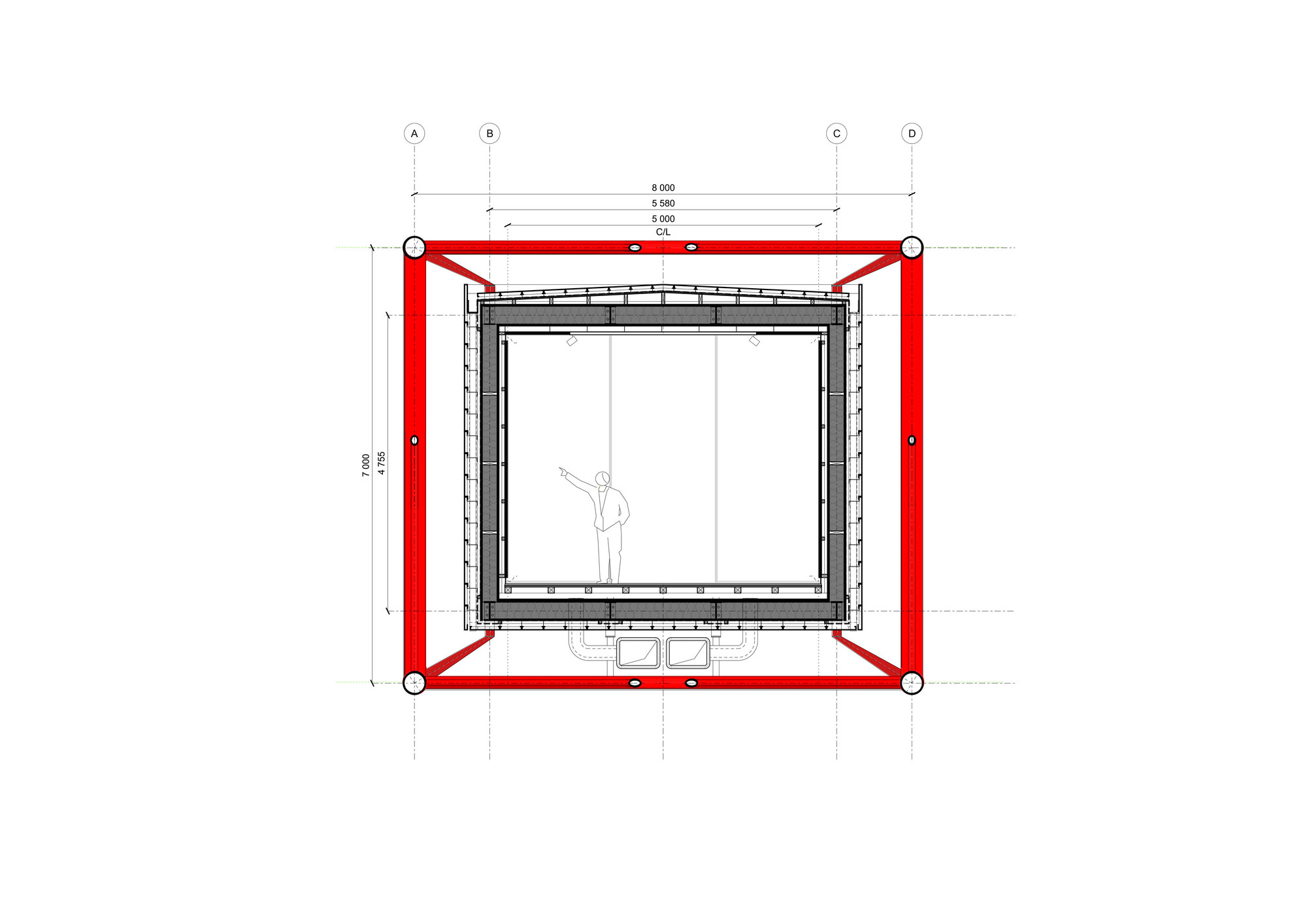 풍경을 액자화하고 싶은 욕망에 따라 전고, 전폭에 걸친 5m x 4m 크기의 통창이 끝에 설치된 하나의 흰색 갤러리 공간을, 골조로 감싸는 형태로 지어졌다. 그 결과 시각적으로 임팩트 강한 건물이 되었다.