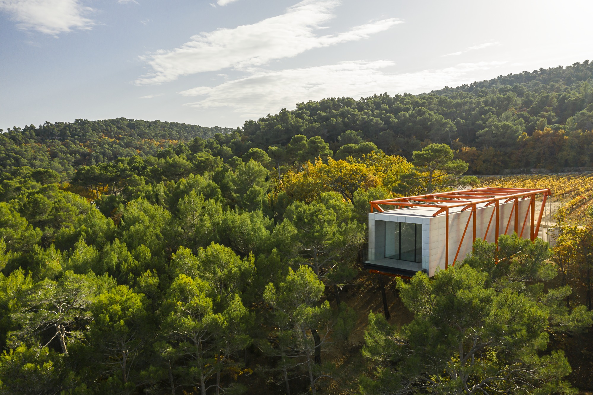 “샤토 라 코스트 포도원과 뤼베롱Luberon 산 너머까지 볼 수 있게 만들고 싶었습니다.” RSHP 소속의 Stephen Spence의 설명이다. “그렇게 하려면, 말 그대로 나무 꼭대기 위로 ‘솟은’ 건물이 되어야 했습니다. 하지만, 바라보는 방향이 나무가 우거진 가파른 능선이었기 때문에 구조적으로 보다 혁신적인 솔루션을 필요로 했습니다.”