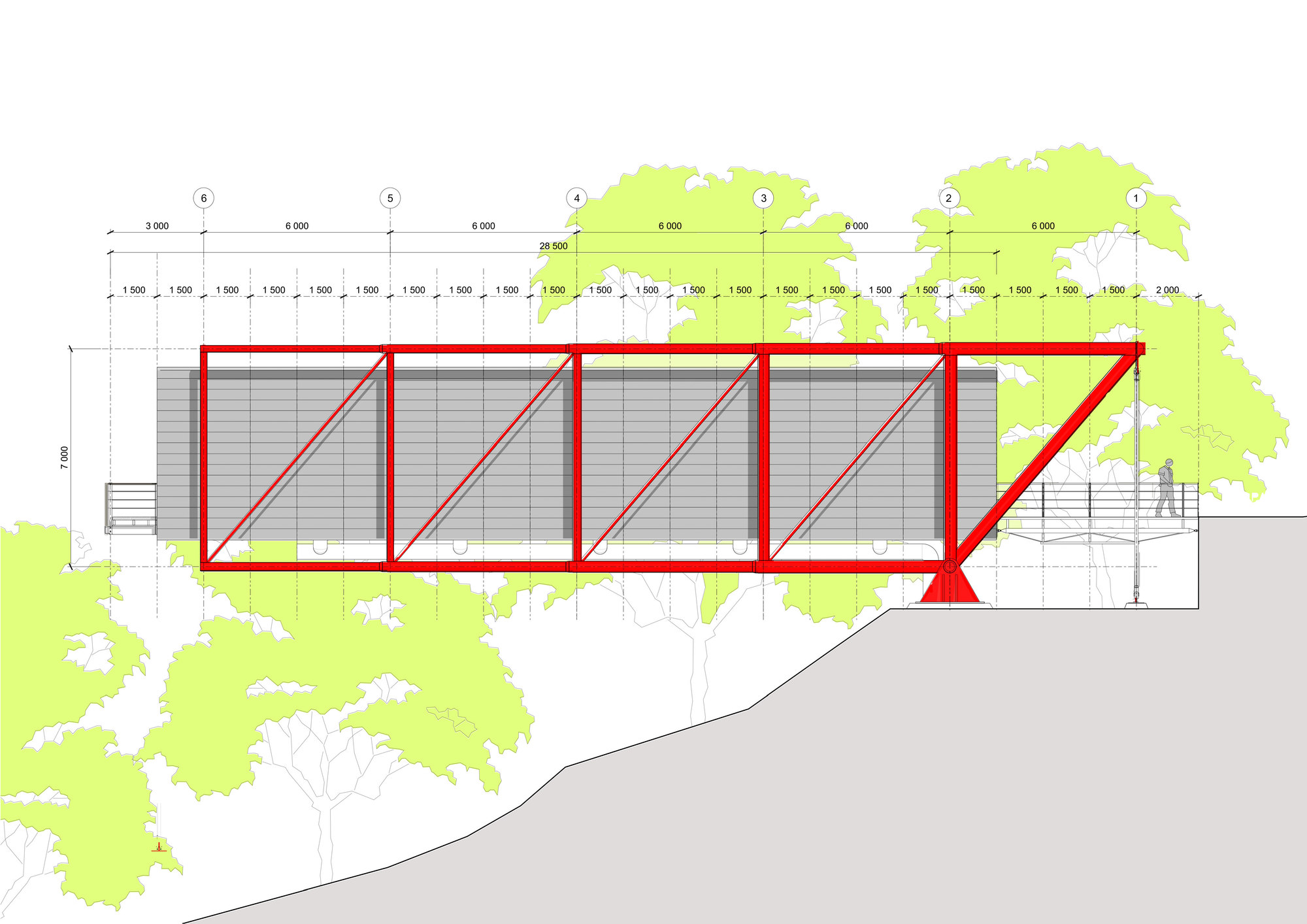 공간은 아직 계획되지 않은 미래의 전시회에 신축적으로 대응할 수 있어야 했고, 골조는 이 지역의 지진 활동에 견딜 수 있을 만큼 유연해야 했다. 그래서 교량 수준의 설계와 시공 기술을 필요로 했다고 한다. 짧은 브리지를 건너서 드나들 수 있는 이 갤러리는 네 지점만이 지면에 닿도록 설계되었다. 캔틸레버 구조를 만들기 위해, 두 세트의 텐션 로드tension rods와 두 개의 피벗 조인트pivot joints가 사용되었다. 구조물을 지면에 고정하는 입구의 케이블(텐션 로드)은 기온 변화에도 민감하게 수축 및 팽창을 한다고 한다. 그리고 갤러리 바닥도 신축성 재료로 시공되었다.